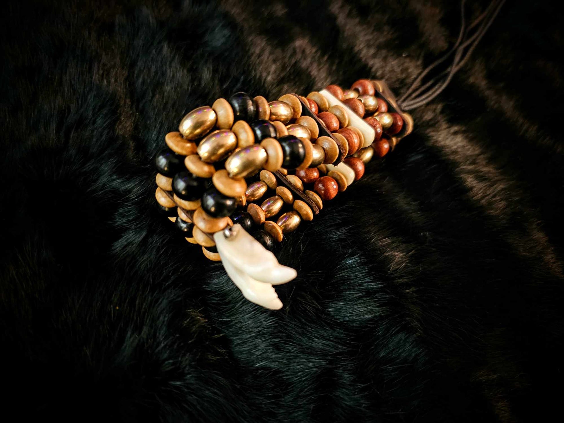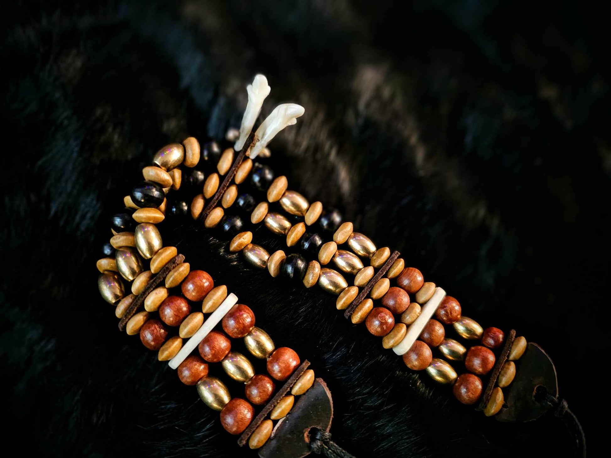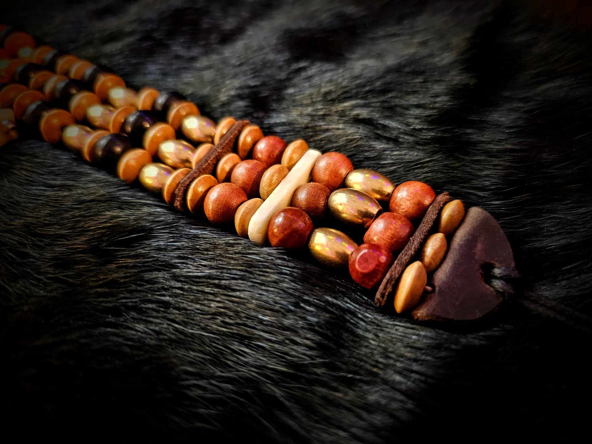 Handmade wood, brass, bone, and horn bead, 2 wolf teeth, leather, and waxed cotton cord tie. Beaded length 10.5", 34.5" total length.