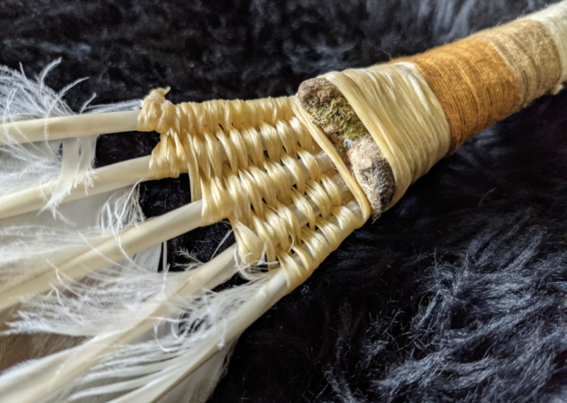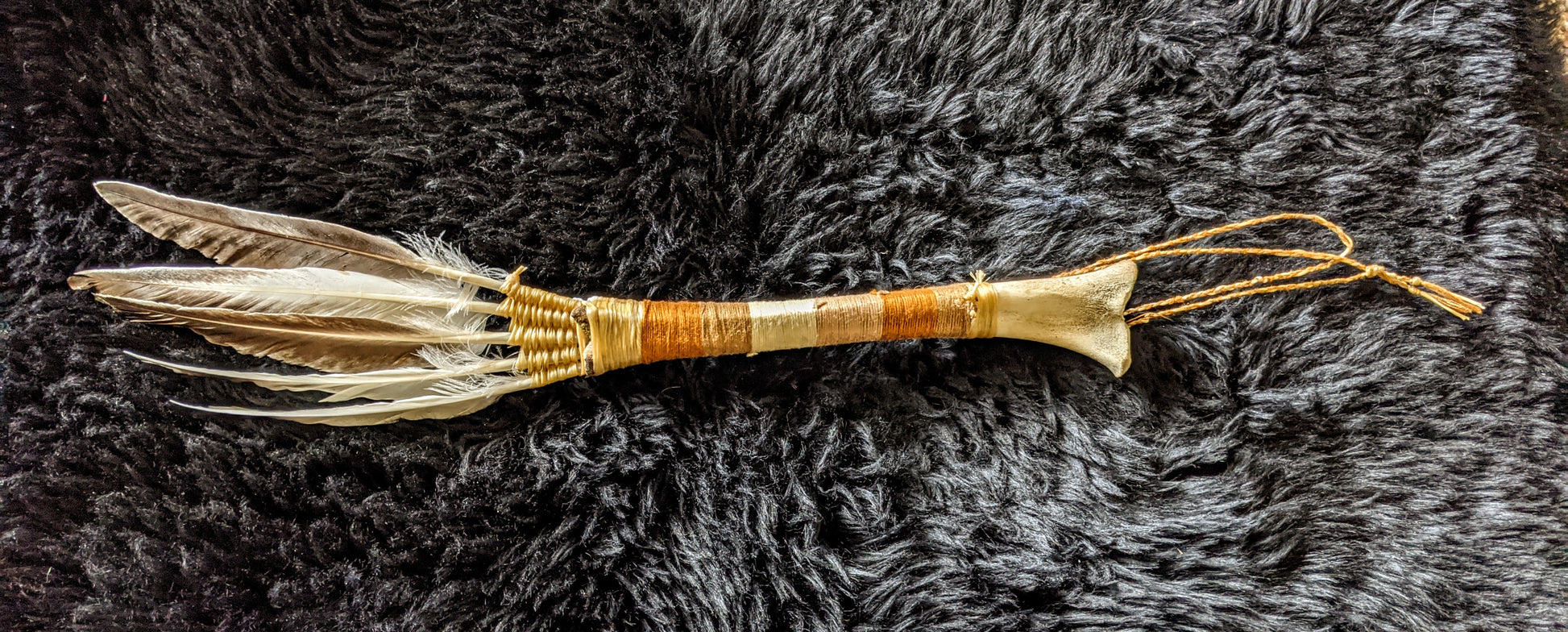 15" total length, 7" feather length. Smoke wand made with deer bone and duck feathers, wrapped in sinew and cotton cord. Works great to move smoke around from smudges/resins. Naturally foraged components.