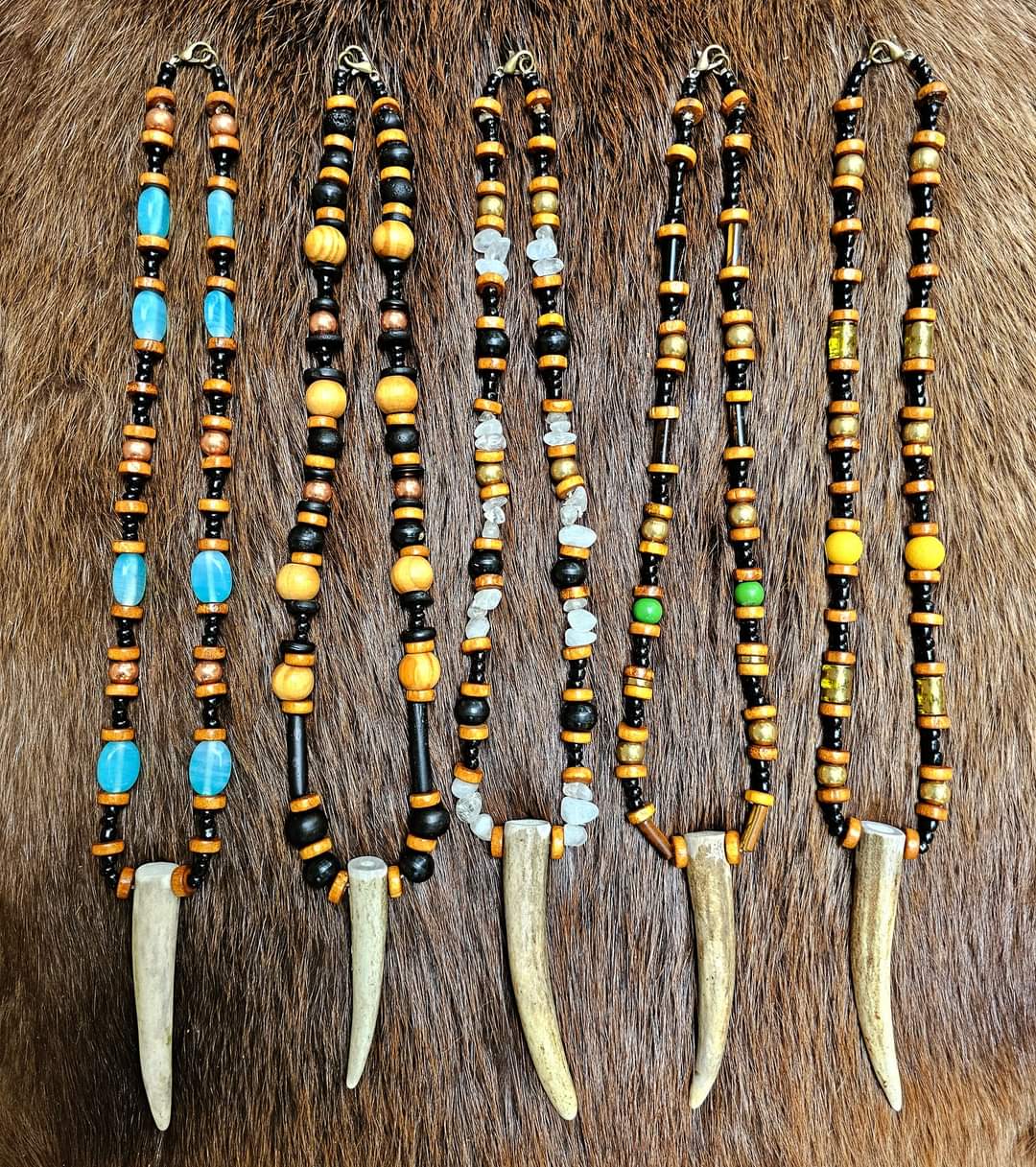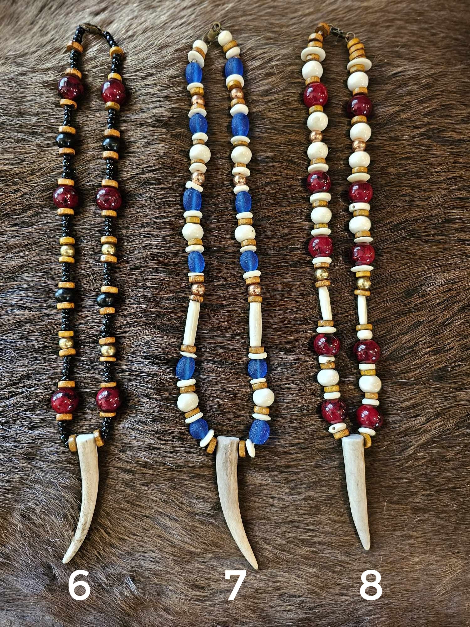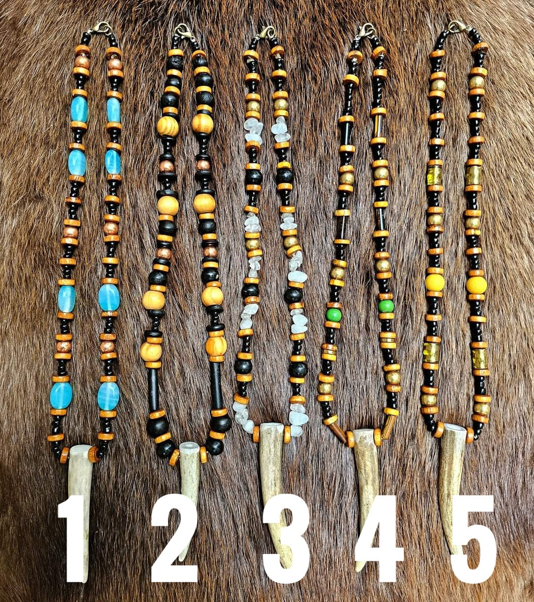 Handmade elk antler pendants with unique beads featuring copper, brass, horn, bone, wood, and glass. Please see numbered photo for options. Some