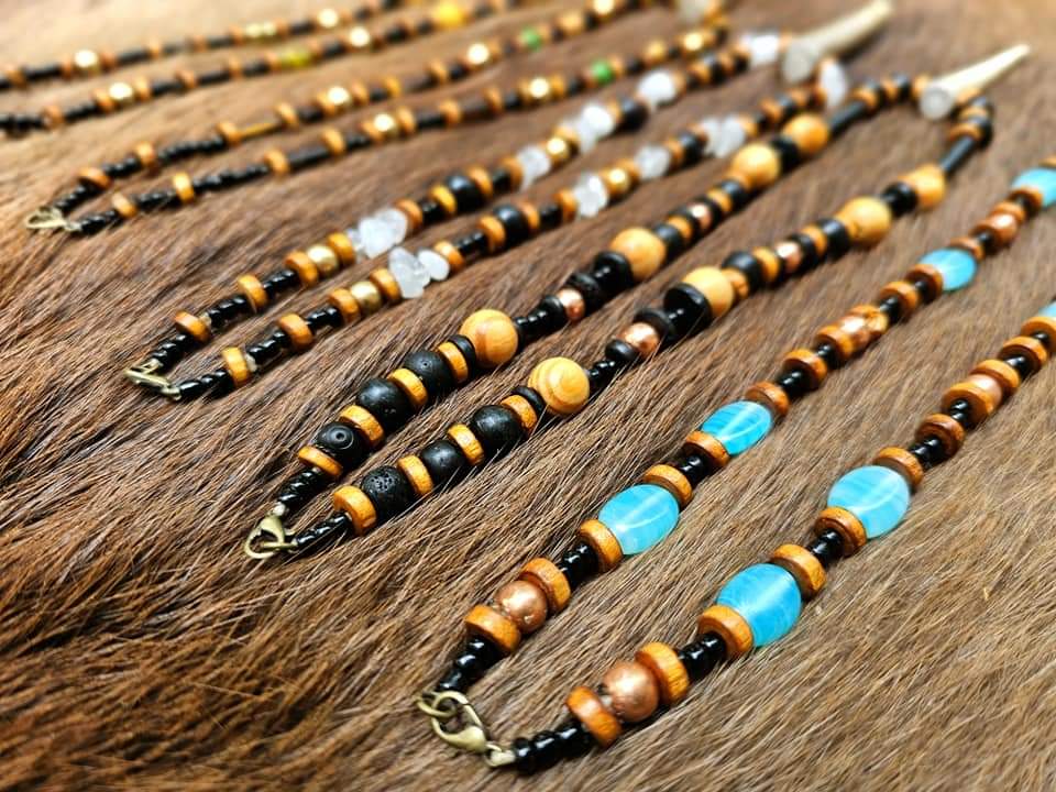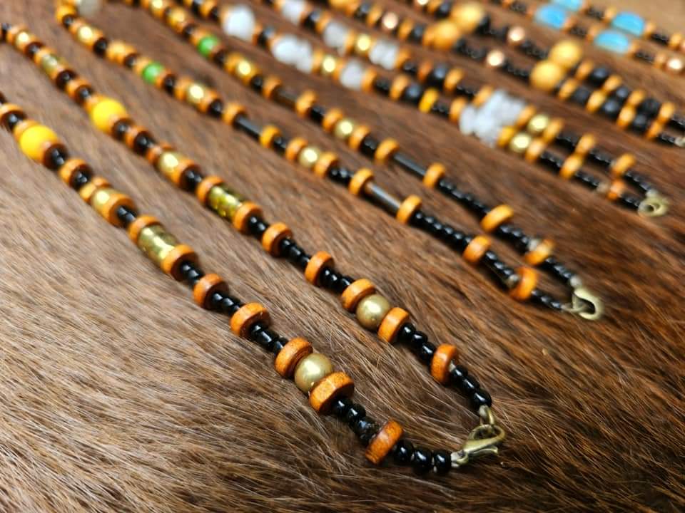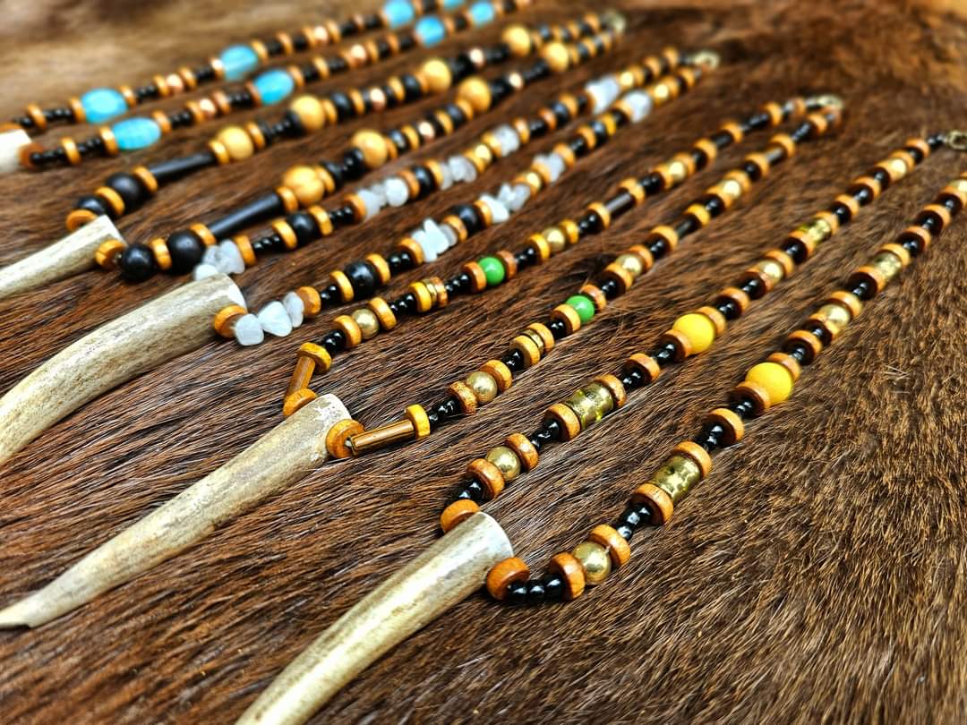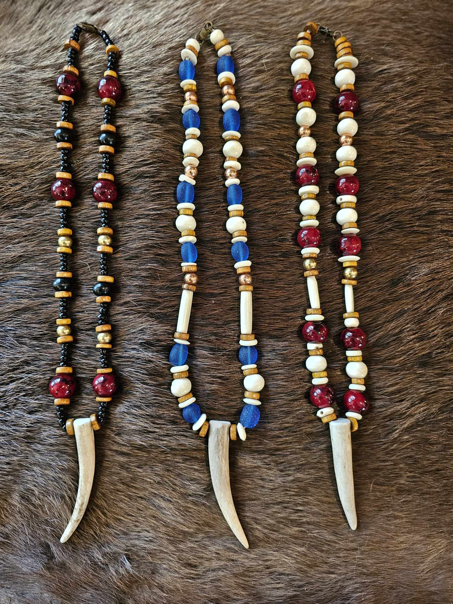 Handmade elk antler pendants with unique beads featuring copper, brass, horn, bone, wood, and glass. Please see numbered photo for options. Some