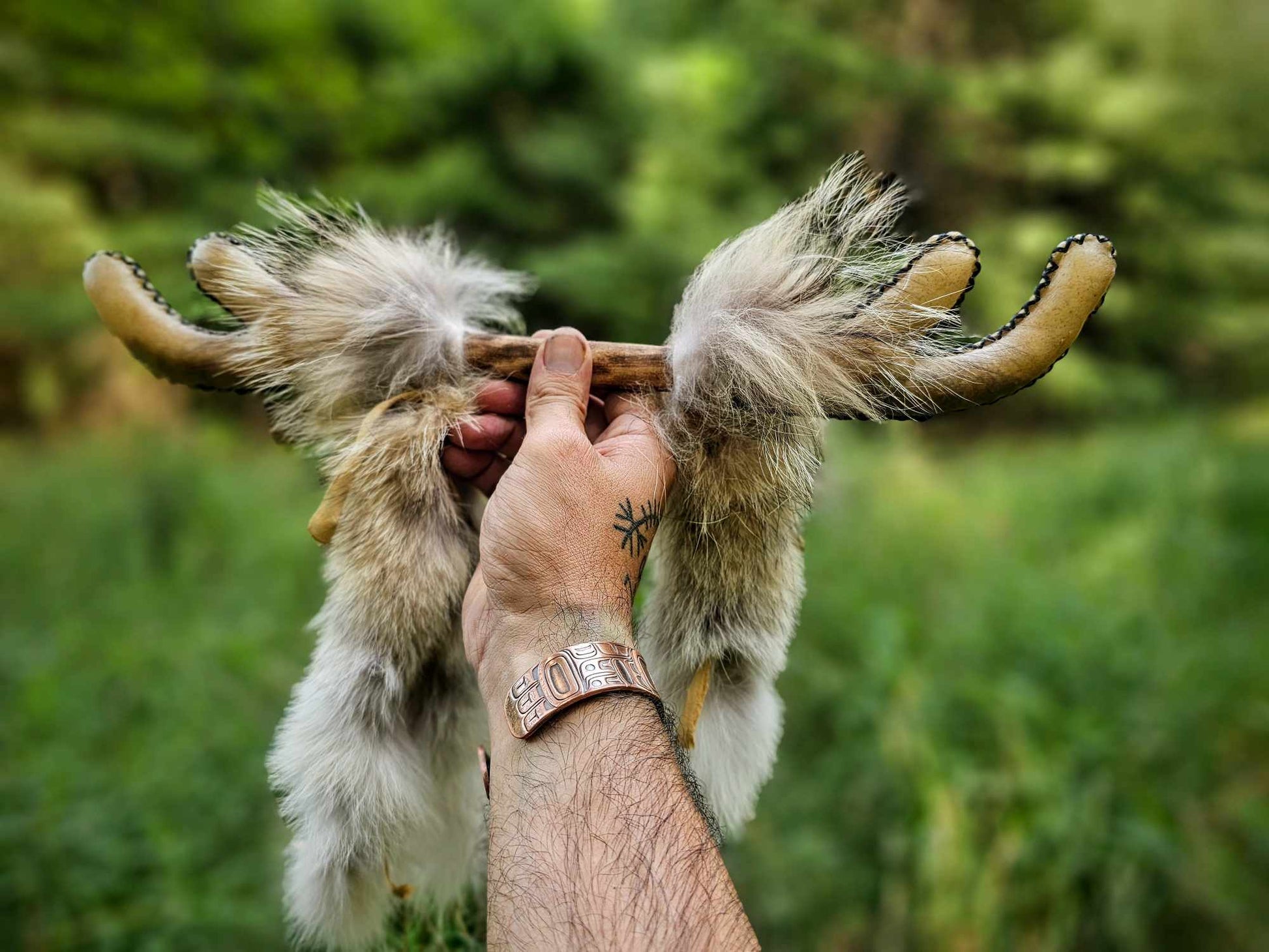 A ceremonial or ritual percussion two-sided shaker. Antler shaped Elk hide rattle heads with Buckwheat, Poplar wood handle, and Coyote fur strips with Buckskin ties.