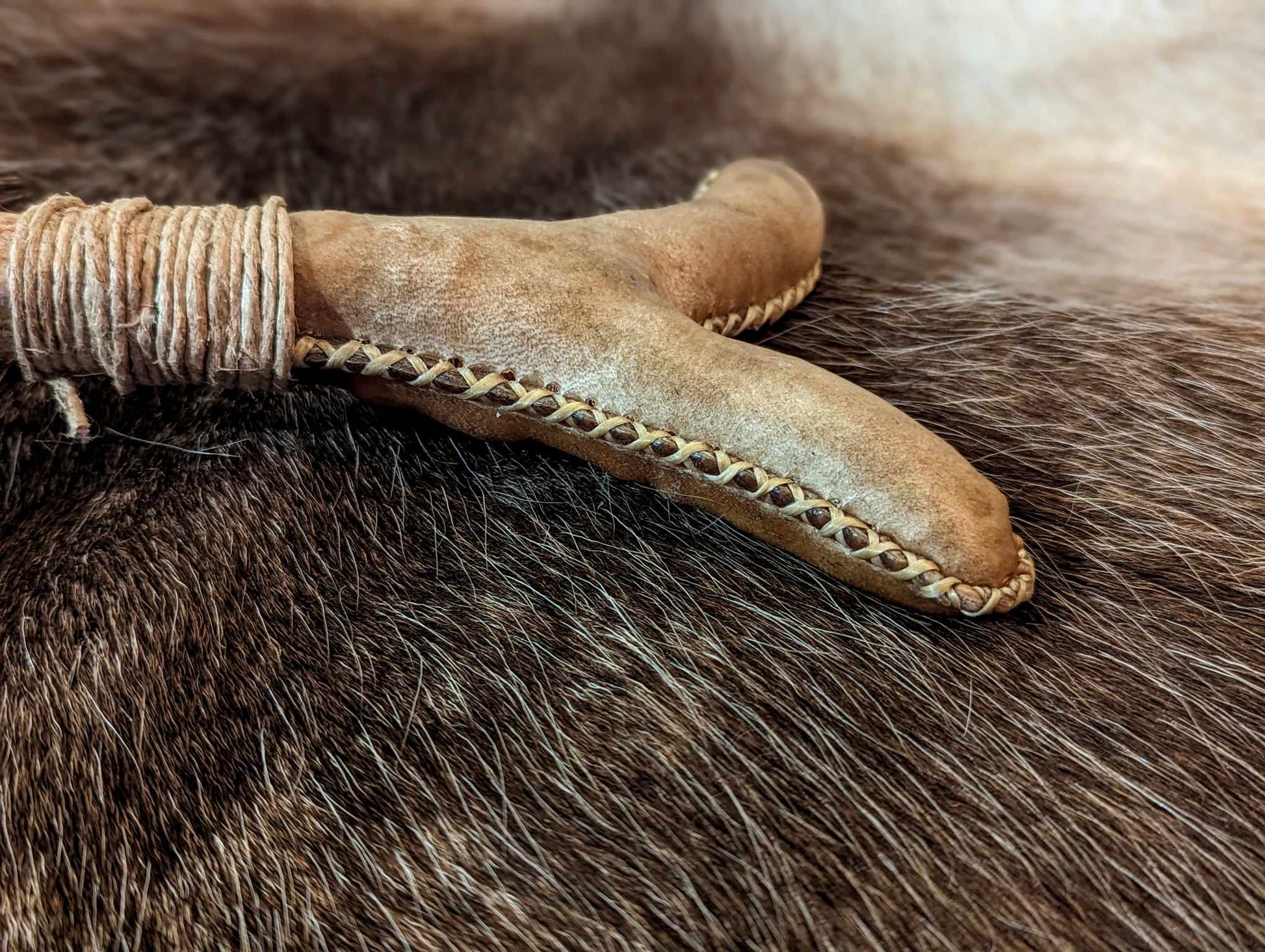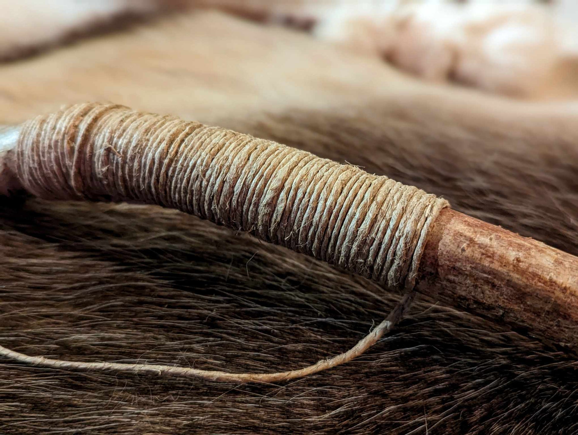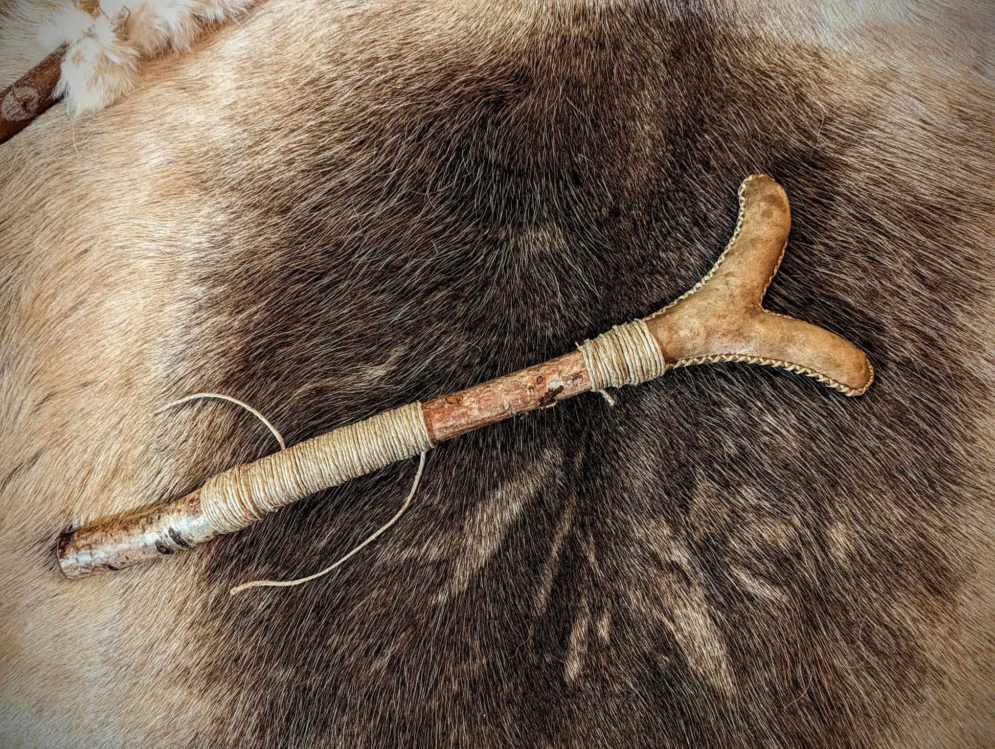 'Snake People, Medicine Talk' medicine rattle, Birch branch, Elk Skin, Hemp, and Buckwheat