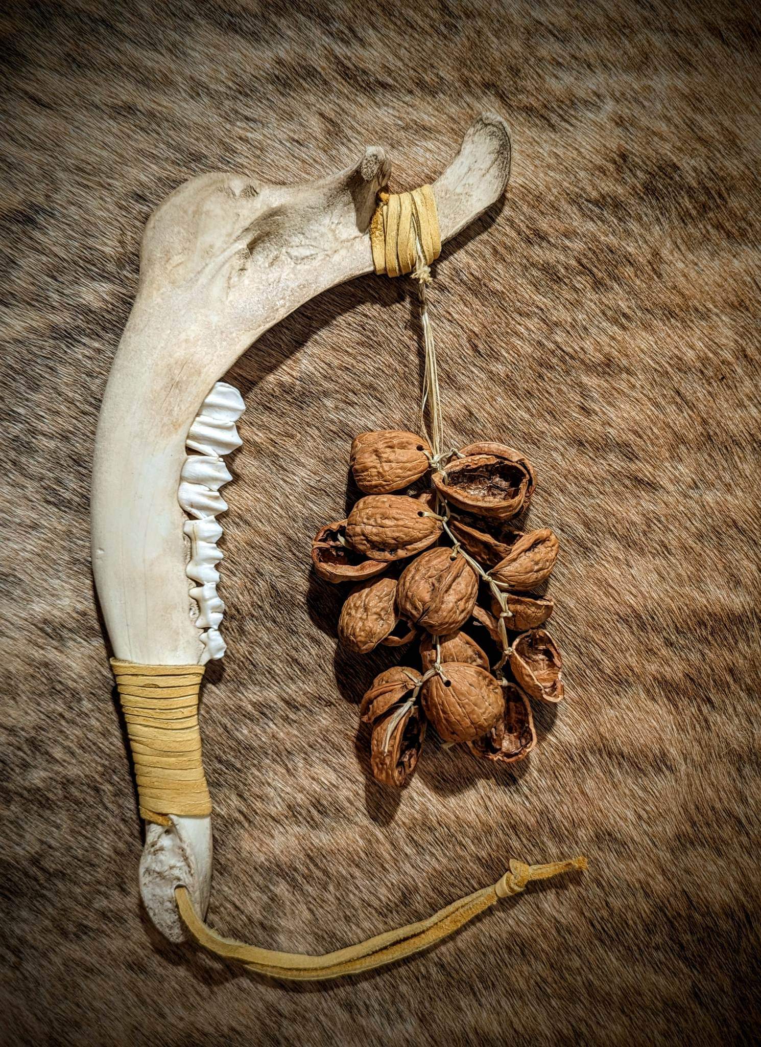 Shaman rattle, hand crafted from an elk jaw bone with teeth, with an elk leather grip. Tied with sinew. Walnut shells provide sound. 13" tall.