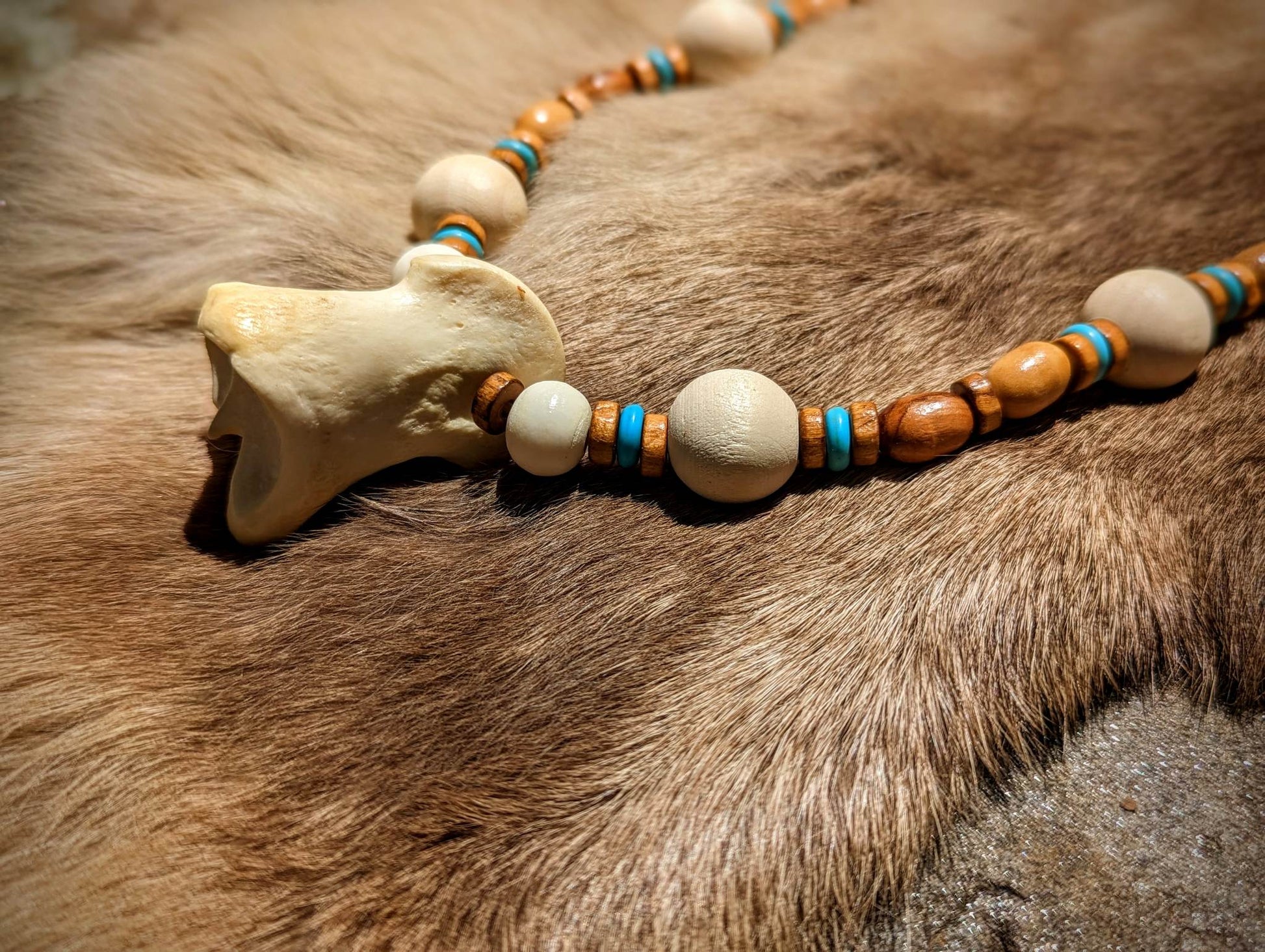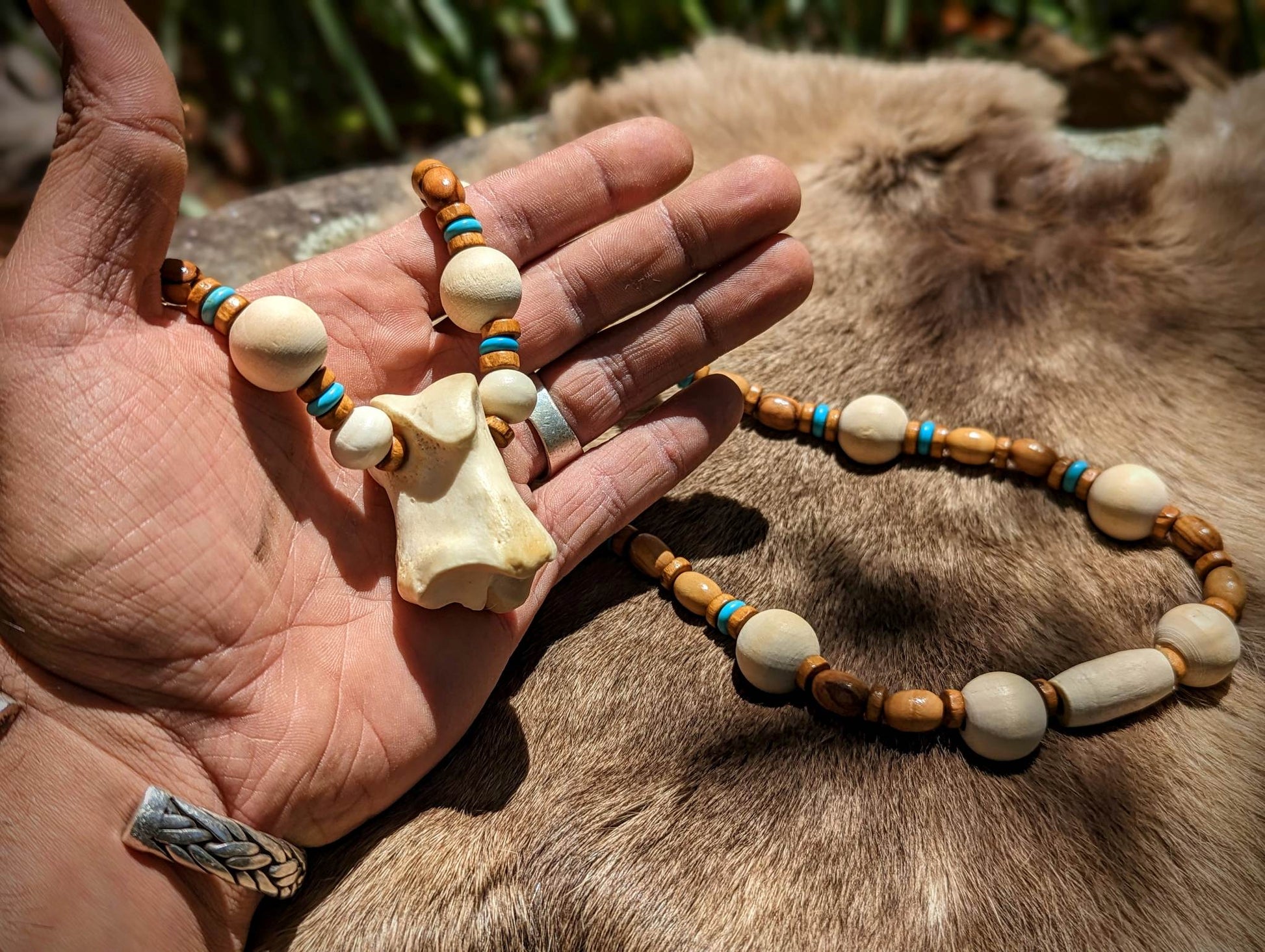 Pendant is crafted from elk knuckle bone. Necklace is strung with olive wood beads and turquoise discs on a sinew cord.