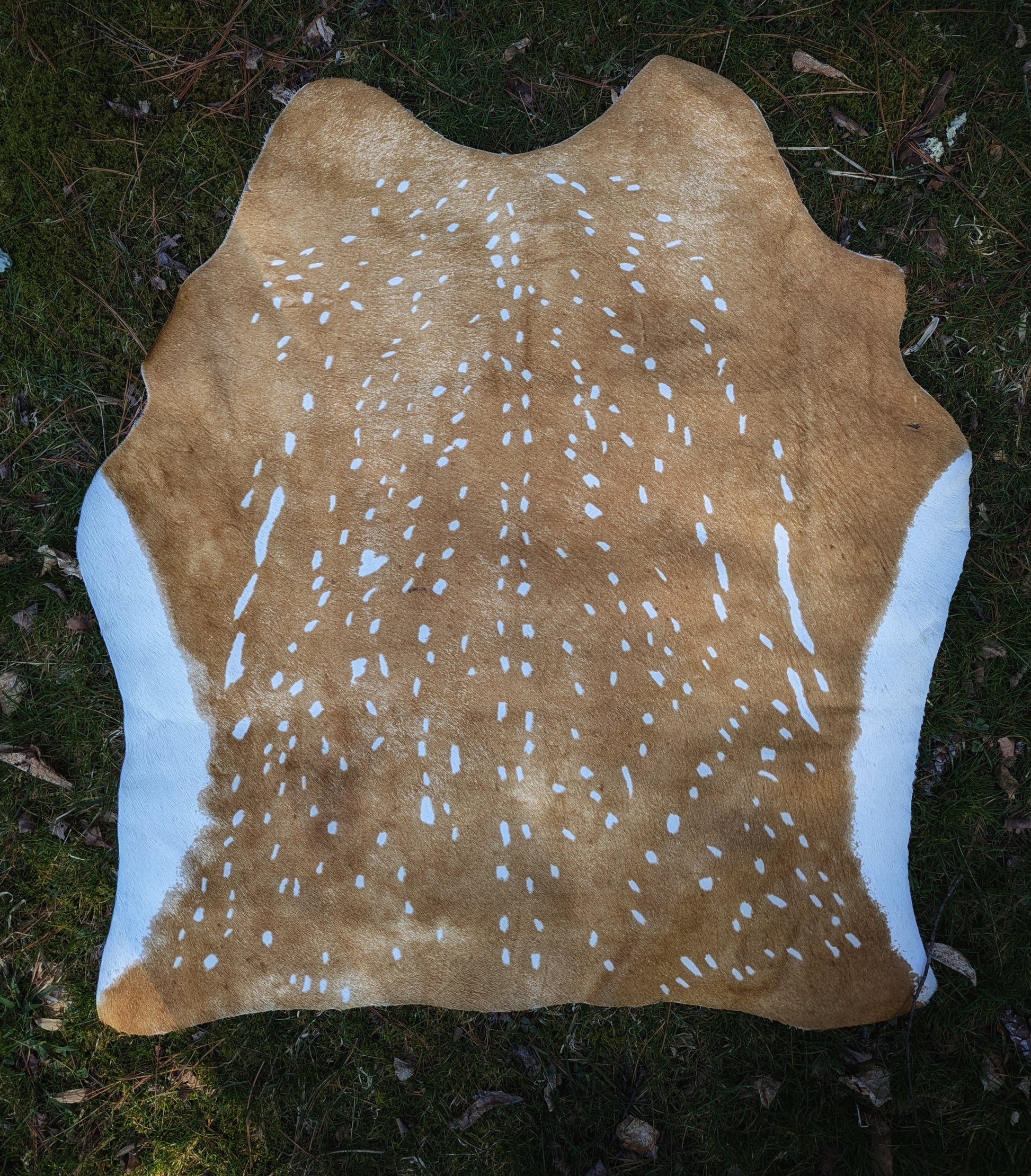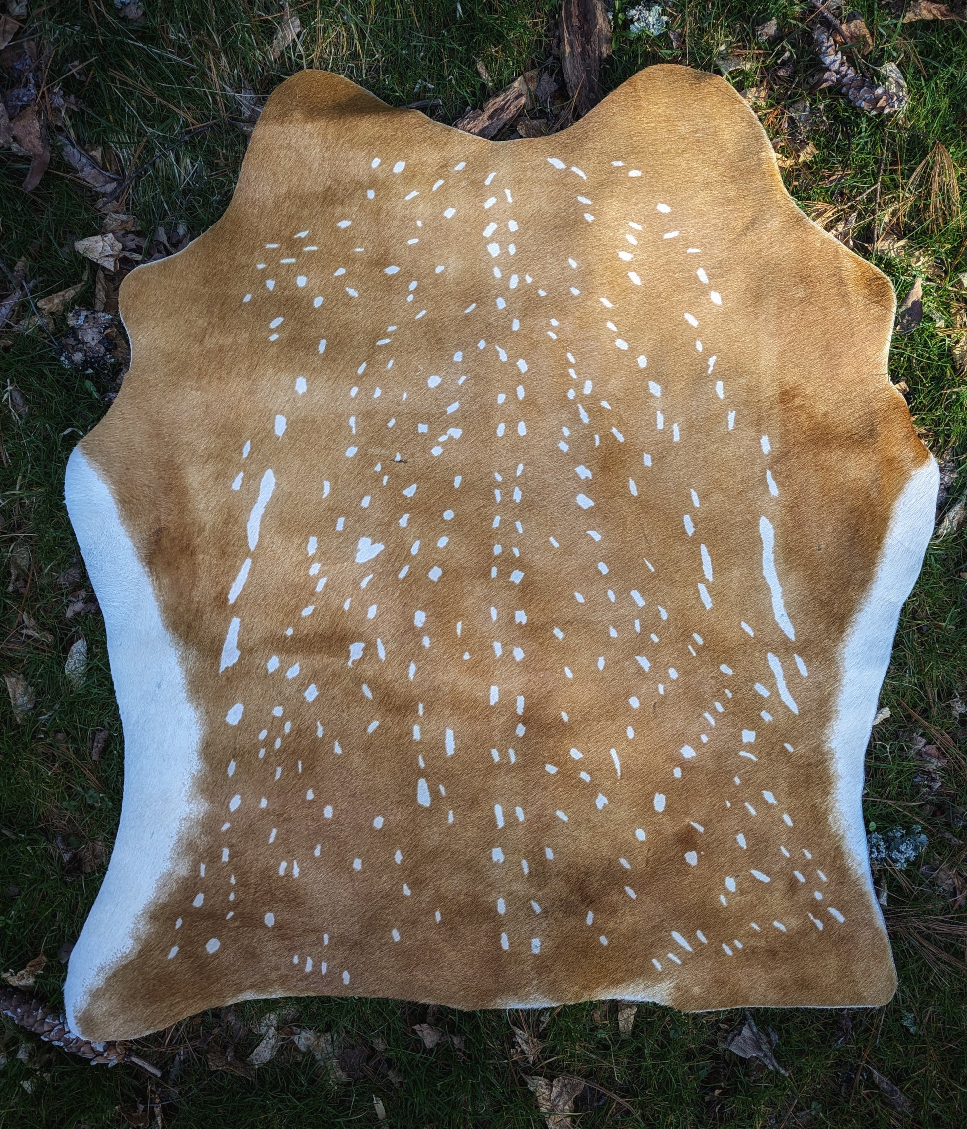 Soft yet durable cowhide, dyed in a spotted fawn pattern for the appearance of a young deer or axis deer. These cowhides are a by-product of the beef industry, cut from quality hides that are unable to be used whole for larger applications, making this a good use of the whole animal.