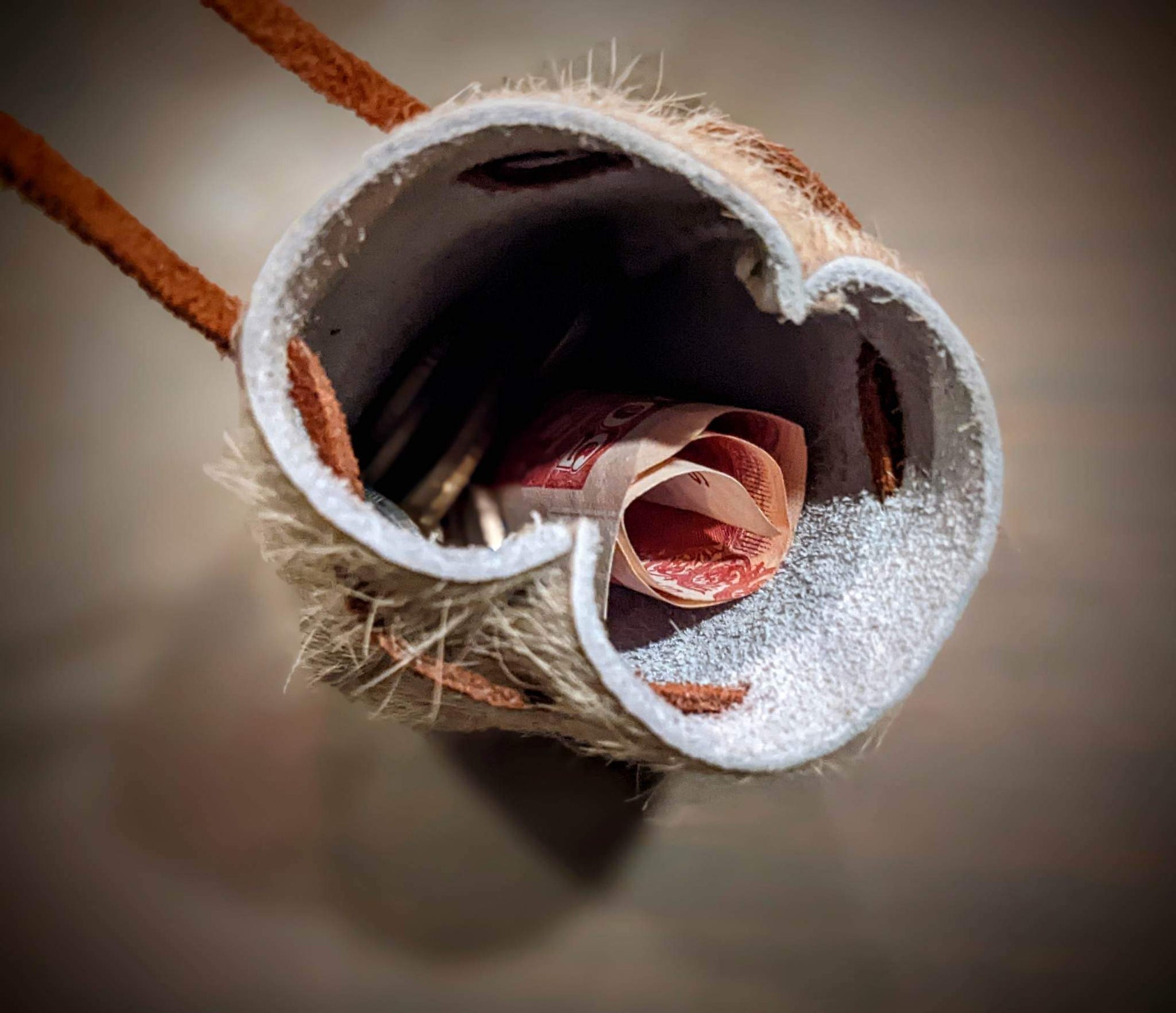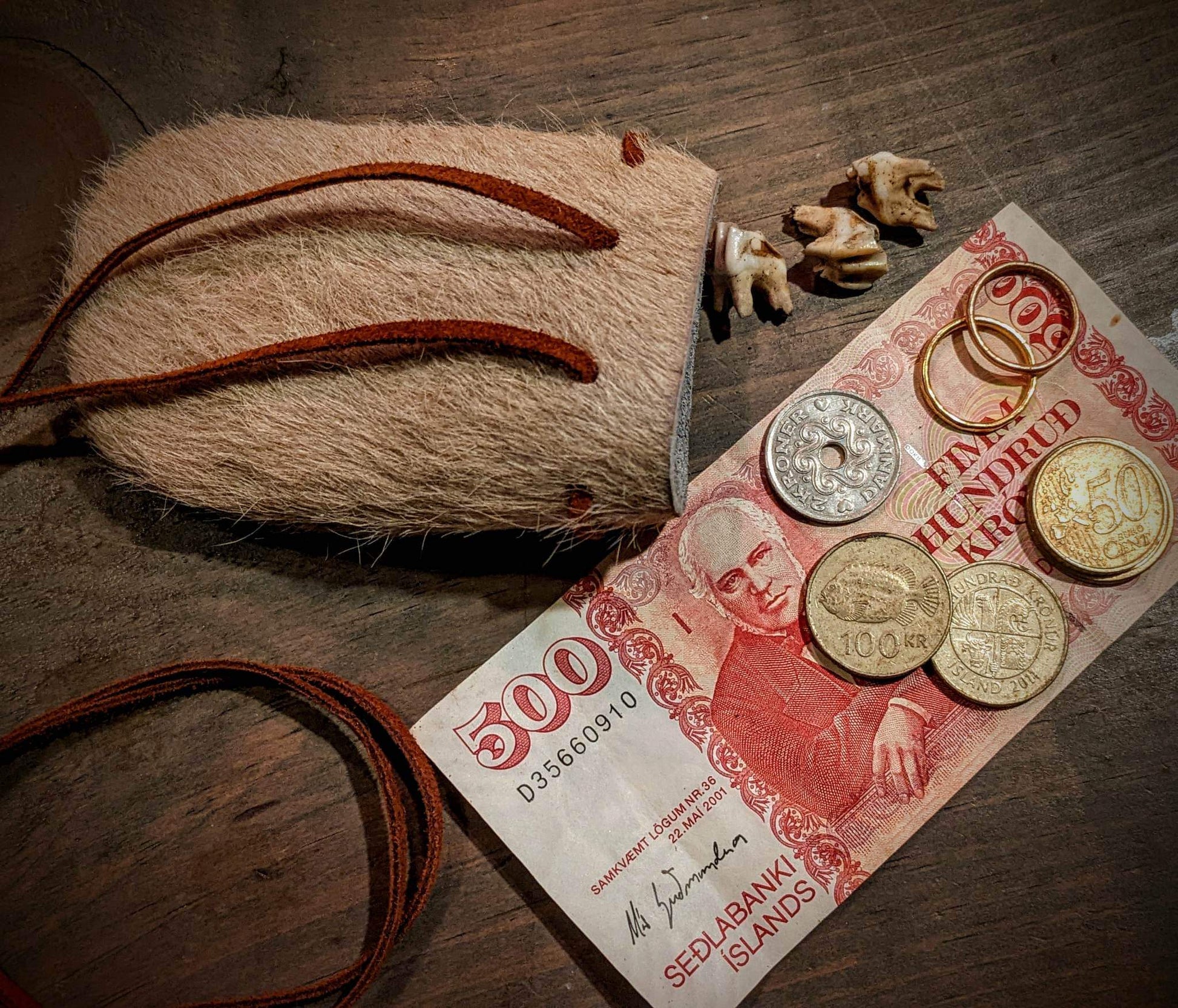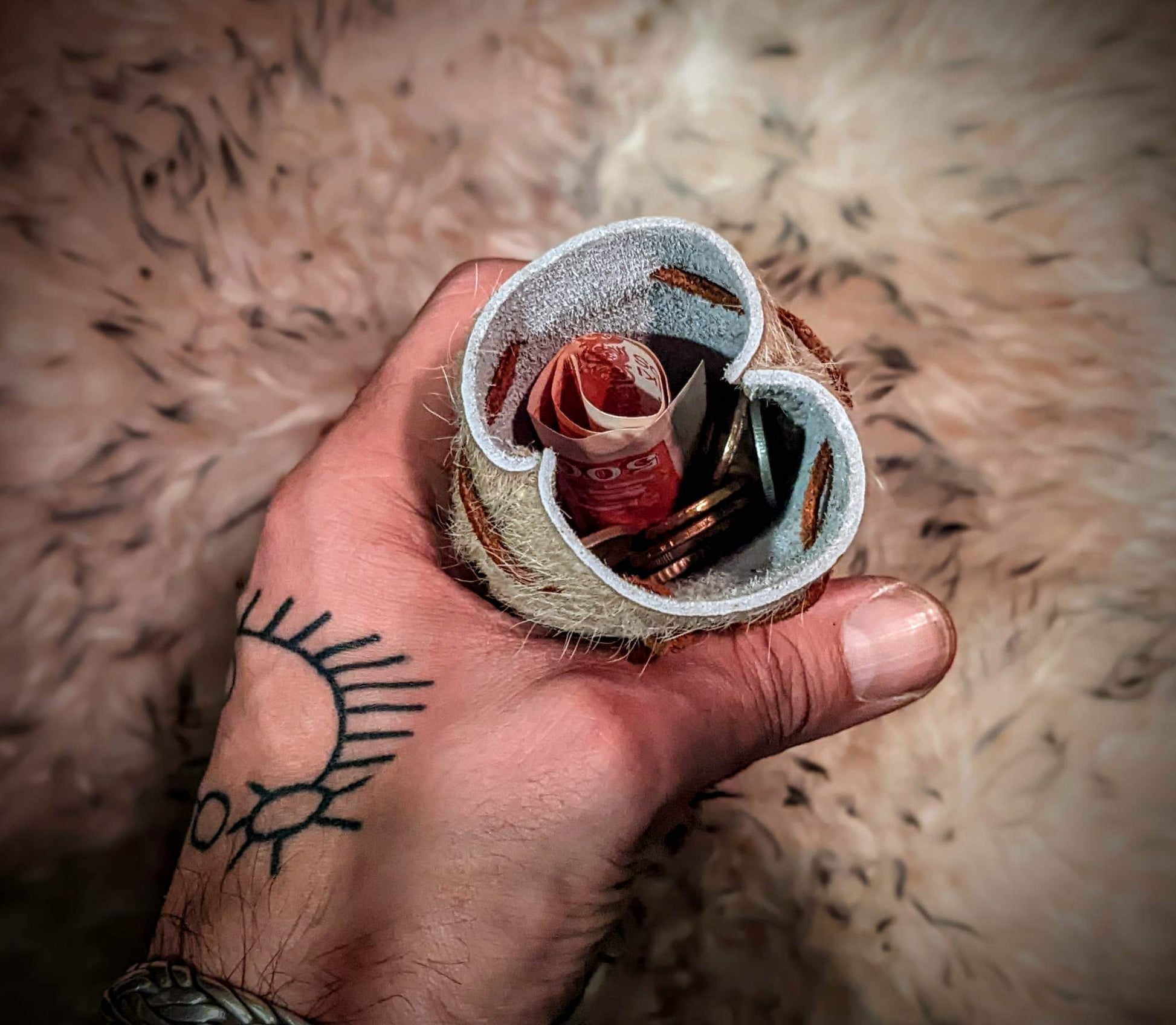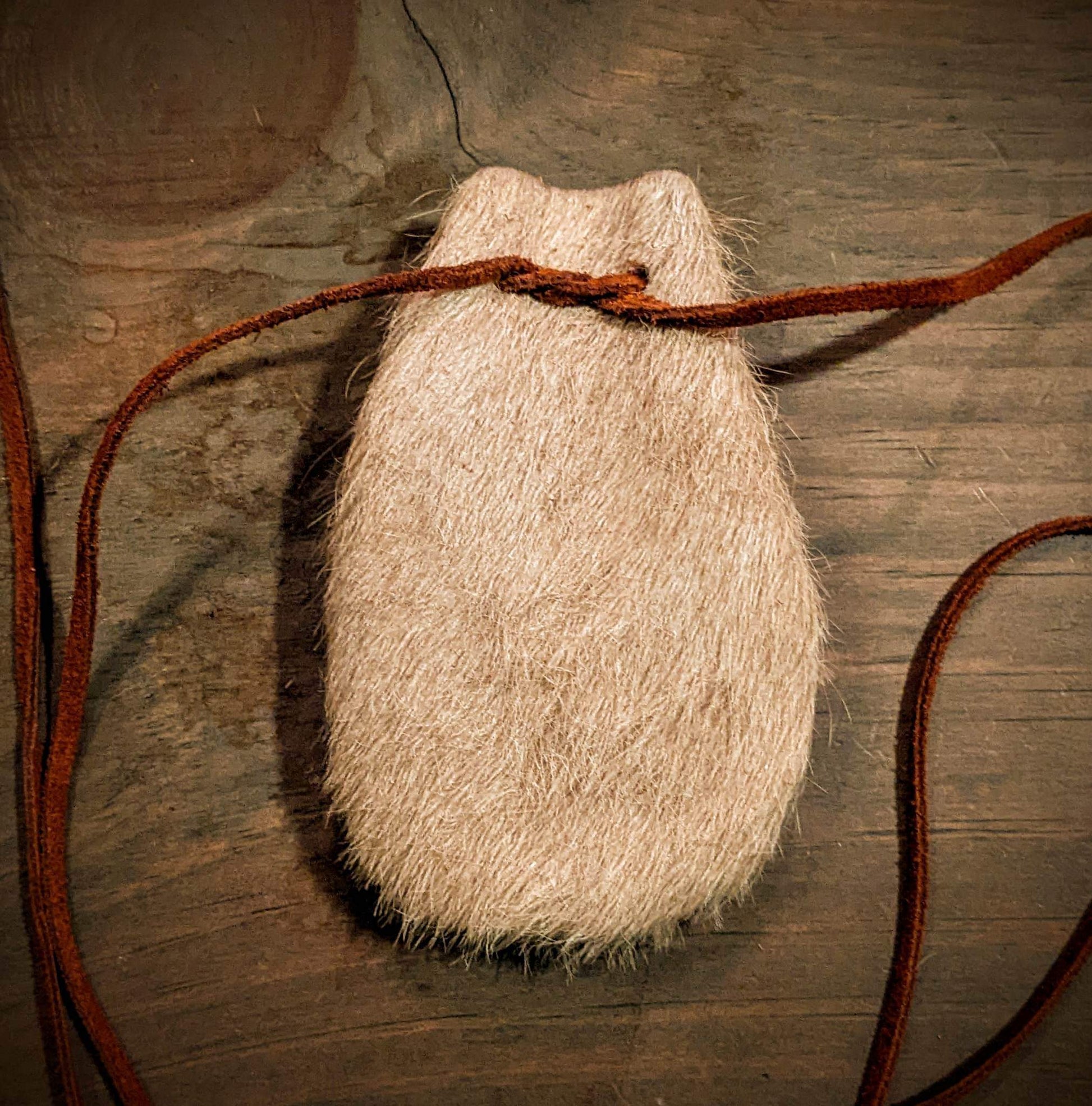 3" wearable hair-on cow leather "Fehu" money bag/coin purse. Hair-on cow hide and leather cord to be worn around the neck or tied to a belt. Hand cut and sewn with sinew.