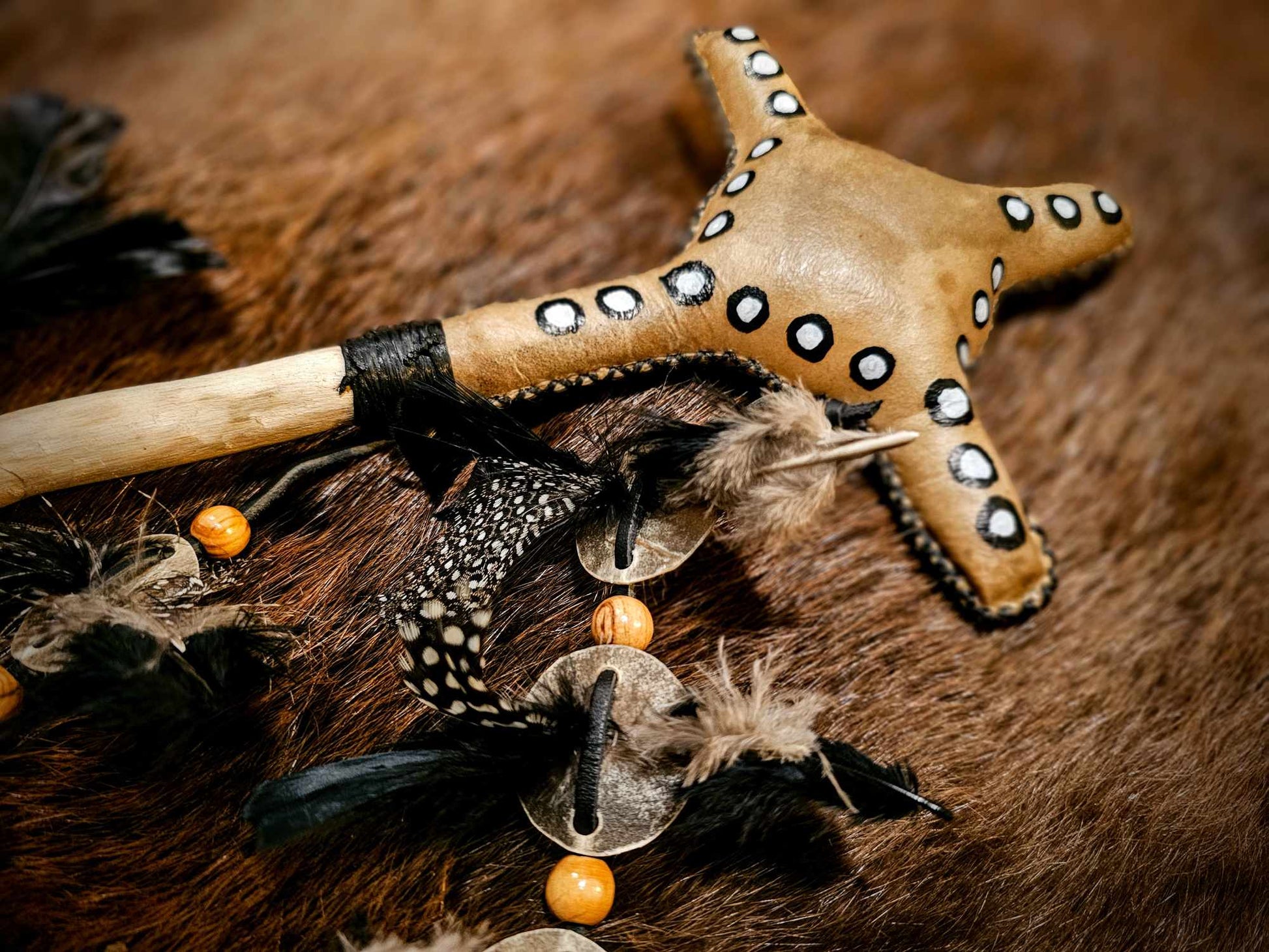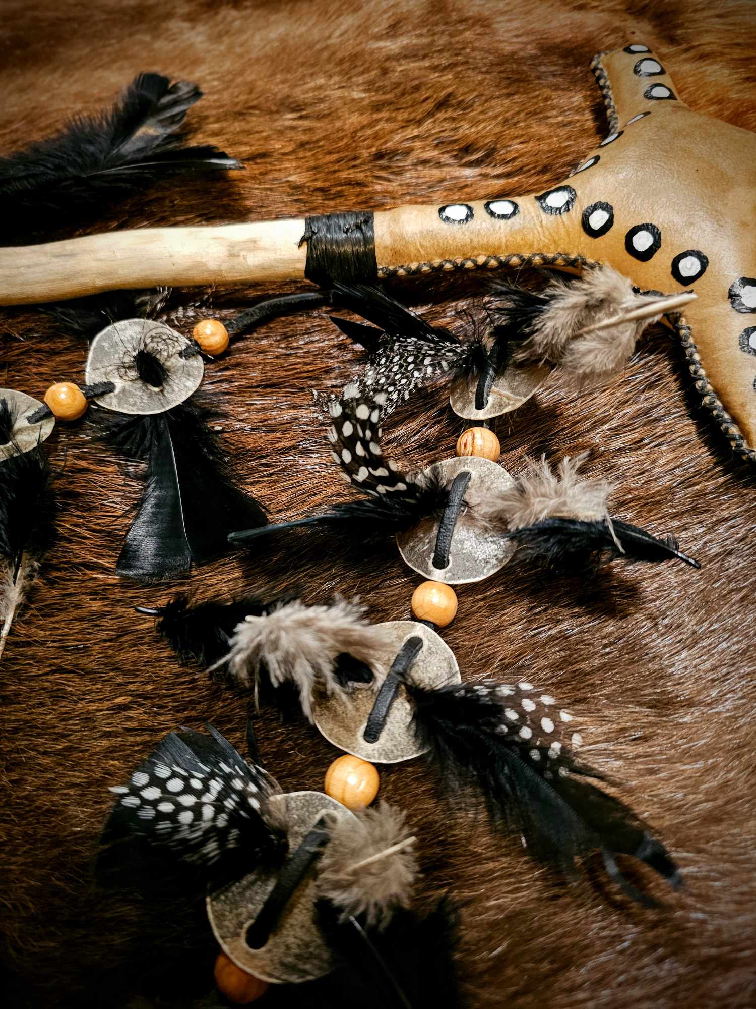 'Four Winds' Elk Skin Medicine Rattle With Spotted Guinea Feathers
