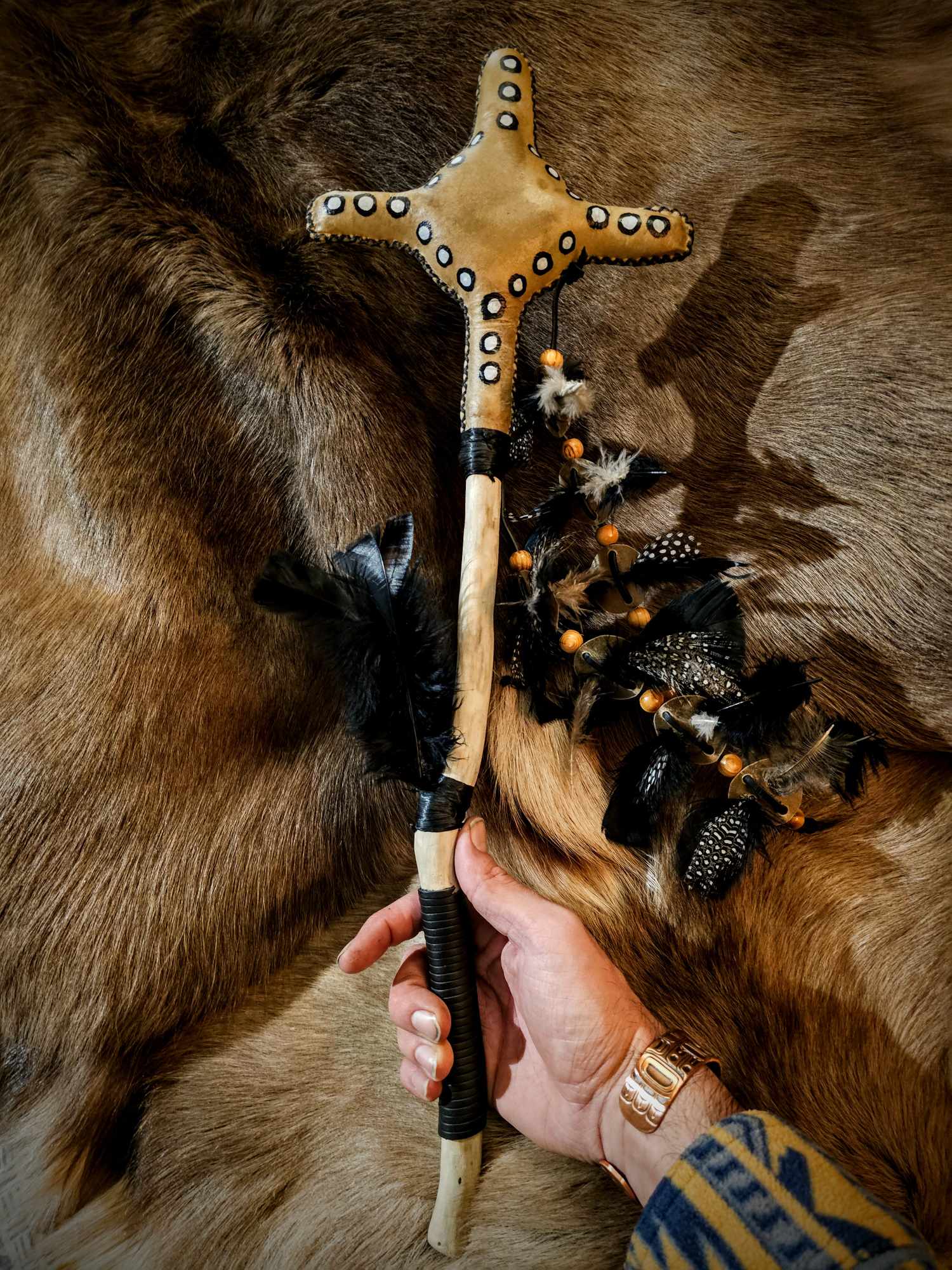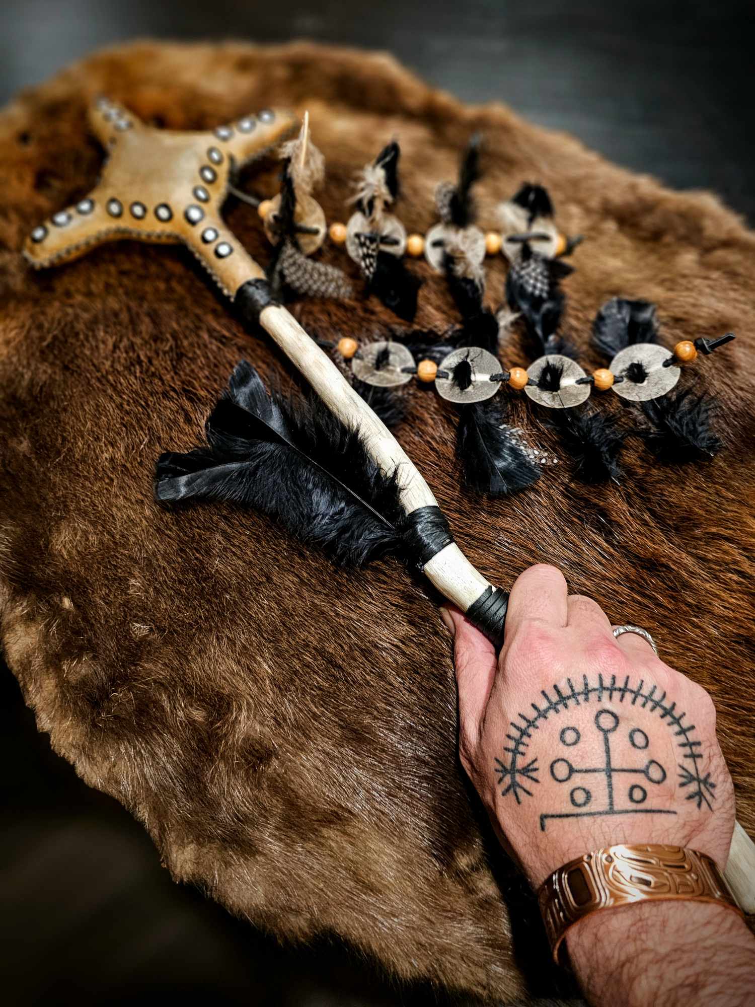 Hand cut and sewn Elk Skin rattle head with Wild Rice filler. Black Locust handle with leather wrap hand hold. Two tails of leather cord through eight Elk rawhide medallions and crossed with Guinea feathers.