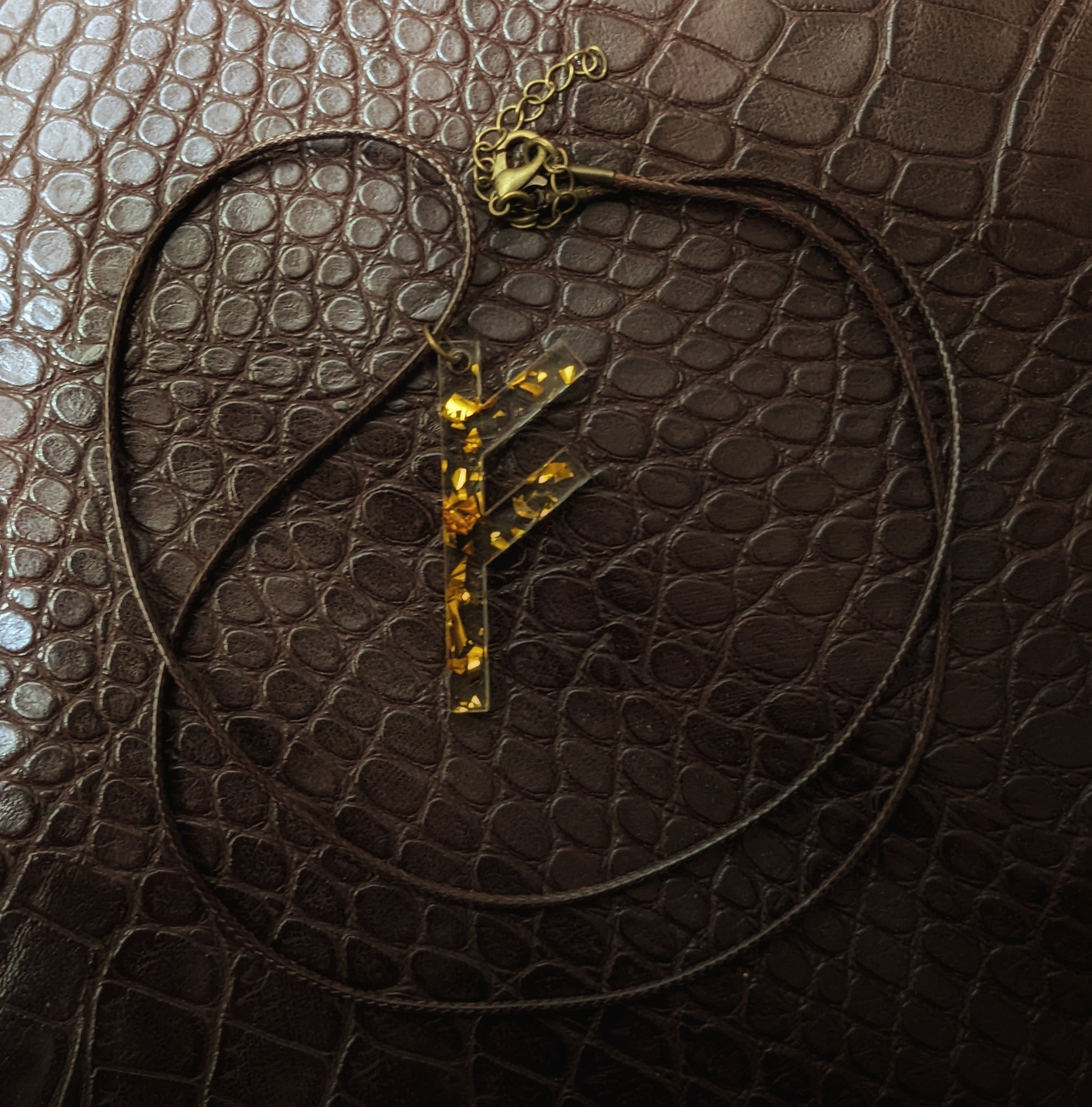 1.75" high, 1/8" thick Fehu rune for wealth and prosperity, made of clear perspective with amber gold flakes. Also represents Freya, the Norse goddess associated with love. Hangs on a waxed cotton cord.