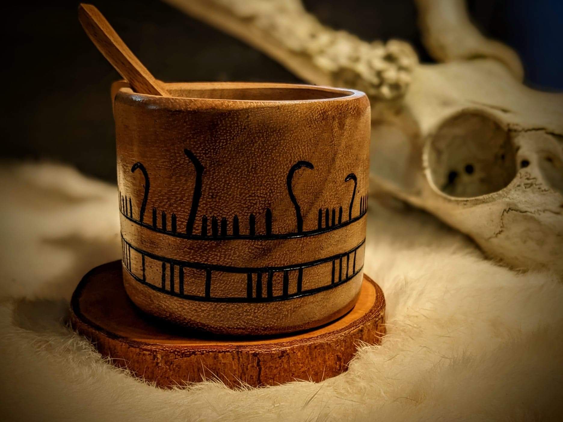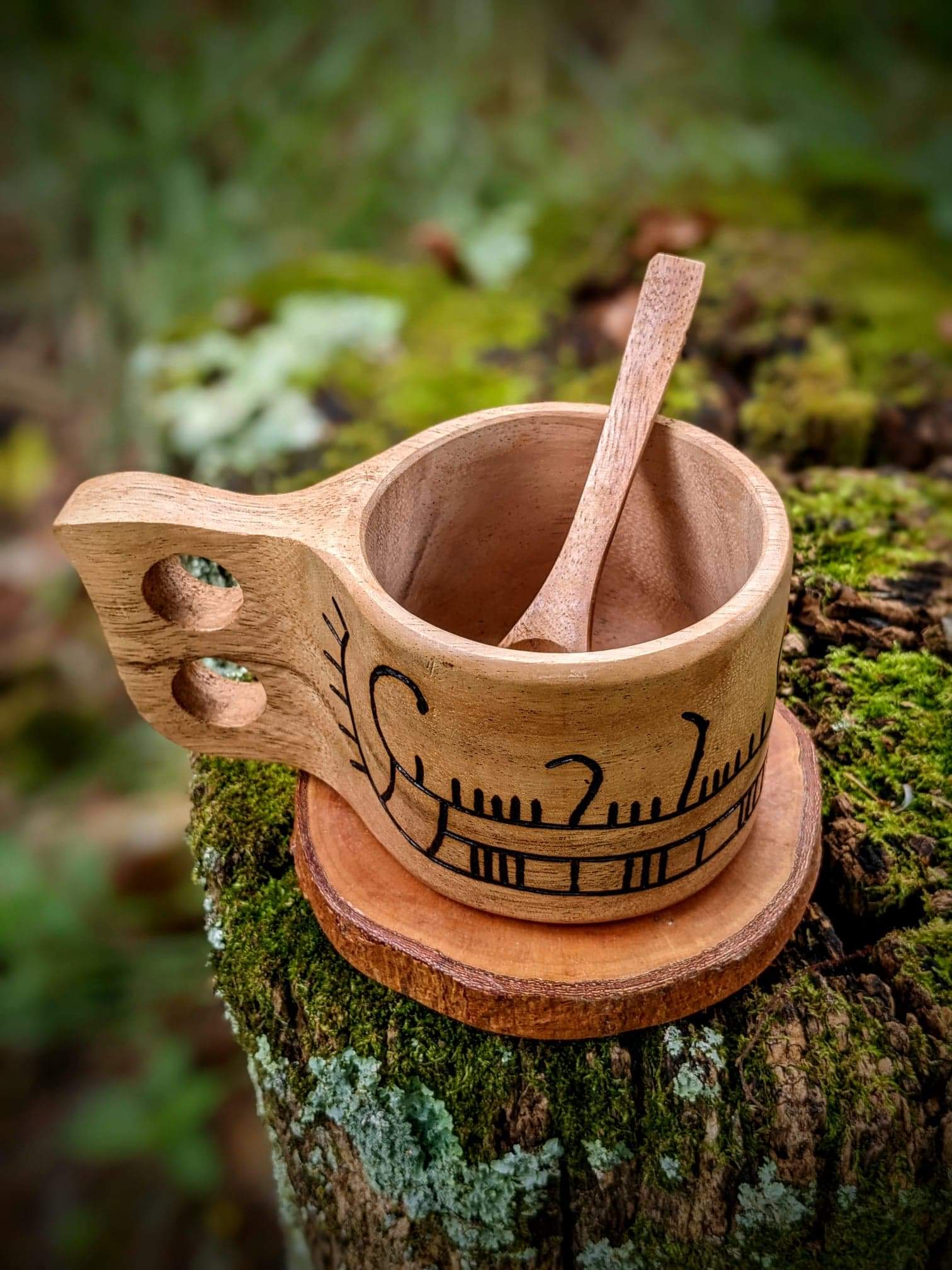 Hand burned wood kuksa with spoon and thick wood coaster. Design features a drakkar viking ship with a stag head.