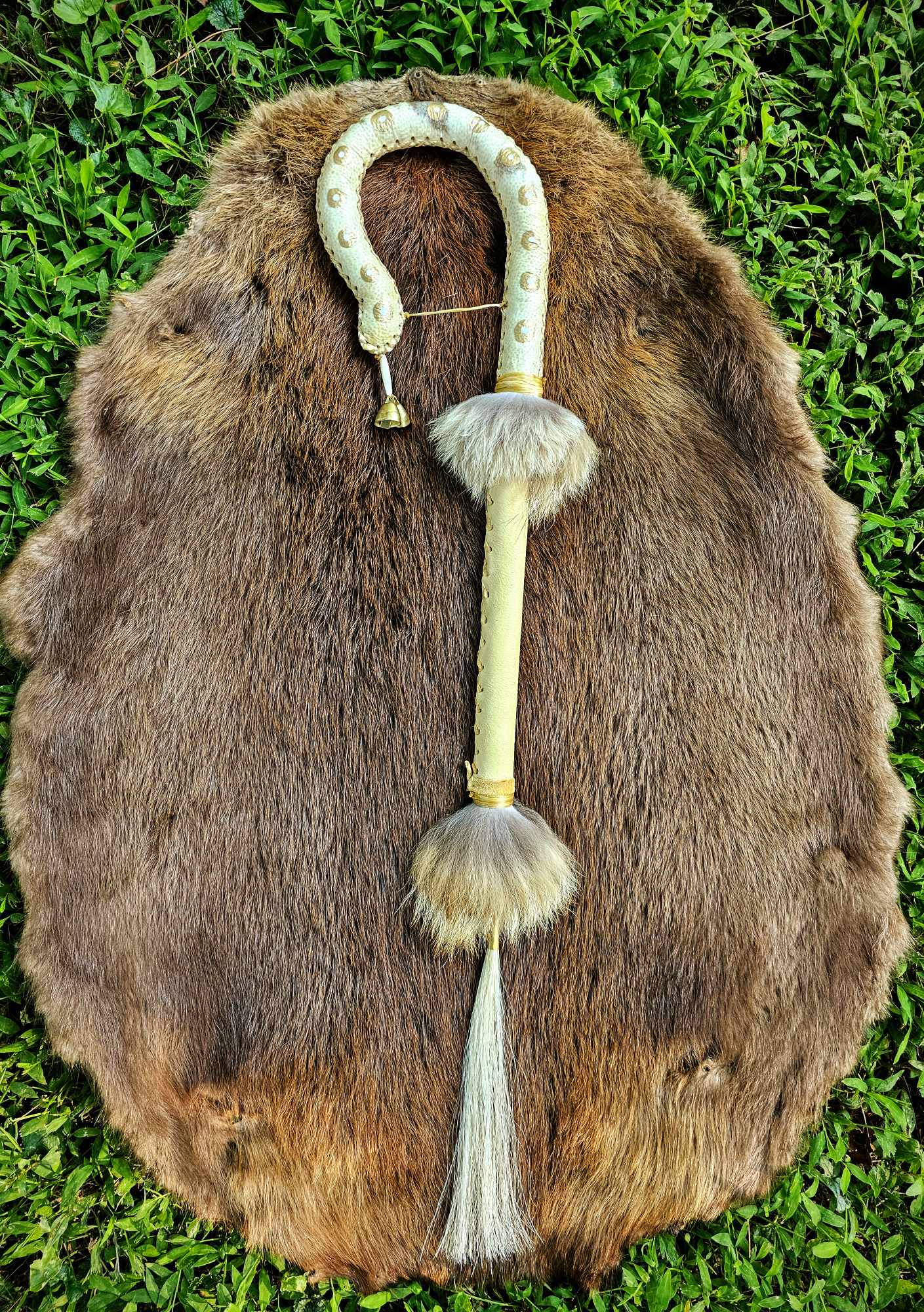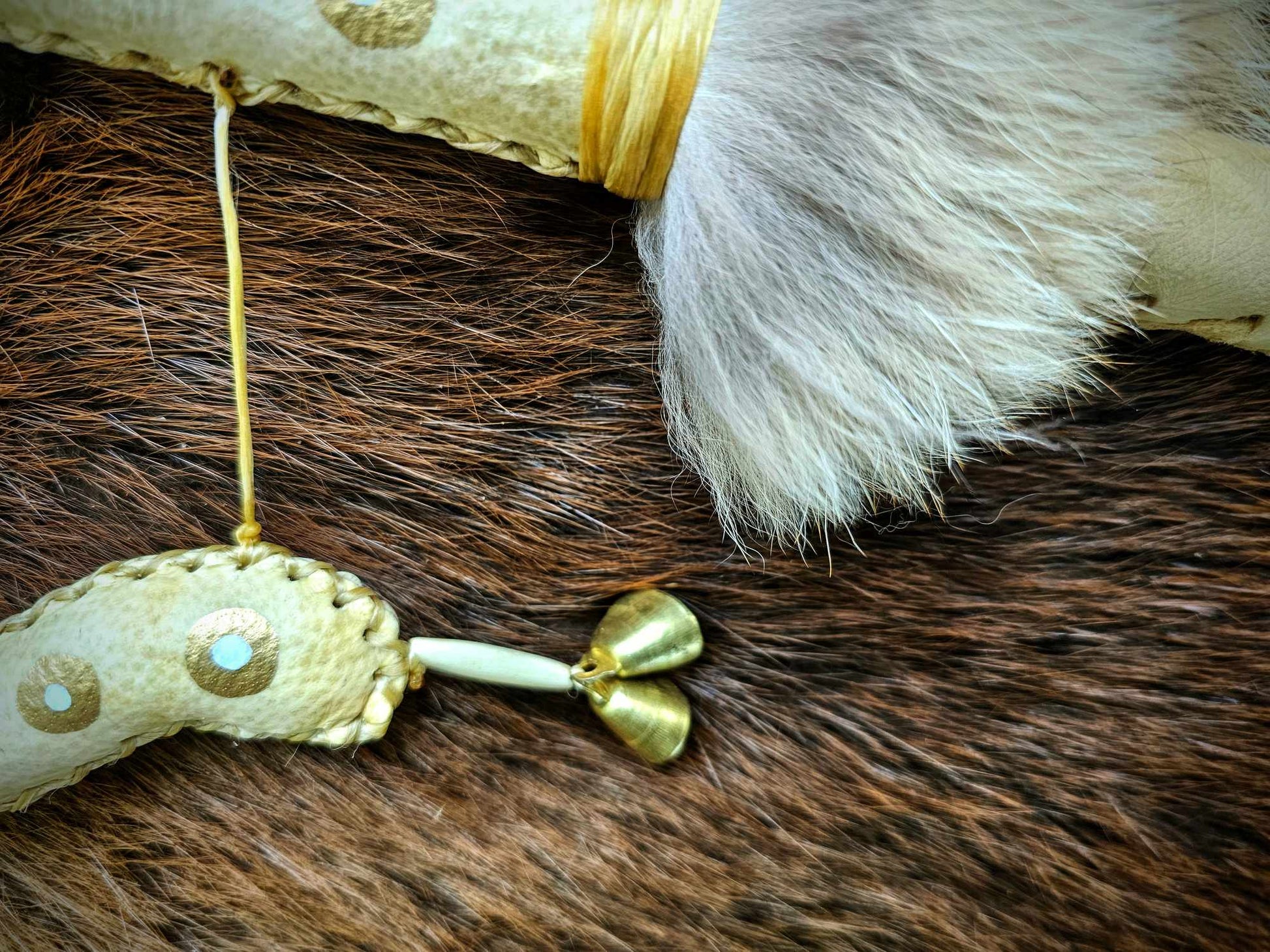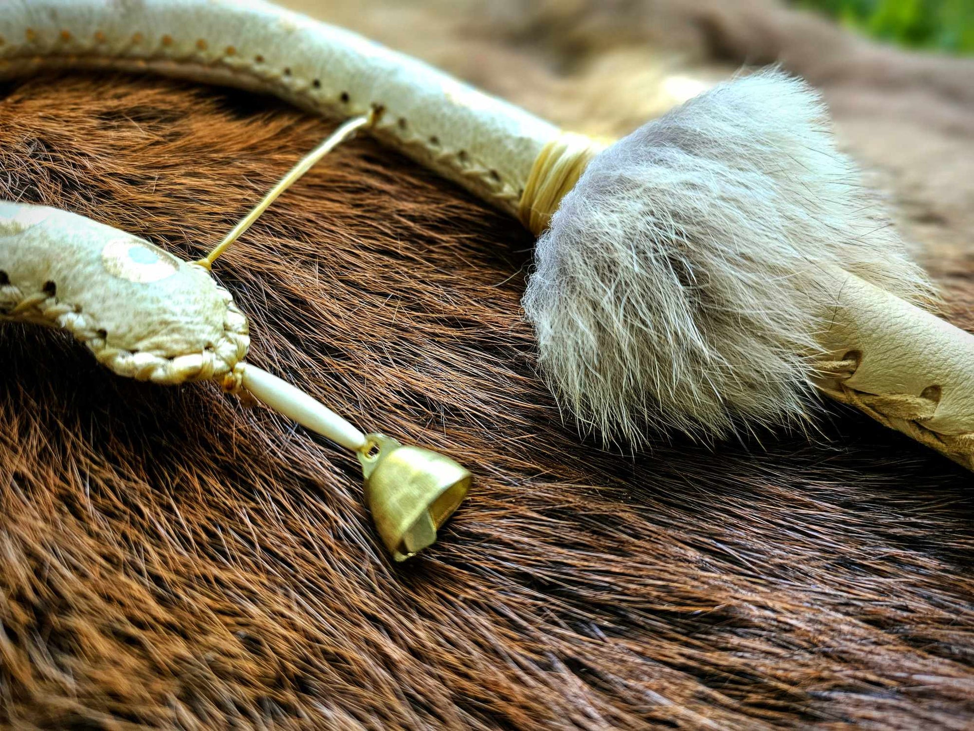 Good-Harvest - Medicine Rattle. Bear skin and buckwheat rattle head, Poplar wood handle, Buckskin grip, Coyote fur, two brass bells, Bison bone pipe, Horse tail.