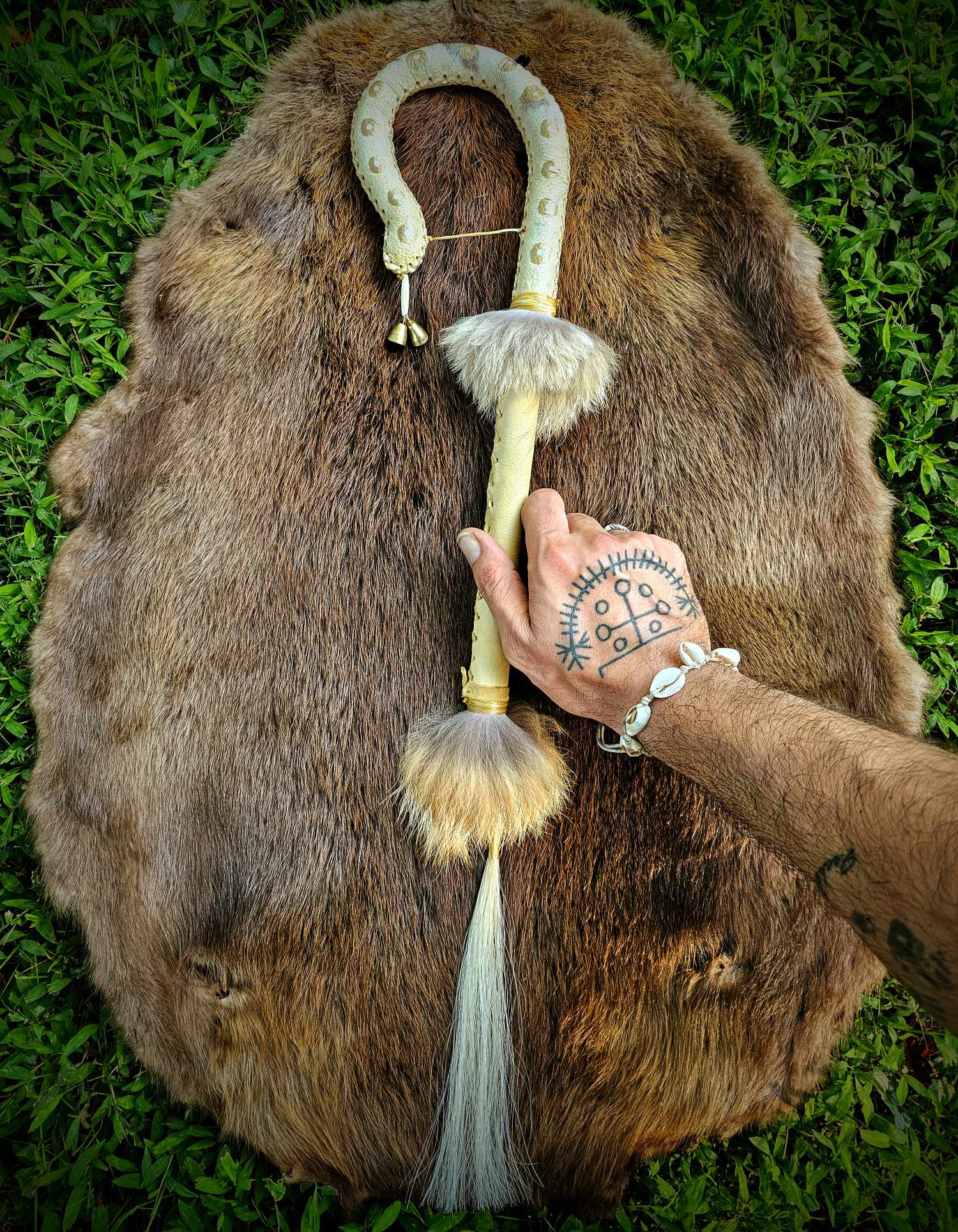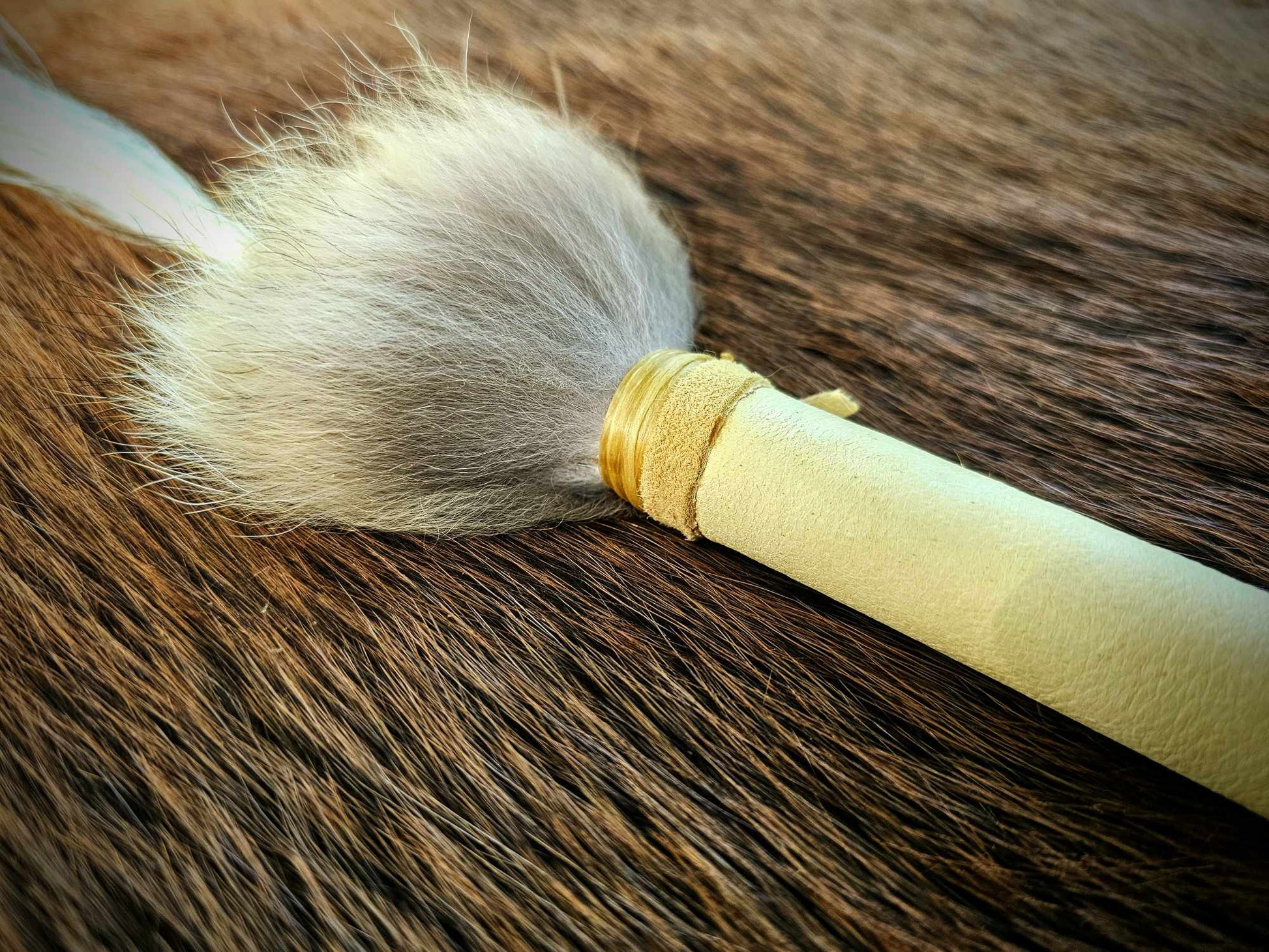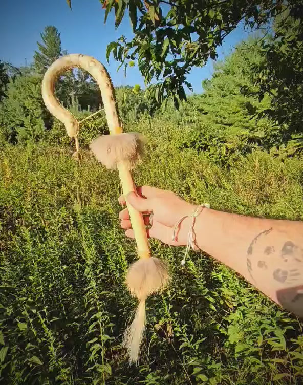 Good-Harvest - Medicine Rattle. Bear skin and buckwheat rattle head, Poplar wood handle, Buckskin grip, Coyote fur, two brass bells, Bison bone pipe, Horse tail.