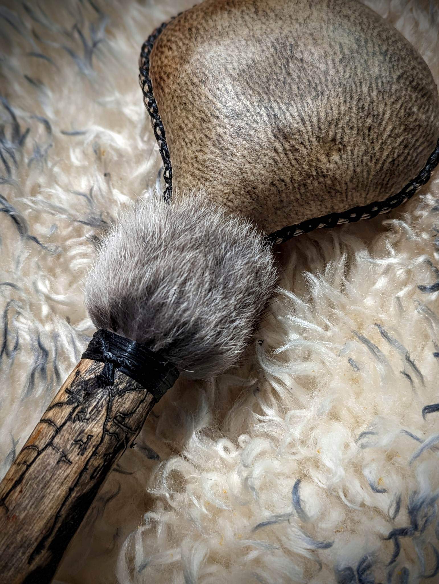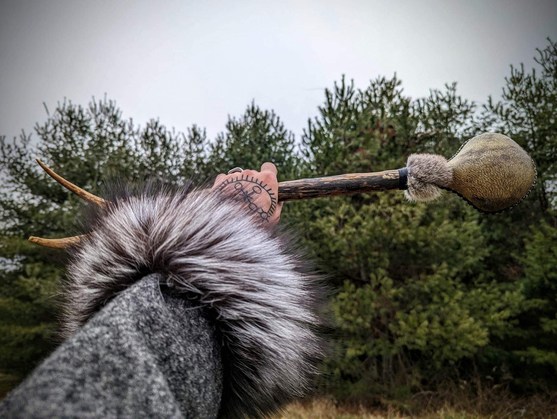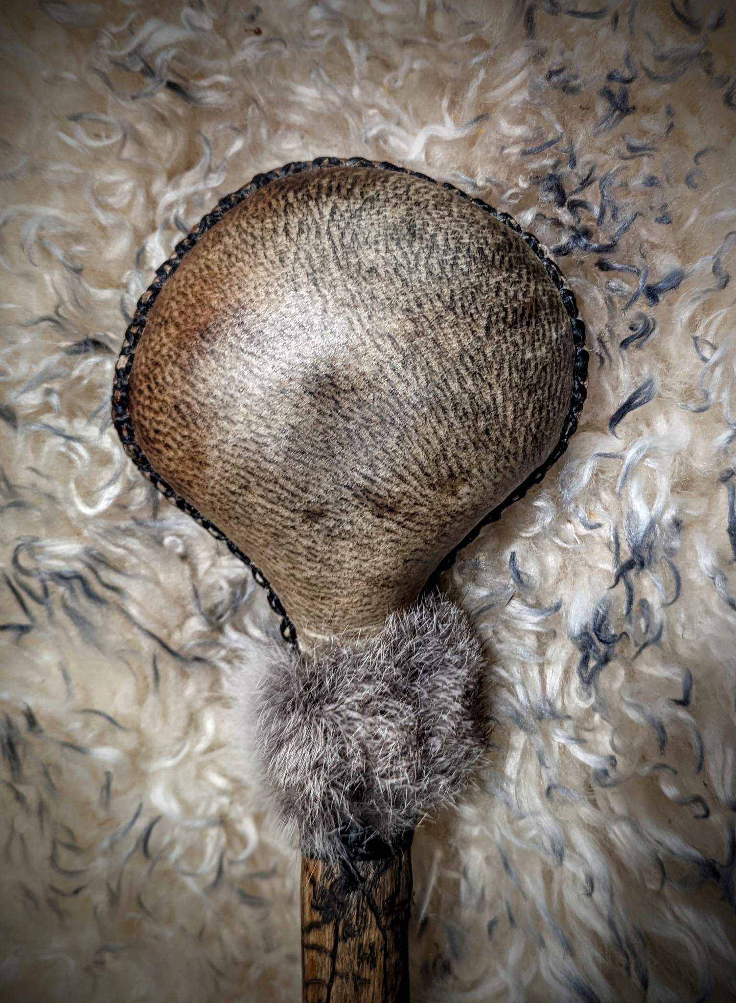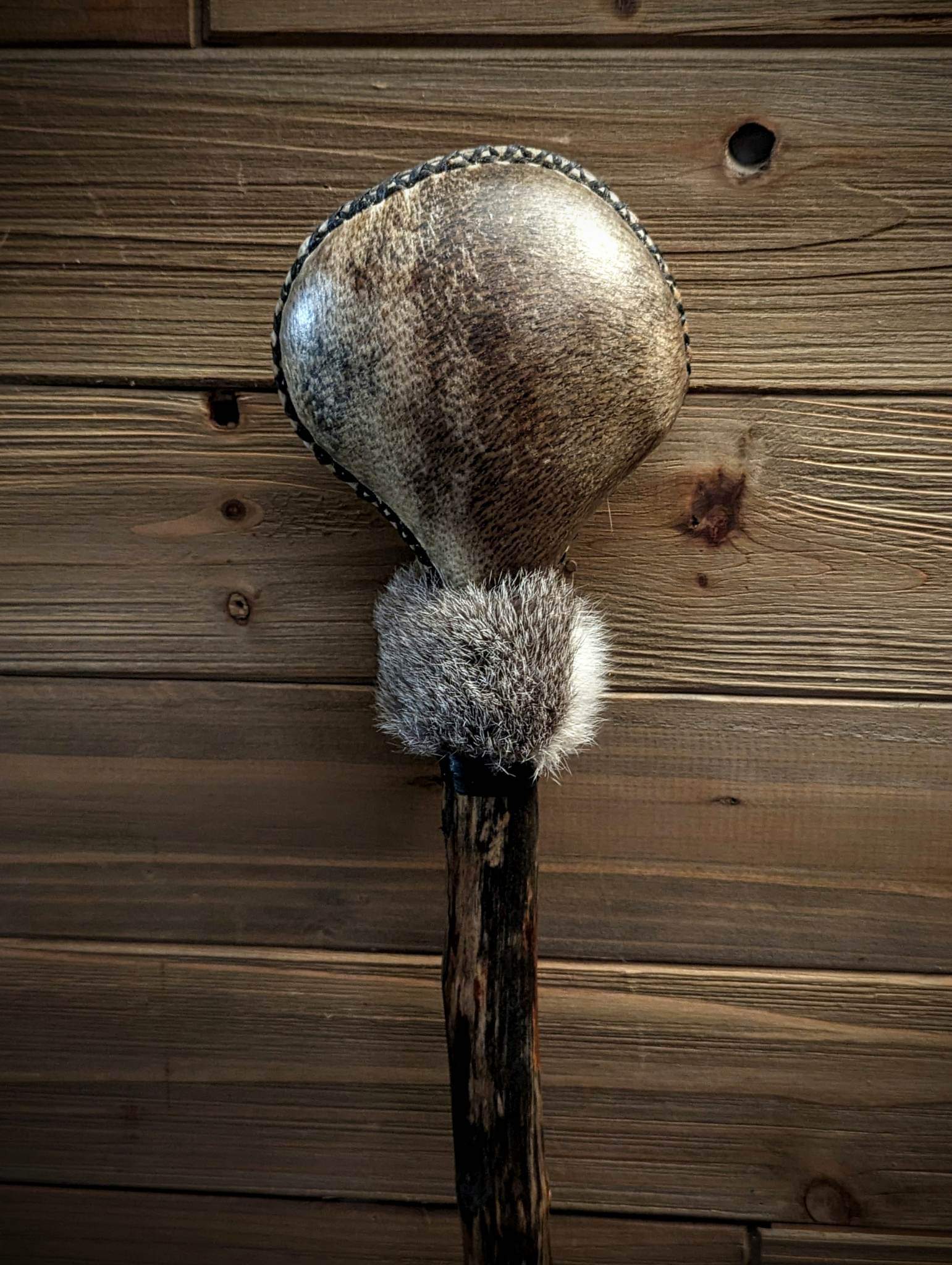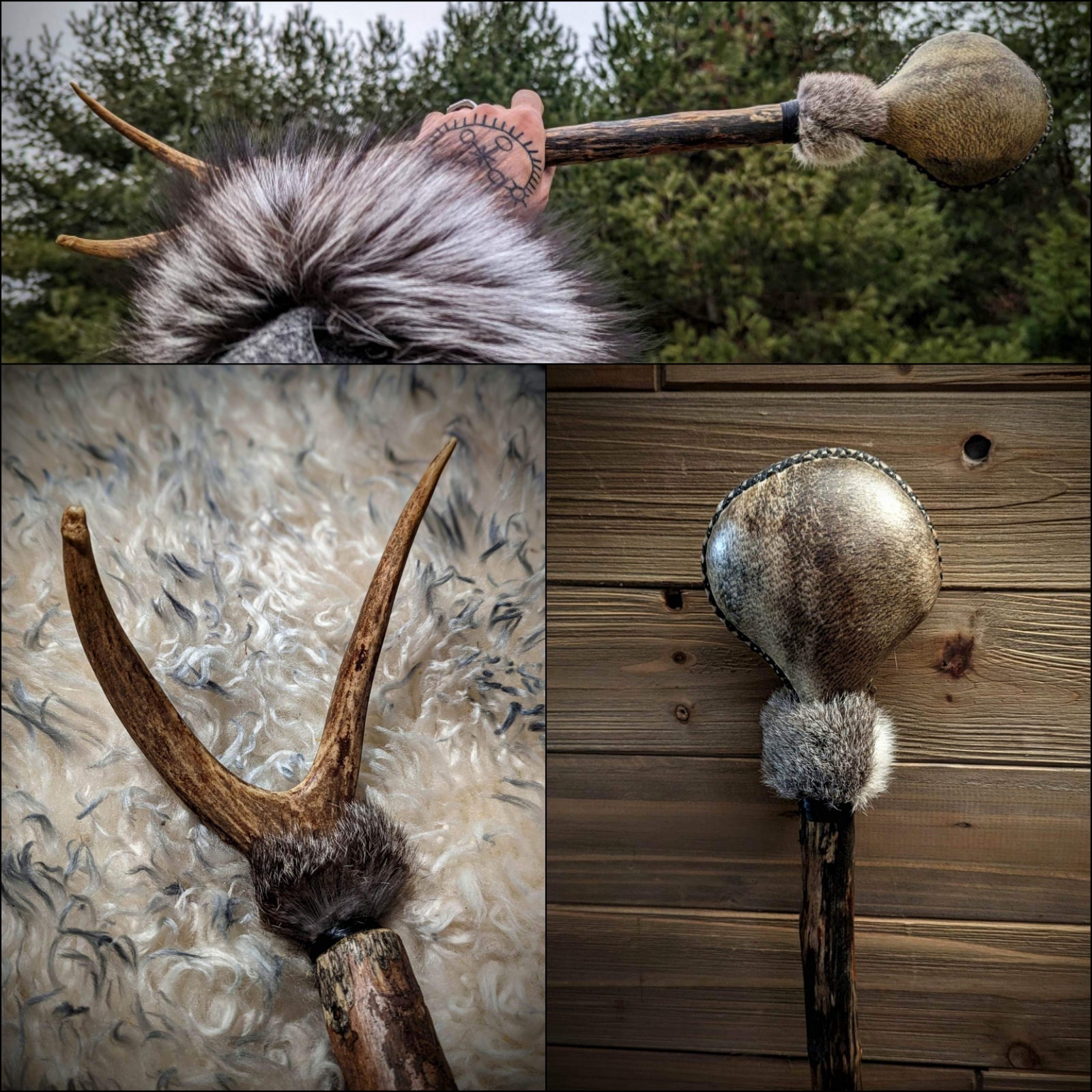 Grárbjörn "Grey Bear" Bear Hide Shaman Rattle with Rabbit Fur and Deer Antler