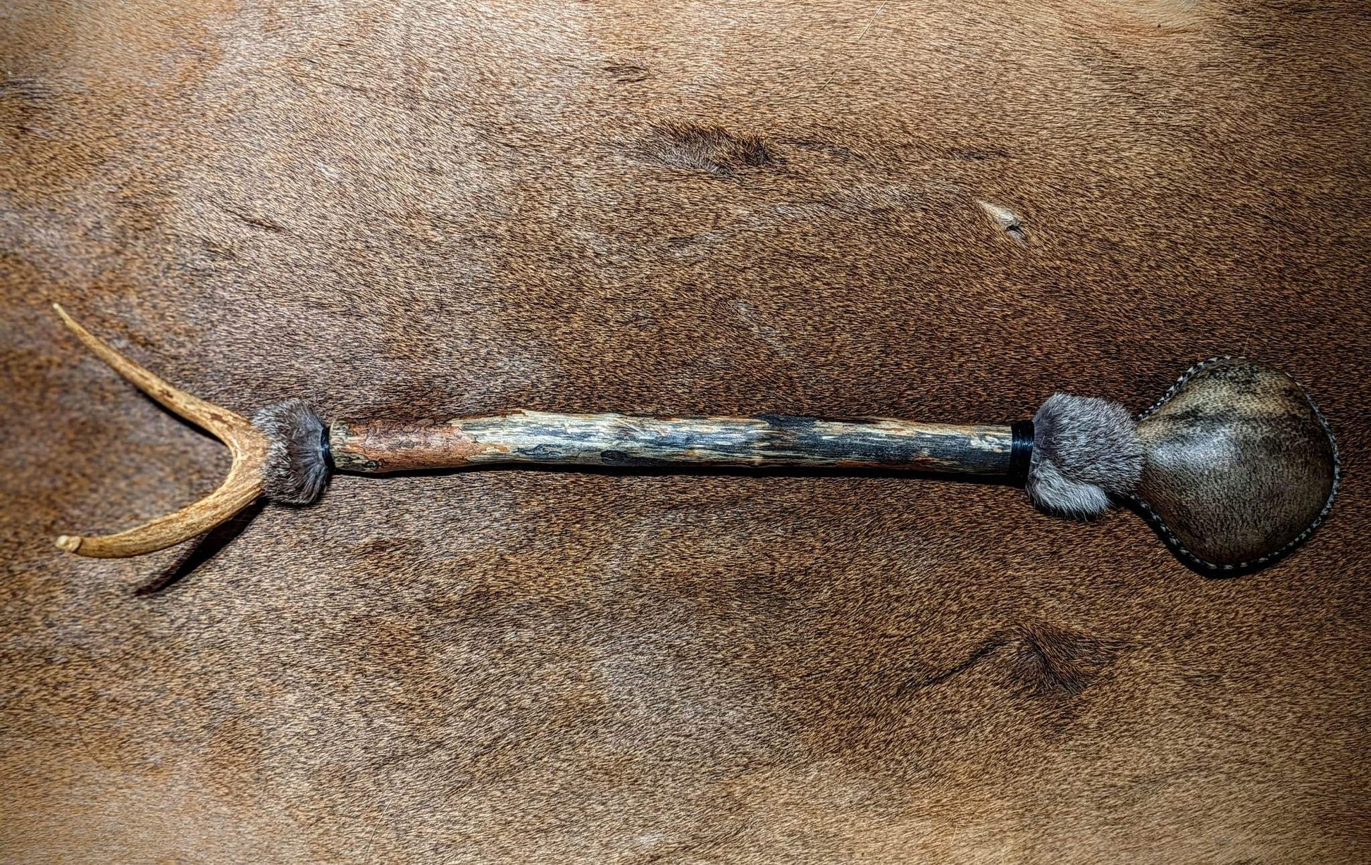 Naturally gray toned bear skin head, Pacific coast evergreen Arbutus wood shaft, sinew, trimmed with rabbit fur, filled with buckwheat for crisp sound. 26.5" total length.