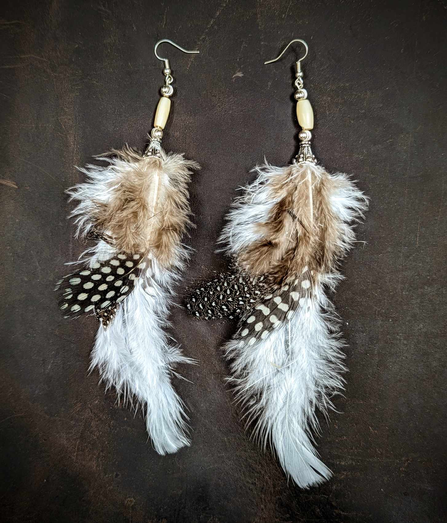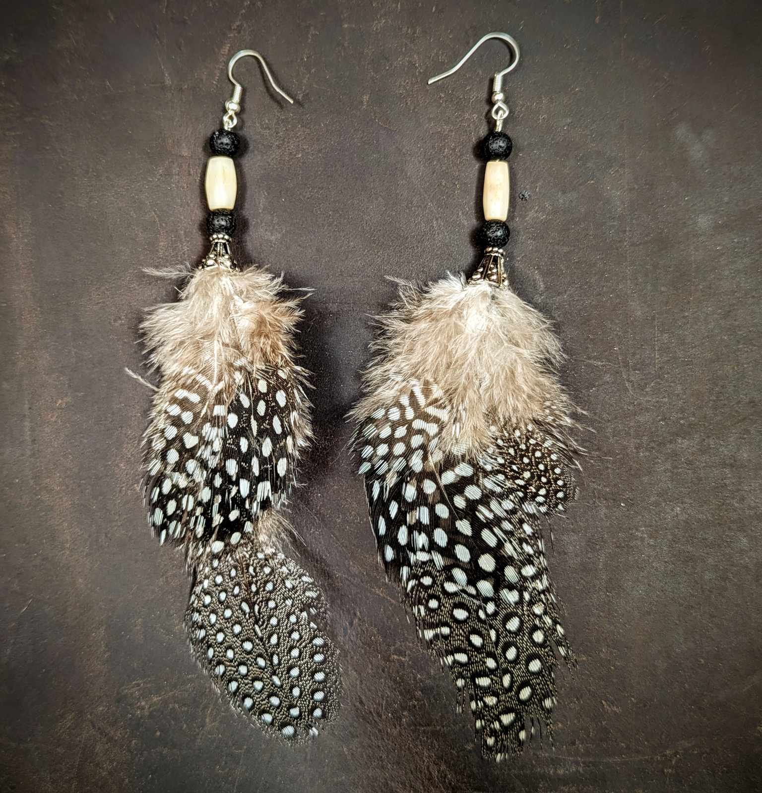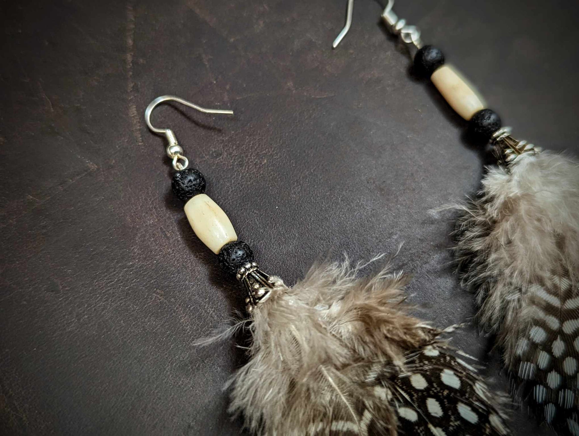 Two different pairs of earrings to choose from - one features lava beads, one sterling silver ball beads. Both pairs have sterling ear wires, Bison bone pipe beads, and natural guinea feathers.
