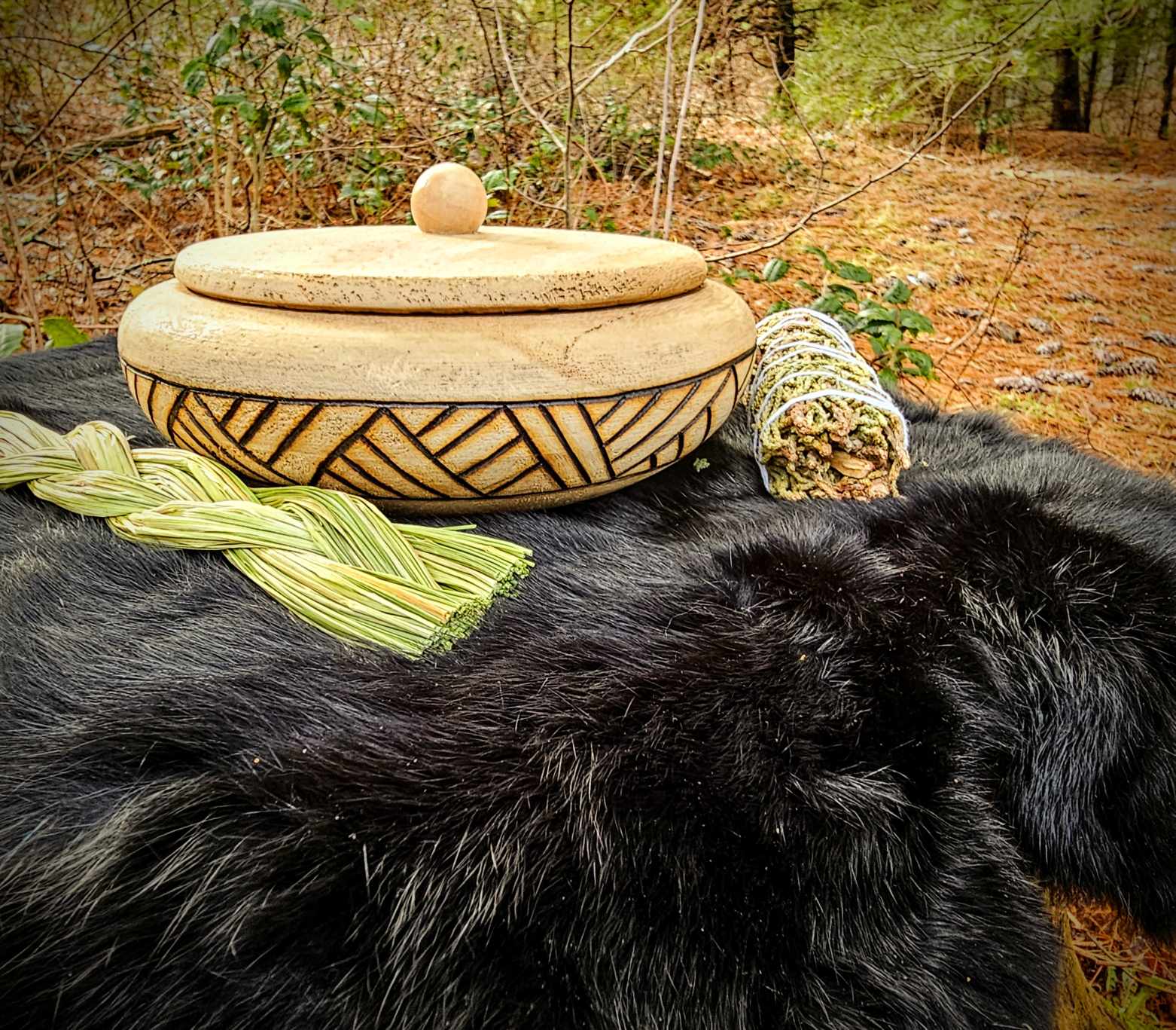 Hand Burned Woven Band Bowl With Lid