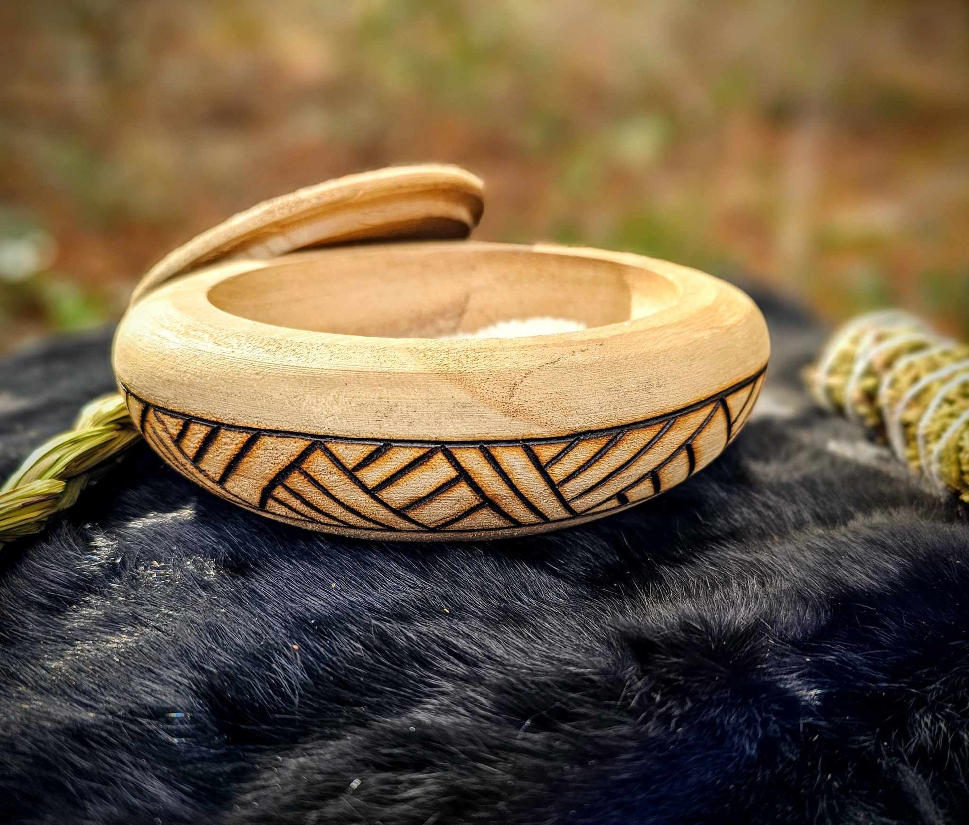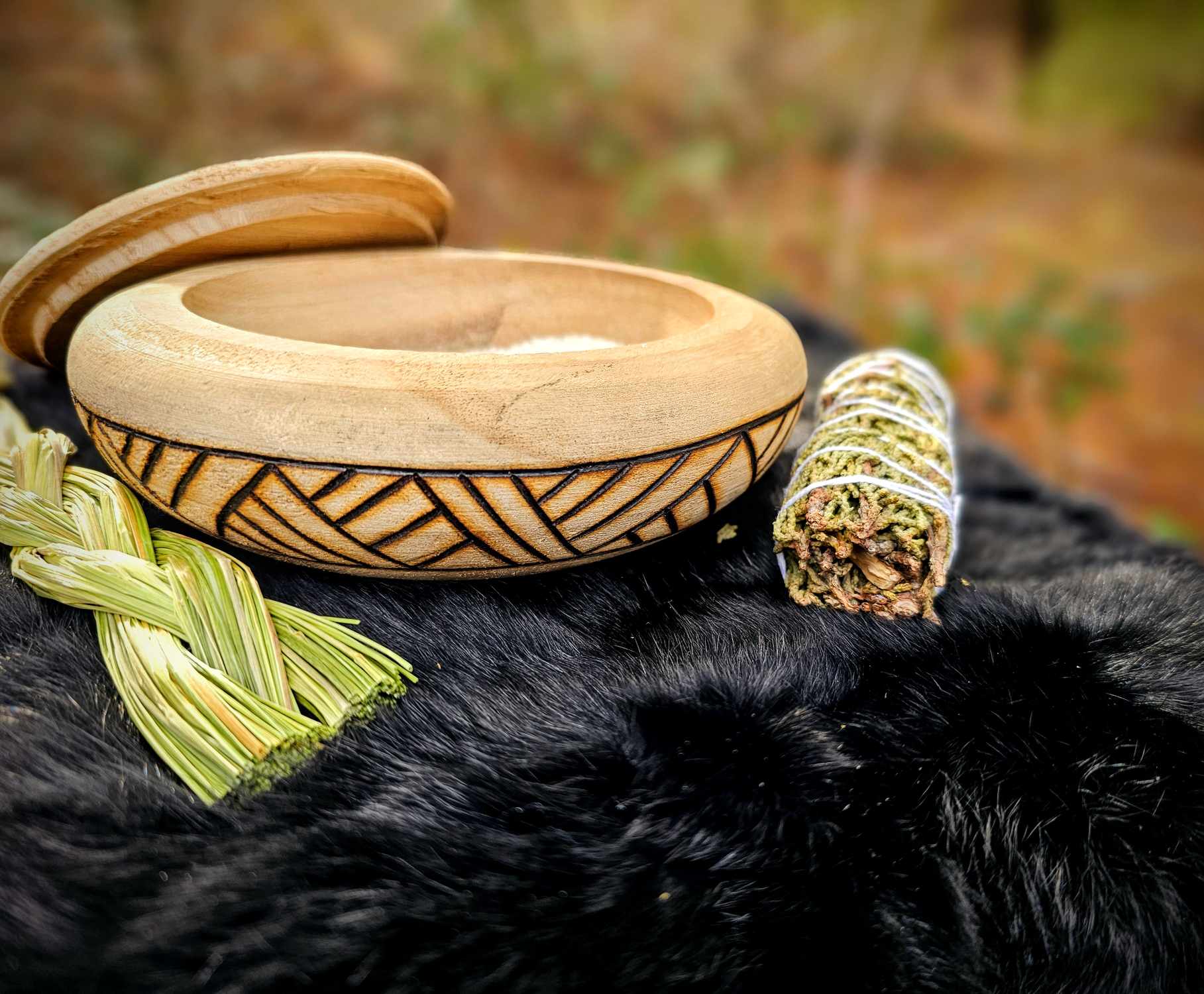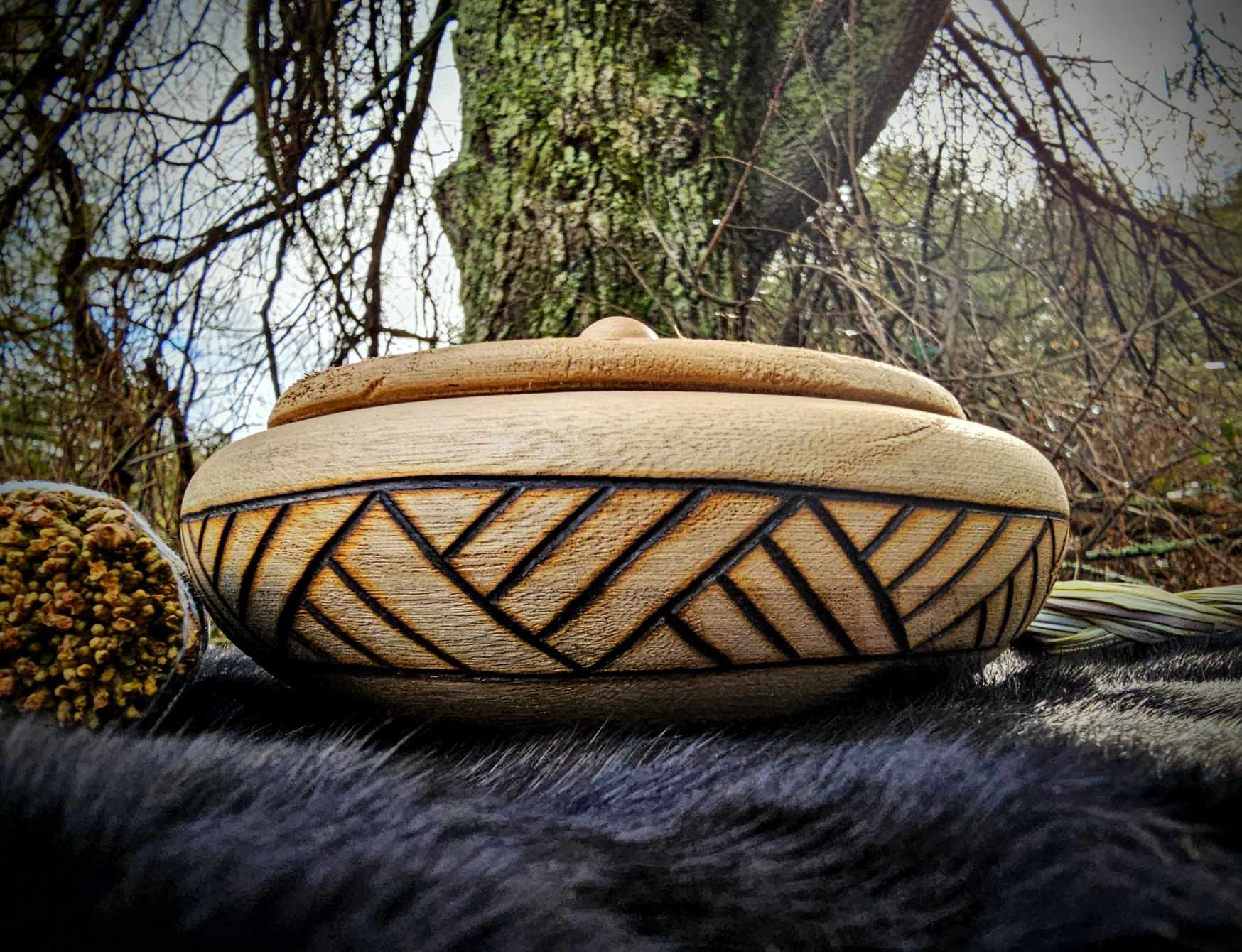 Hand burned wood bowl. Use to store runes, altar goods, to make dry offerings, or to stash any collection of small items.