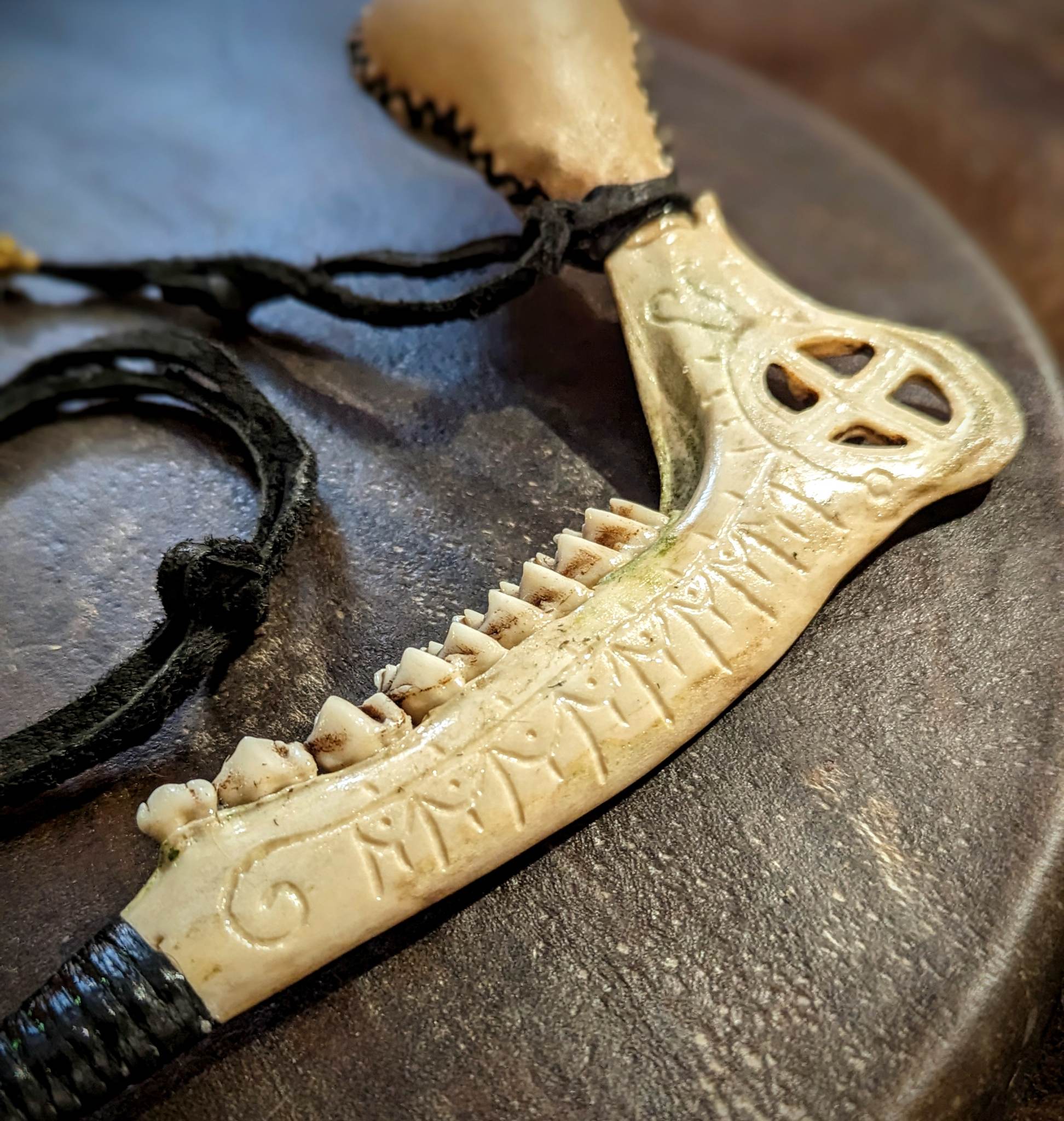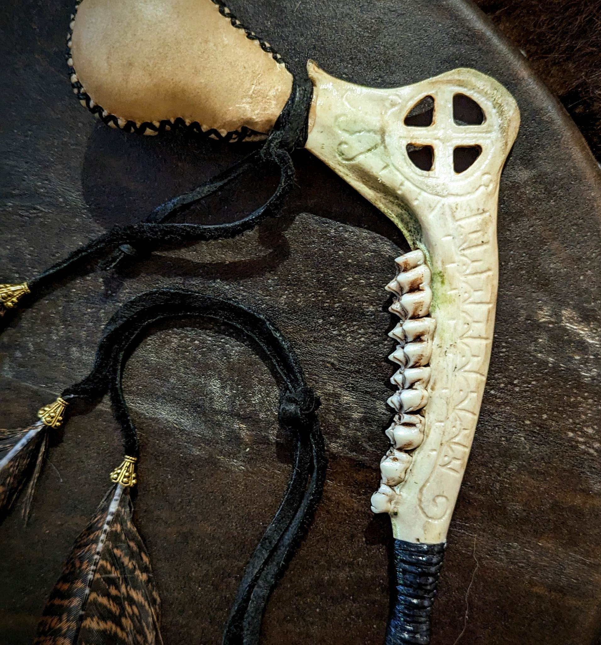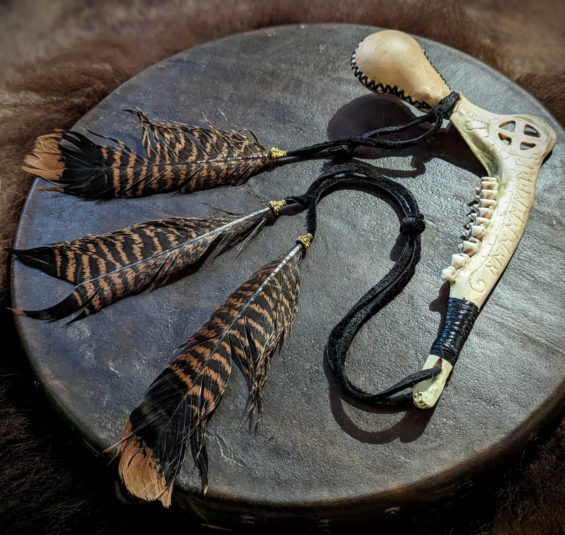 Hand Engraved Deer Jaw and Hide Shaman Rattle With Turkey Feathers | Sunwheel Stave Art