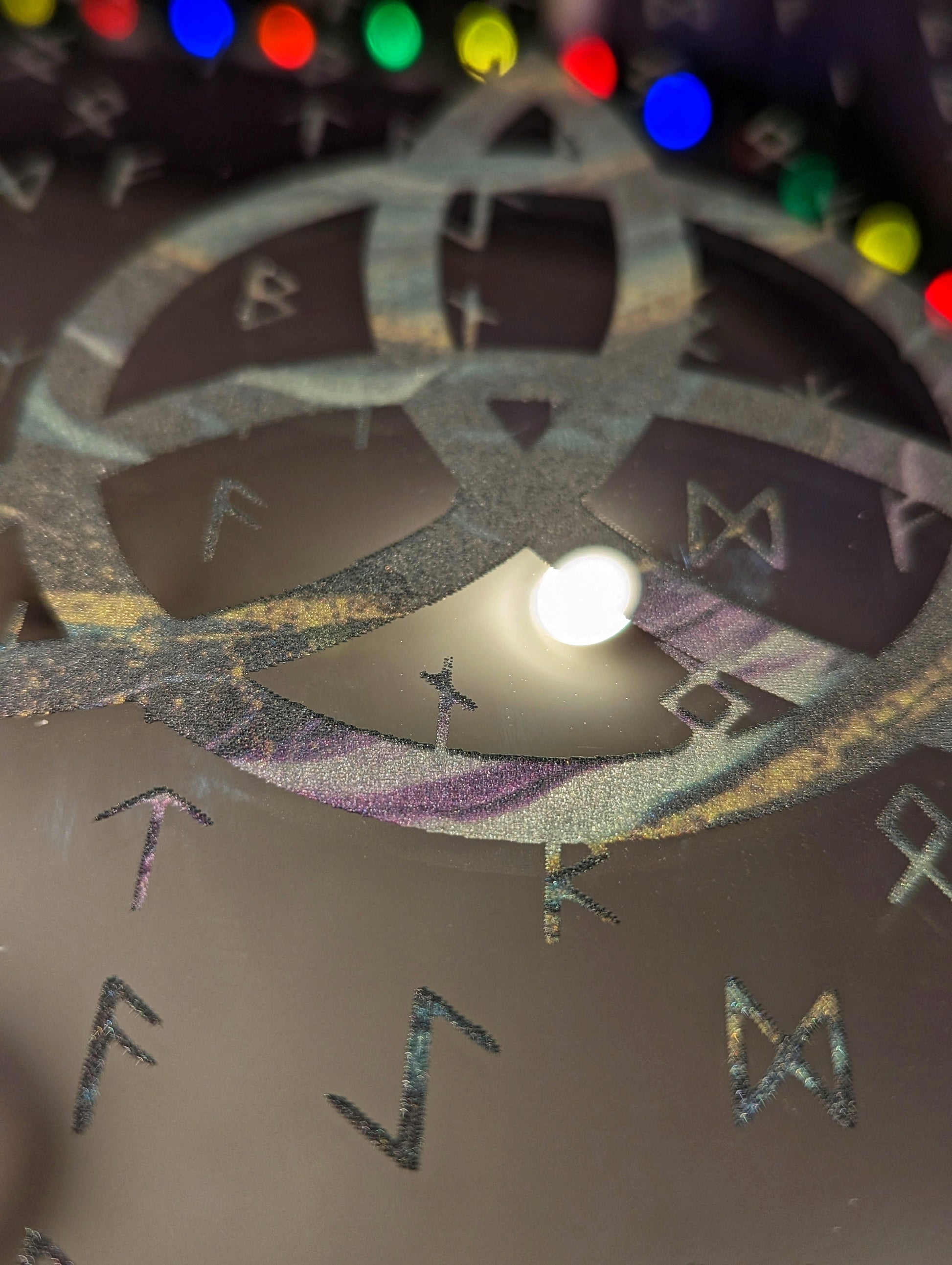 Gold mirror frame, with engraved random rune pattern and Triskelion. Behind the engraving a green, gold, and purple swirl shows through. Details around the frame are enhanced with the same colors. Measures 11.8 inches tall, and 9.7 inches wide. Hangs with sturdy sawtooth hanger on rear.