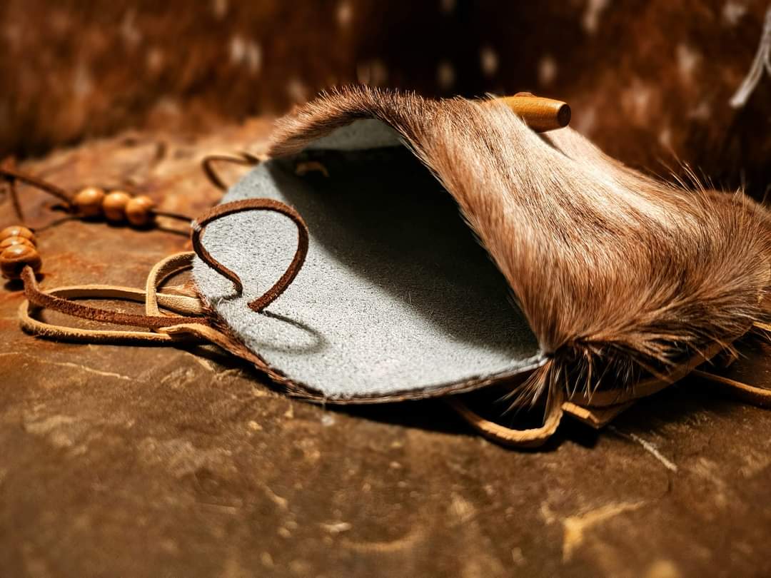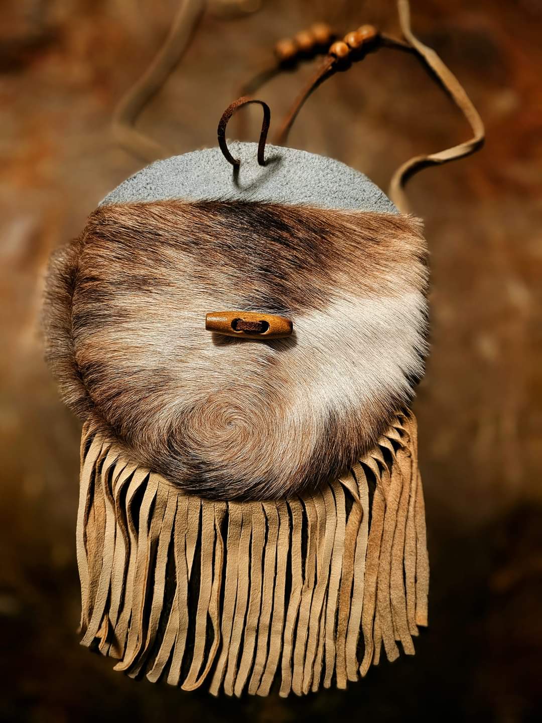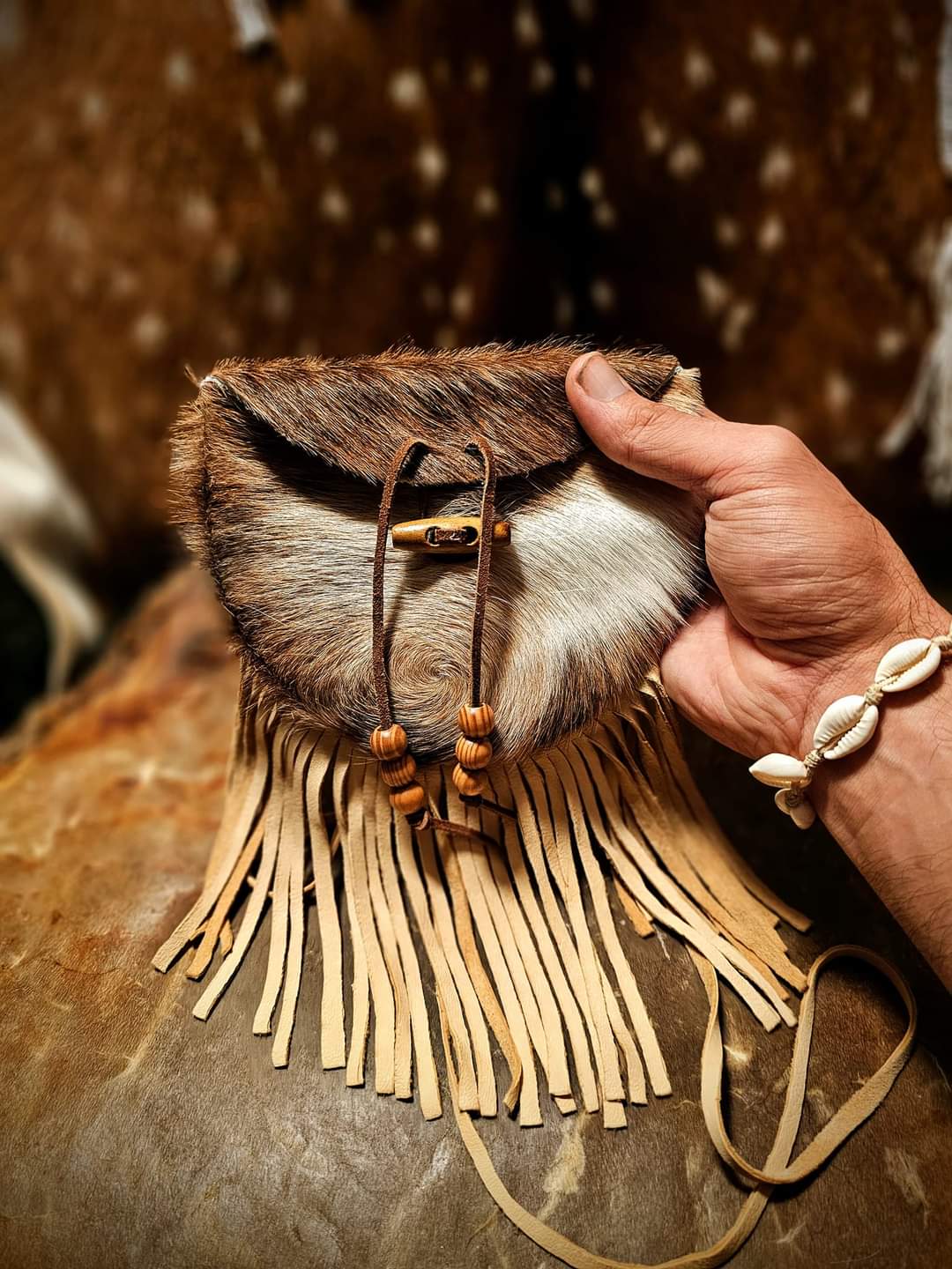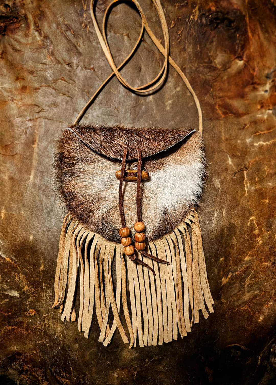 Hand cut, sewn, and finished hair-on cowhide bag with wood toggle. Buckskin strap and fringe. Closes securely.