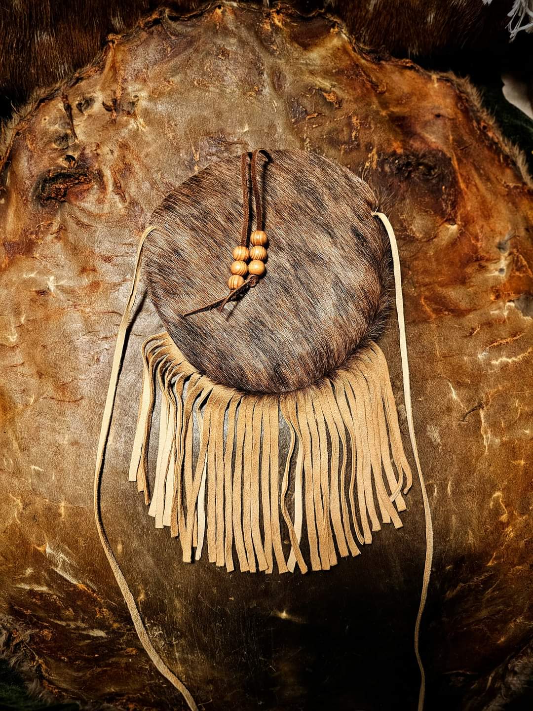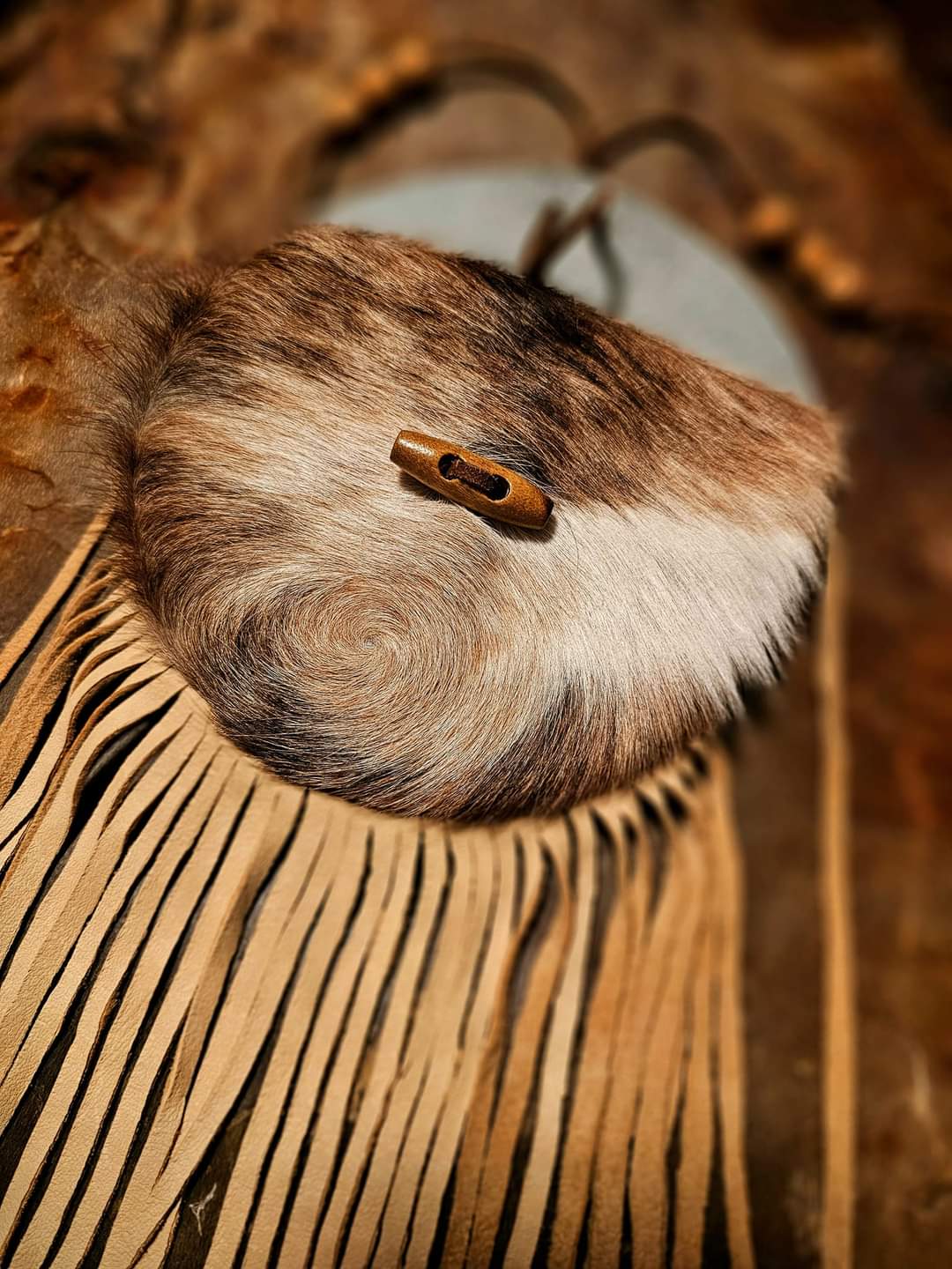 Handmade Cowhide Bag | Round Bag With Wood Toggle and Fringe | Hair On