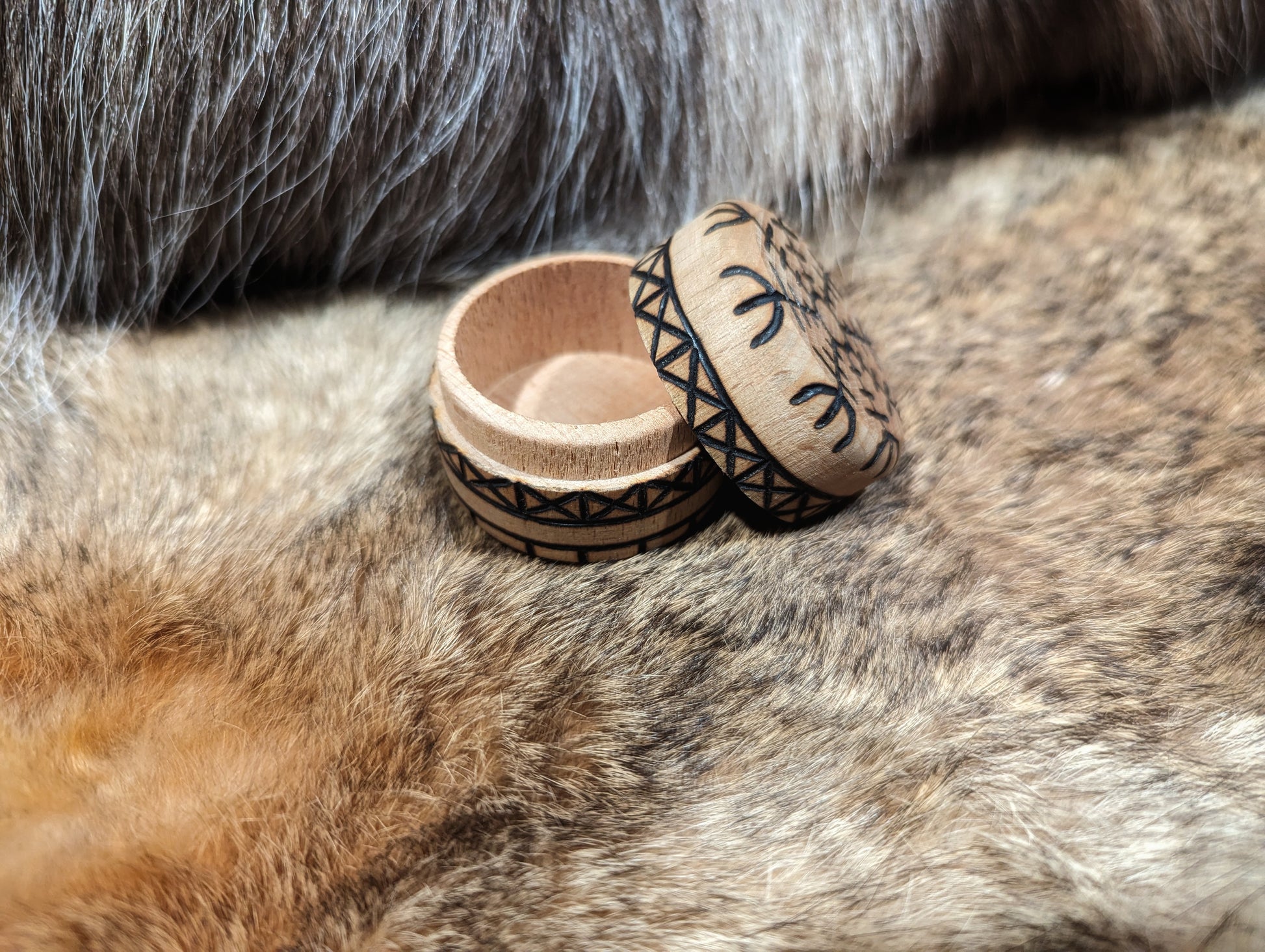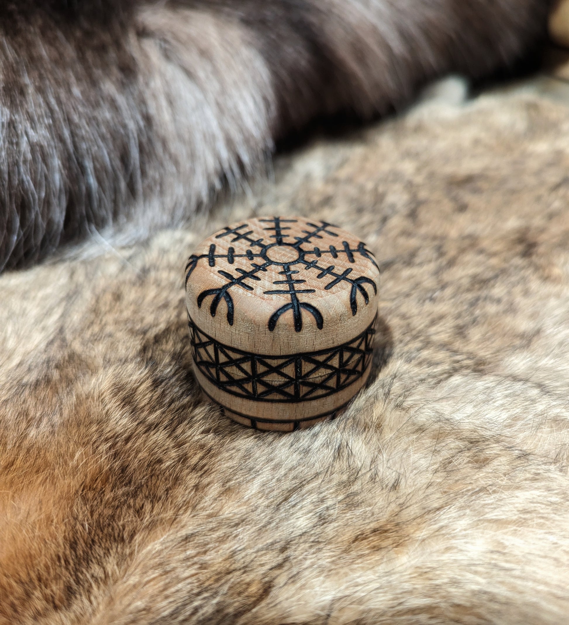 Small hand burned trinket or ring box featuring the Aegishjalmir, helm of awe on top. See photo in hand for size. Made of Beech tree.