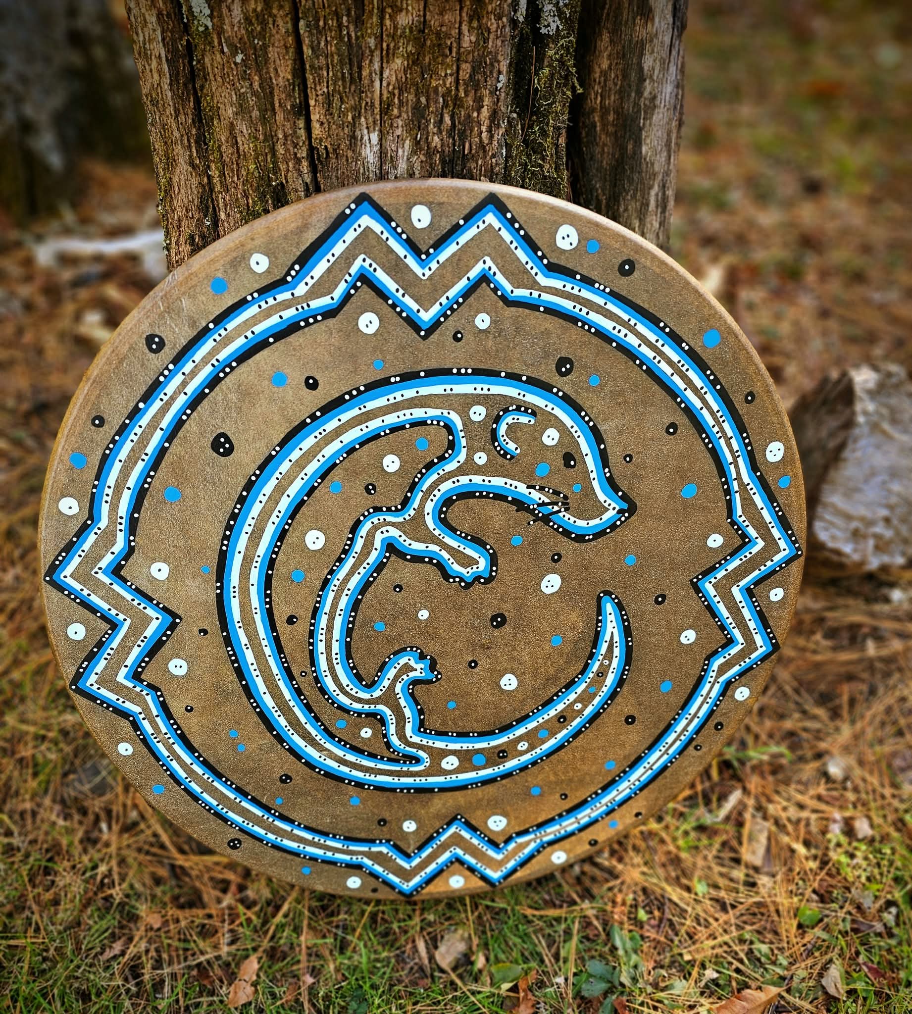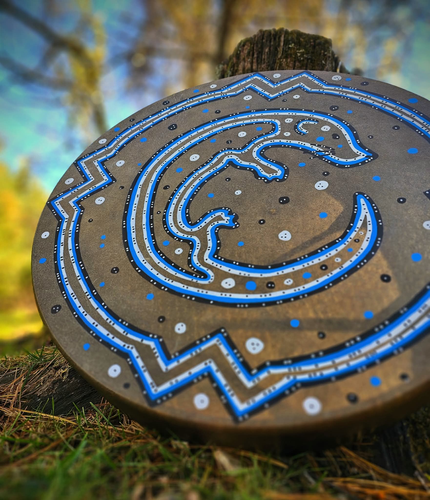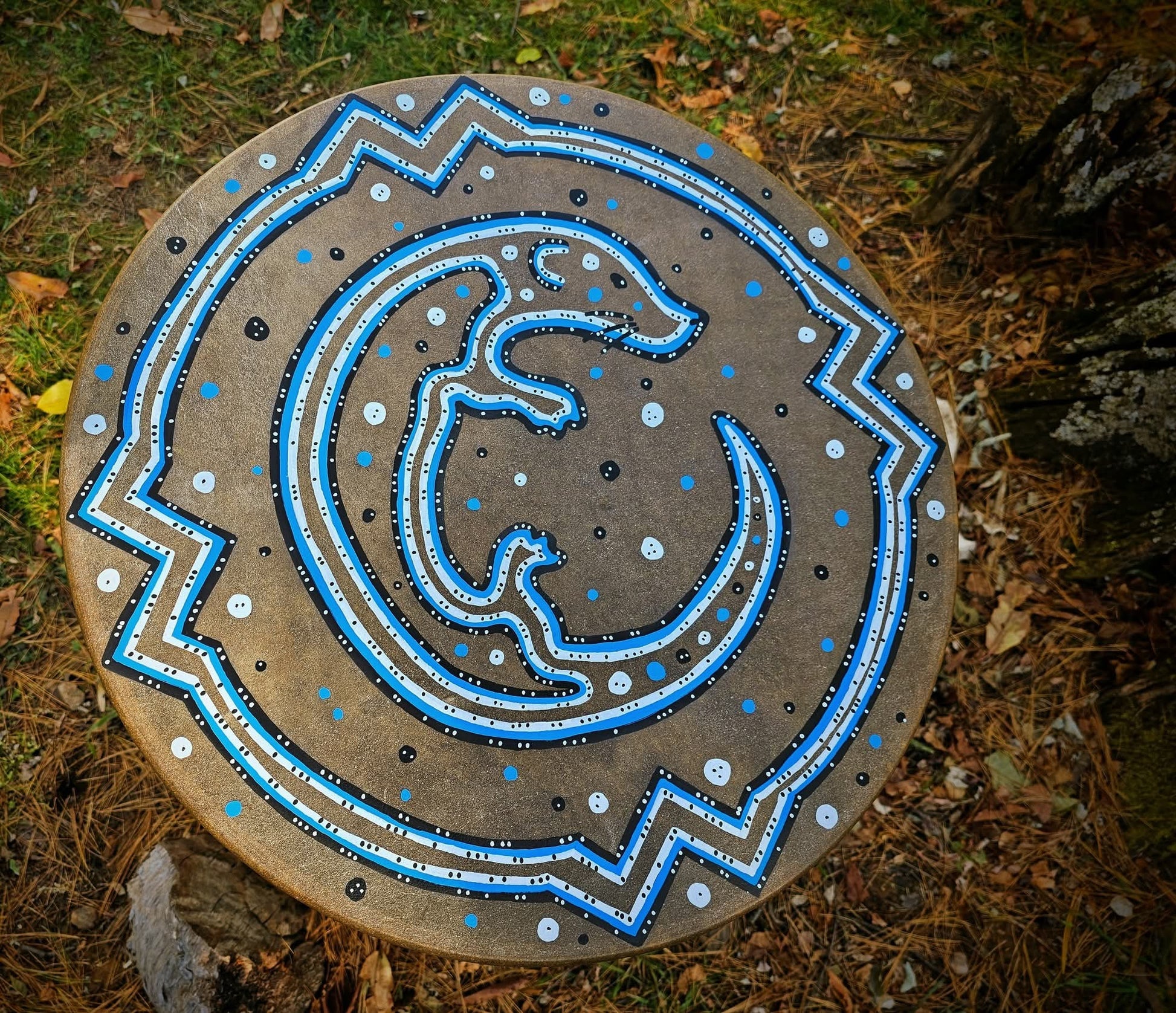 Inspired by last week's time with the Otter Family on the New (Kanawha) River - It was a highly improbable encounter, so to see them from where I did and for them to stay for as long as they did, I believe it was perhaps a little more than chance. Reflecting on that special time, my mind went to the river at night and how it resembles the night sky moving, catching little bits of moonlight in its motion. The ring around the drum represents the river, its smoothness and its falls and cascades, the Otter at its home, and both in the form of the night sky world moving above. House-made oil based paint, 20" Horse skin hand drum.