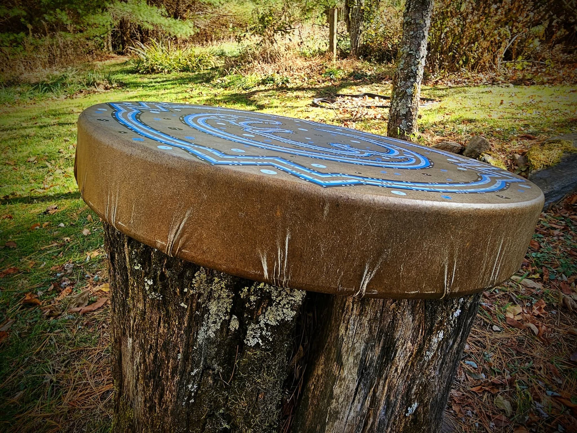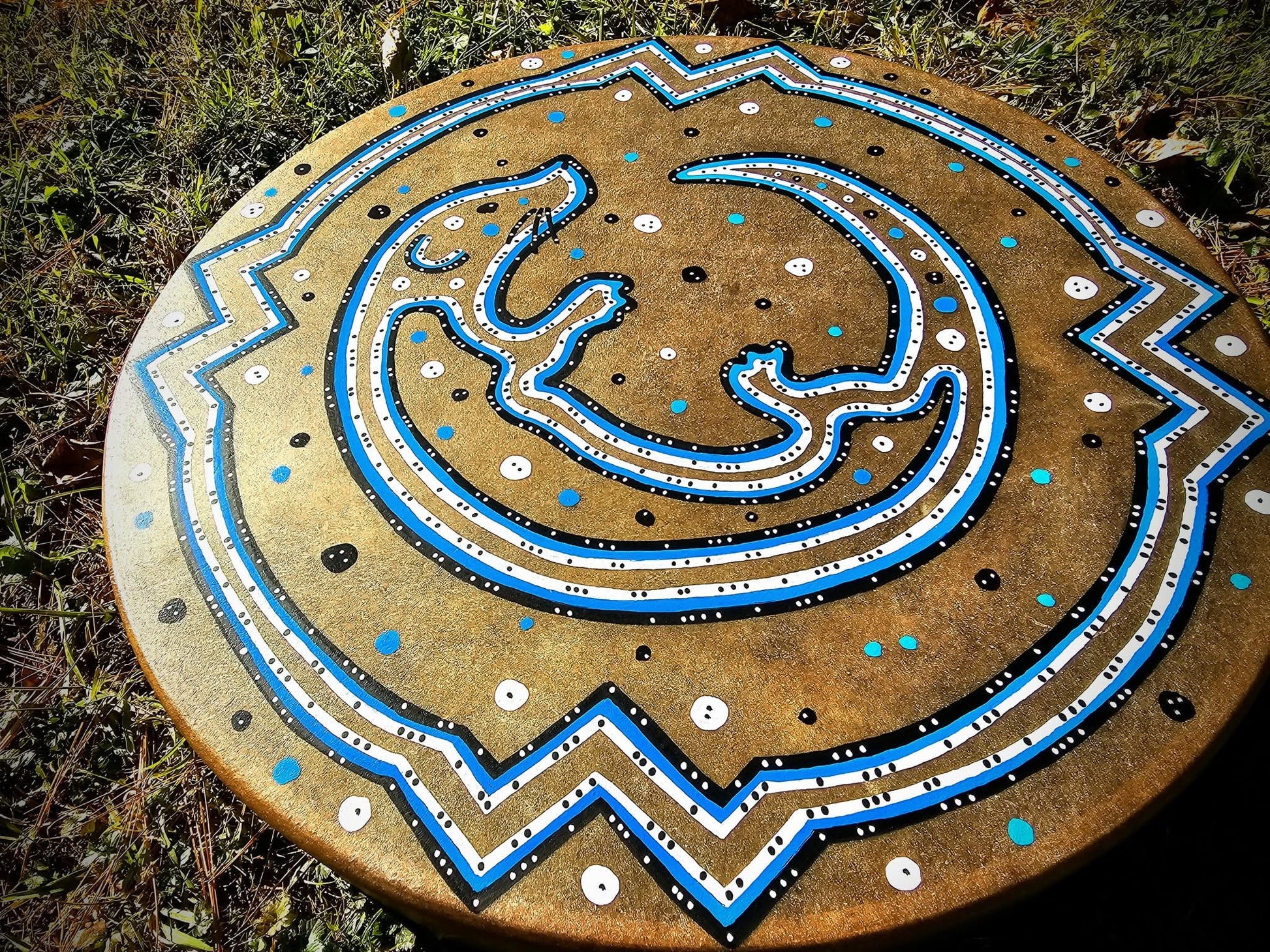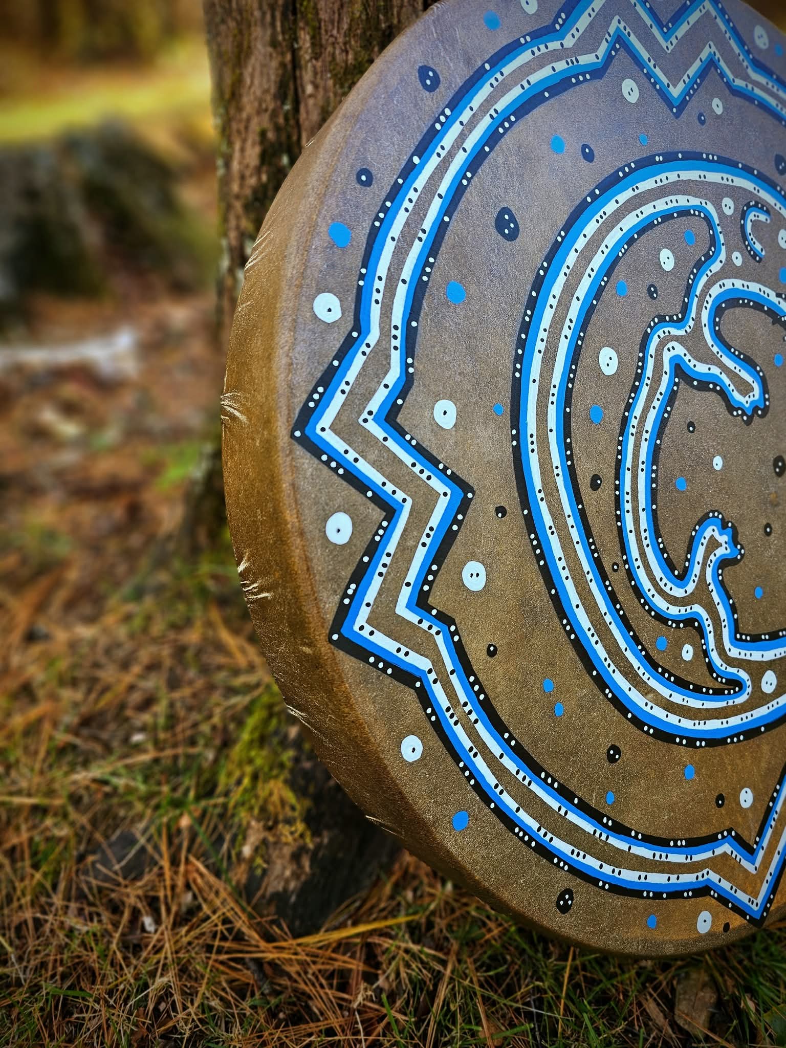 Inspired by last week's time with the Otter Family on the New (Kanawha) River - It was a highly improbable encounter, so to see them from where I did and for them to stay for as long as they did, I believe it was perhaps a little more than chance. Reflecting on that special time, my mind went to the river at night and how it resembles the night sky moving, catching little bits of moonlight in its motion. The ring around the drum represents the river, its smoothness and its falls and cascades, the Otter at its home, and both in the form of the night sky world moving above. House-made oil based paint, 20" Horse skin hand drum.
