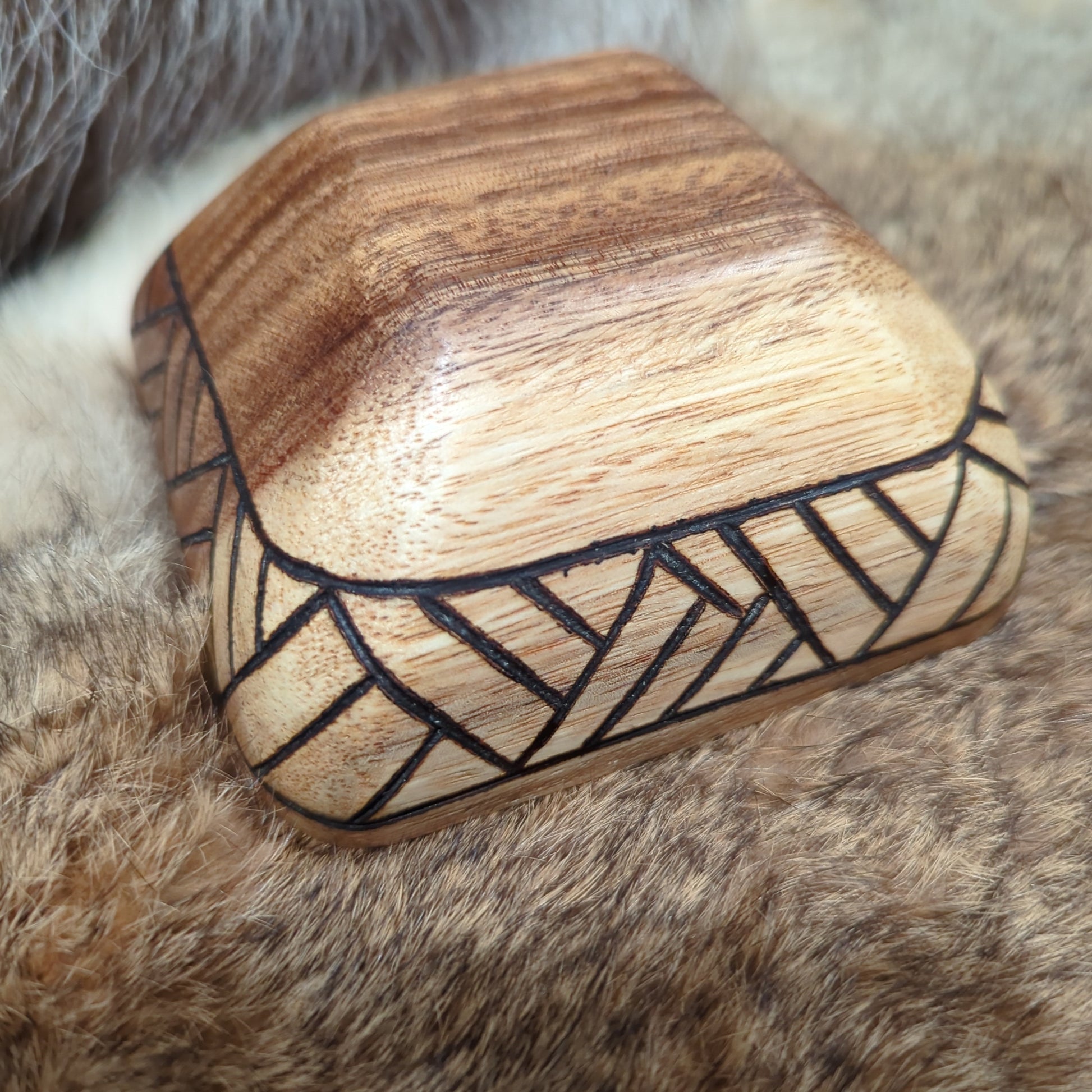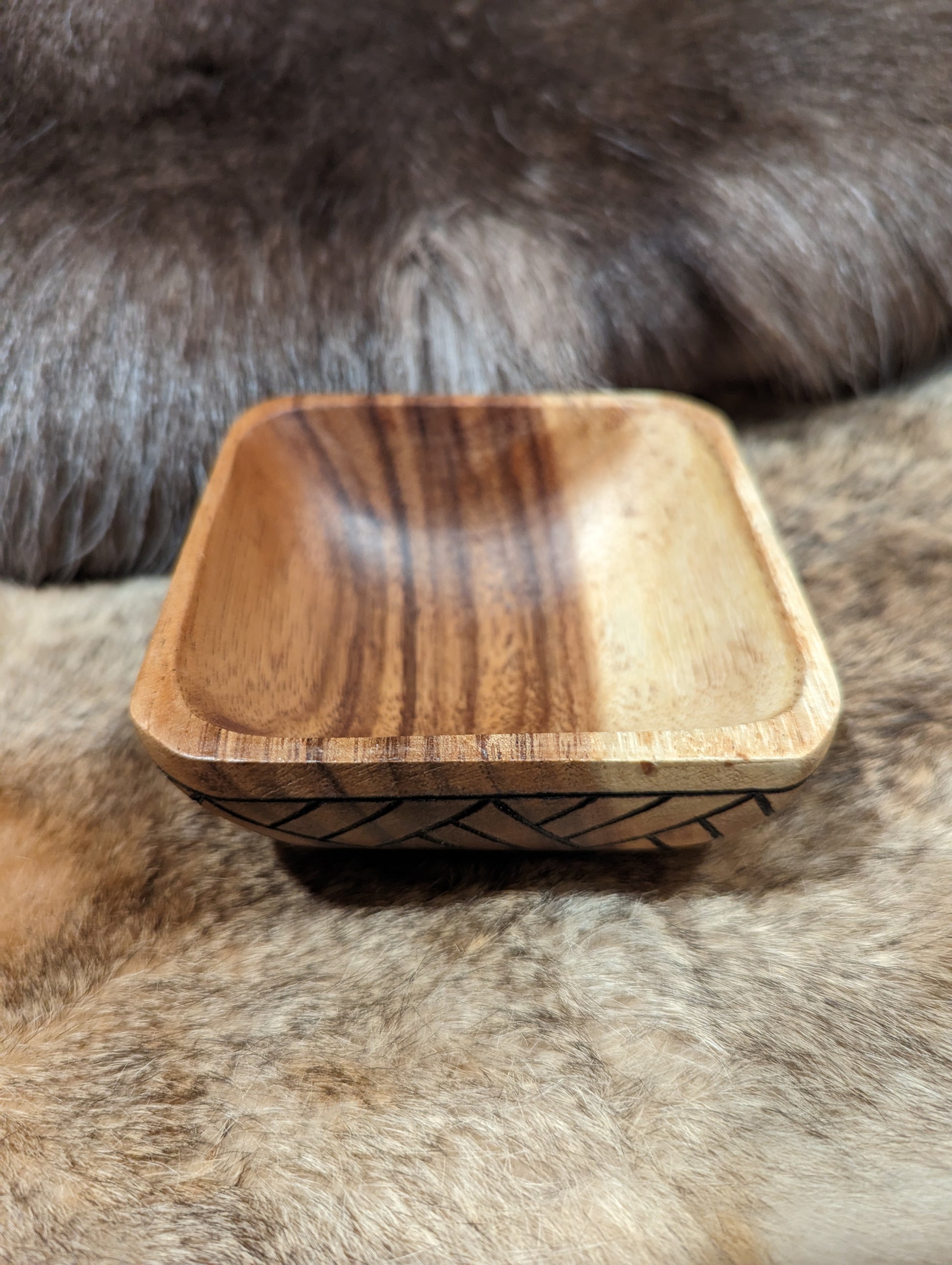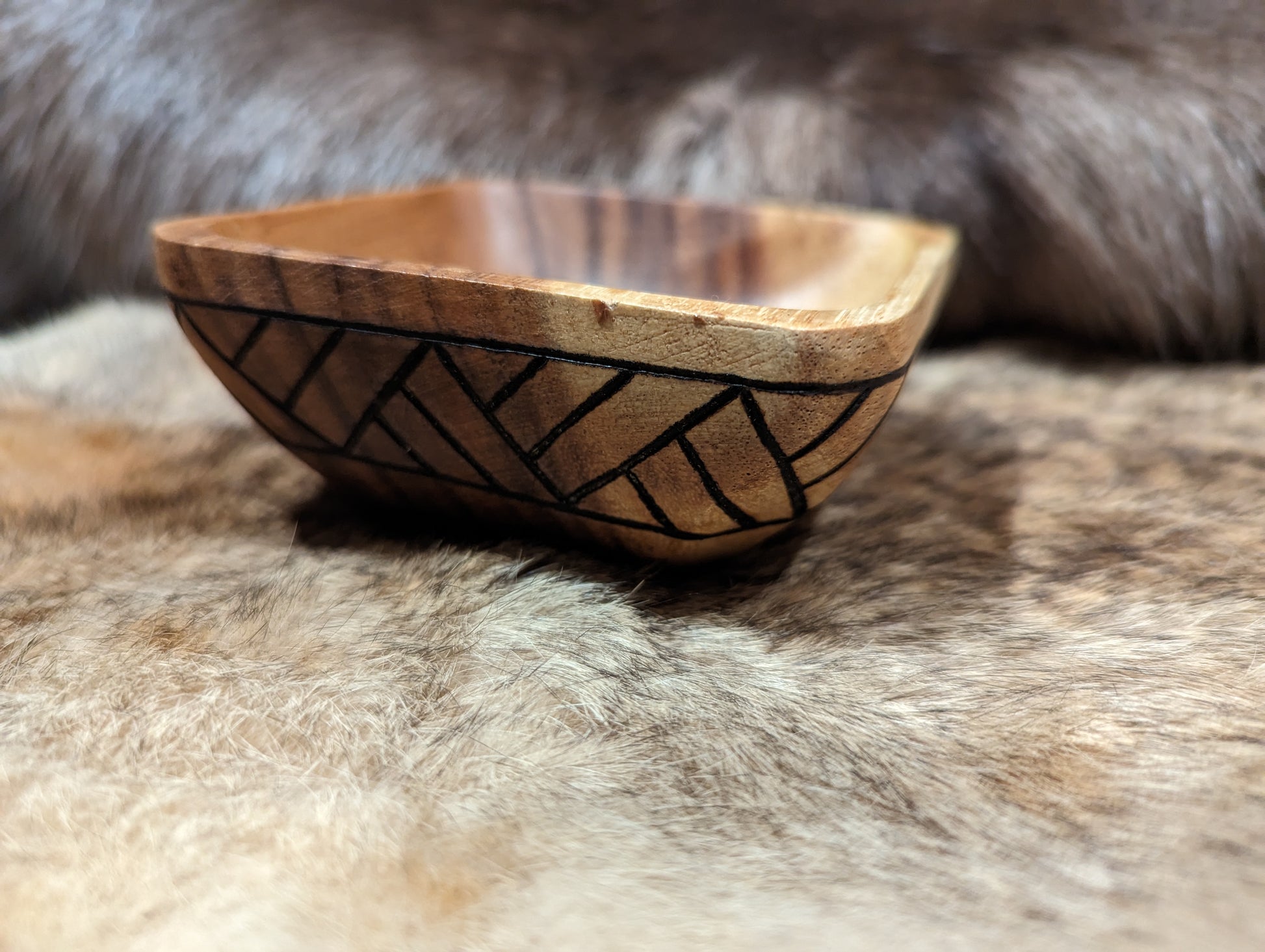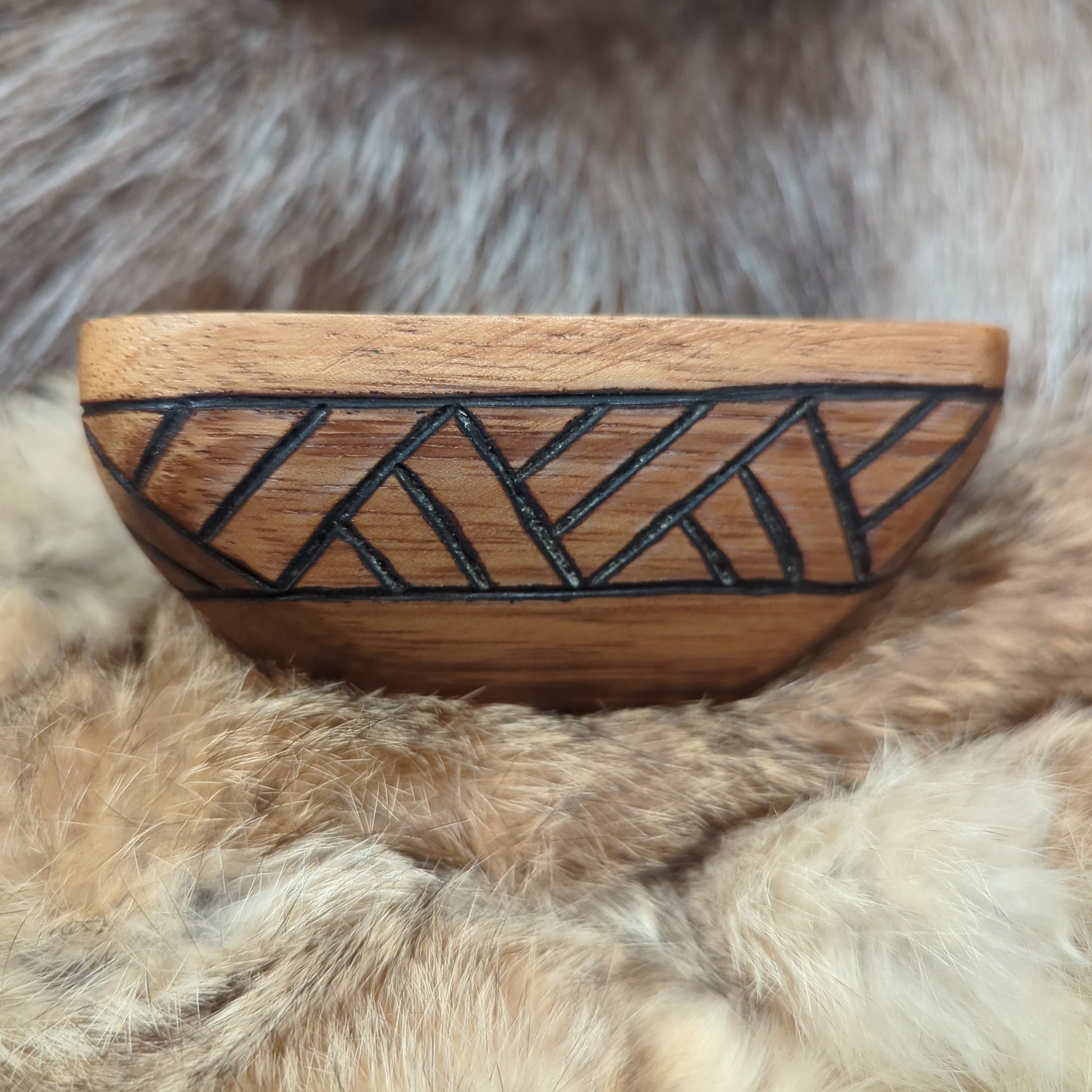 4 inch carved wood bowl with hand burned knotwork design. Use to hold small objects, as an altar fixture, or as a portable blot bowl. Food safe. Holds approximately four fluid ounces.