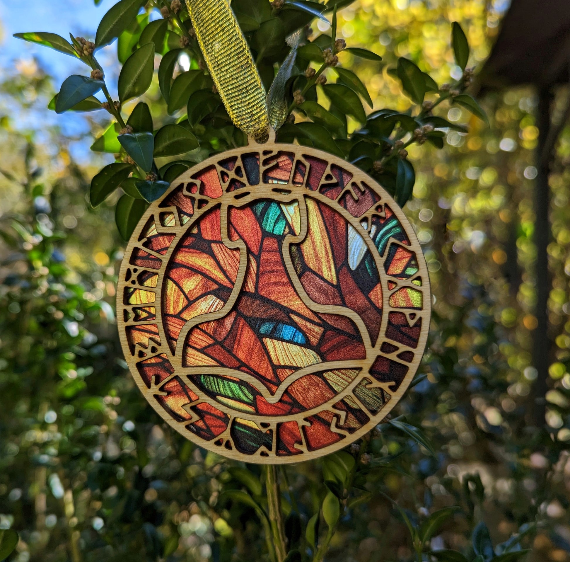 3.5 inch layered mjölnir and runes ornament, made of birch wood and a layer of shiny stained glass effect veneer in gold, orange, green and red. Gold ribbon tie hanger.