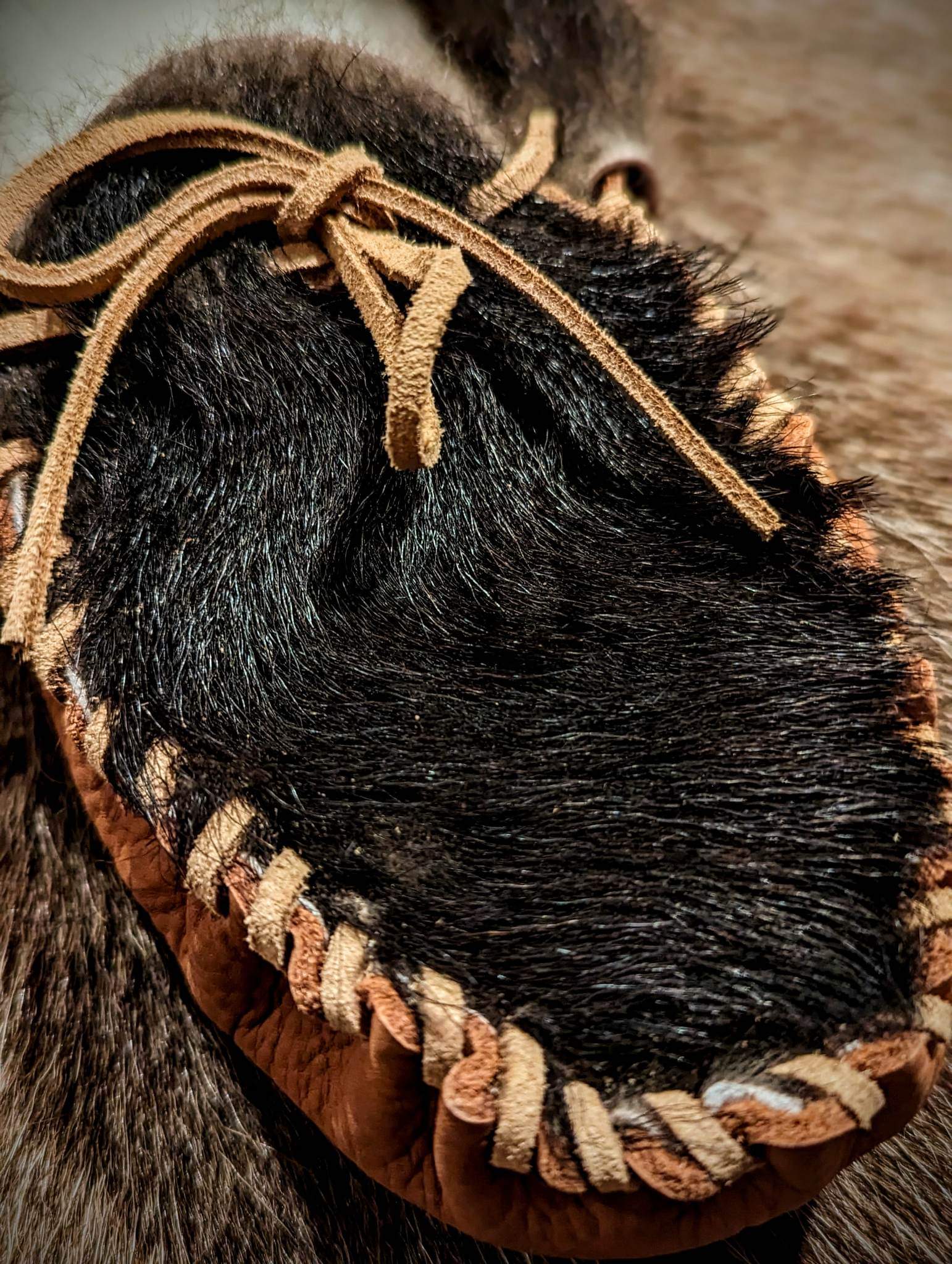 Hand cut & sewn soft sole cow leather & black goathide slipper with removable sheepskin insoles. Women's US 7-8.5, EU 38-39.5. Measures 11 inches heel to toe.