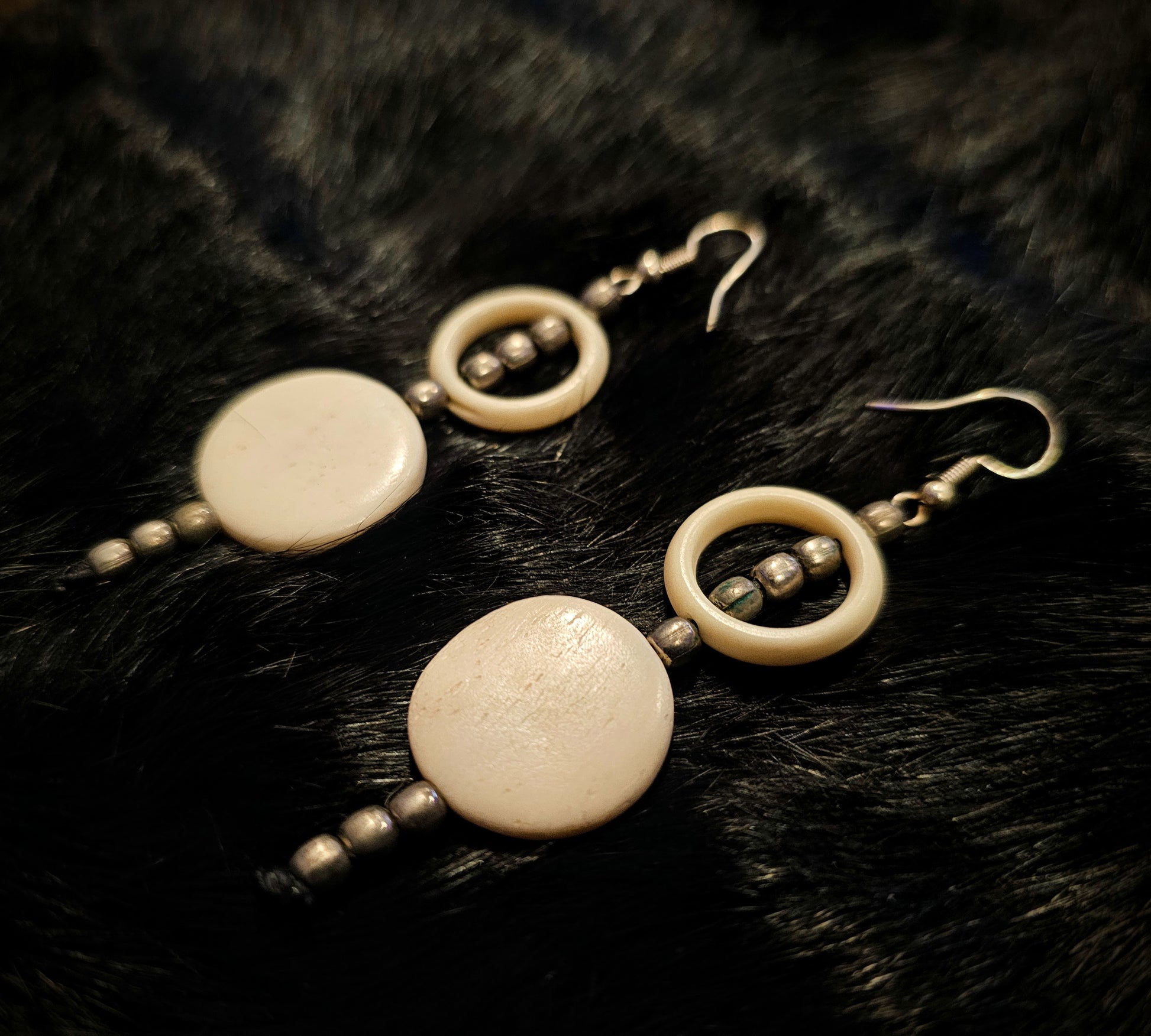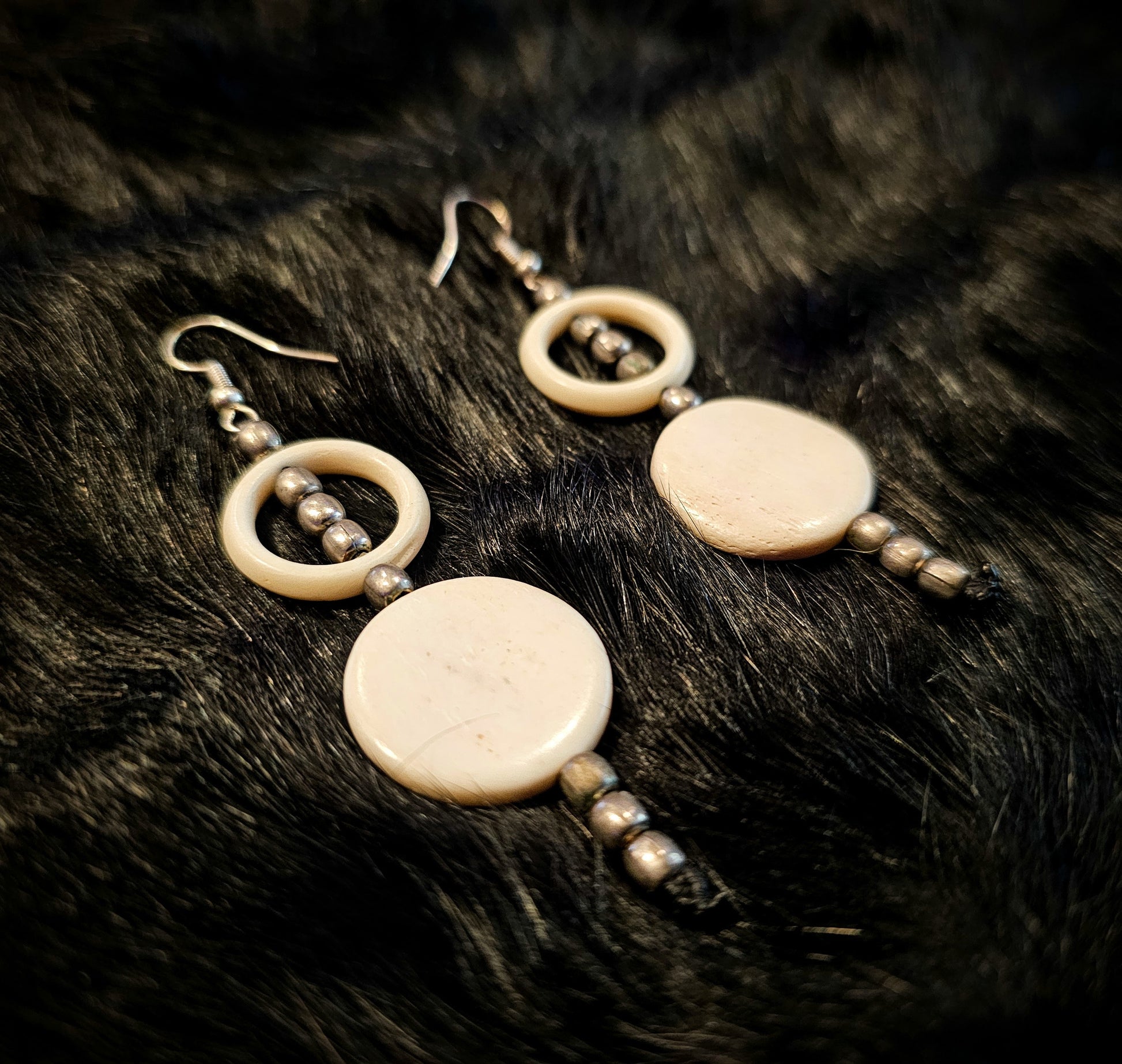 One of a kind handmade earrings featuring eight metal beads, a bone loop, and bone disc bead.  Nickel free ear wire.