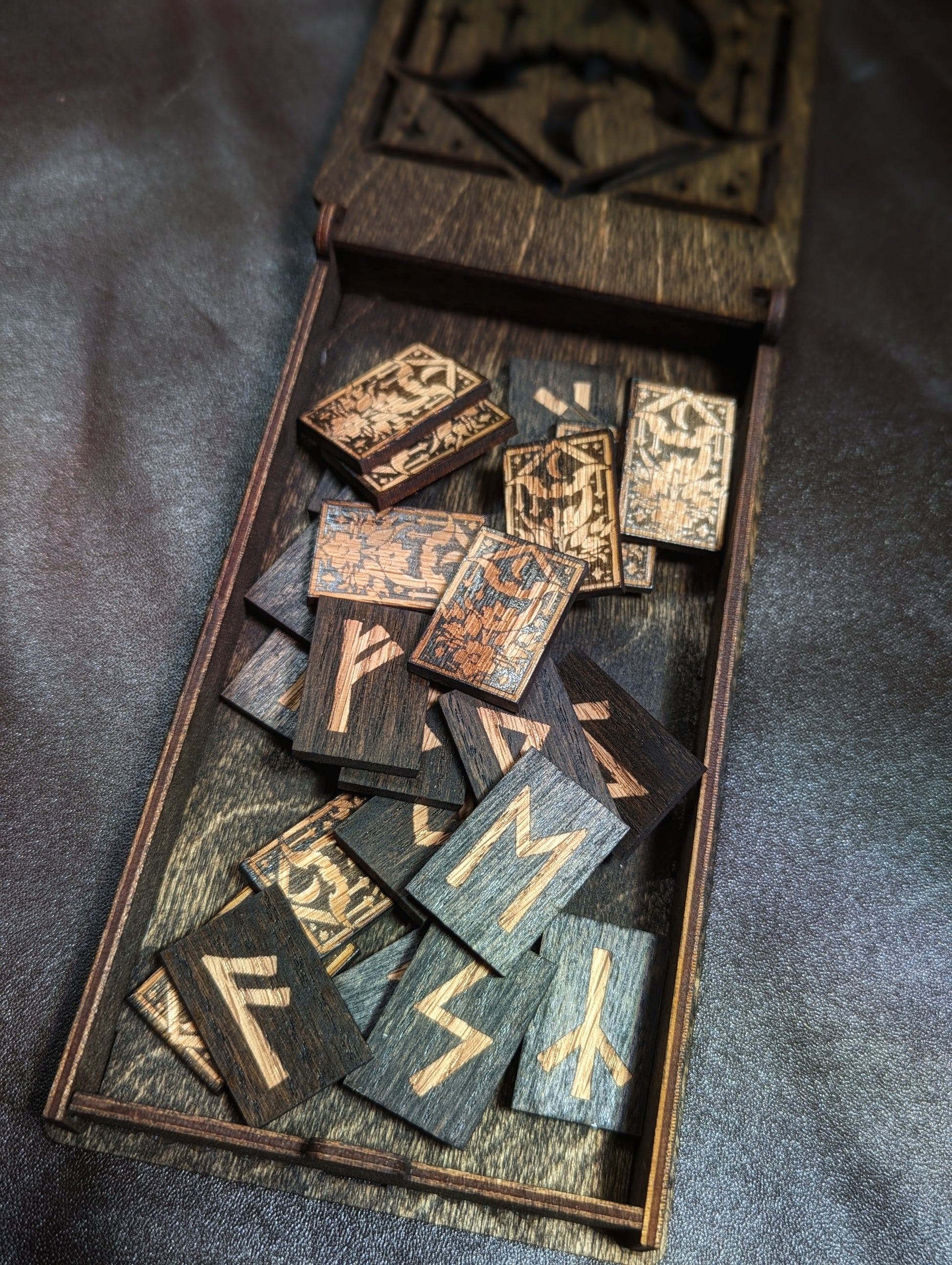 24 Elder Futhark runes made from birch, stained black. Engraved with original artwork featuring a crescent moon, bat, and night blooming flowers. Box lid cutout in same artwork.