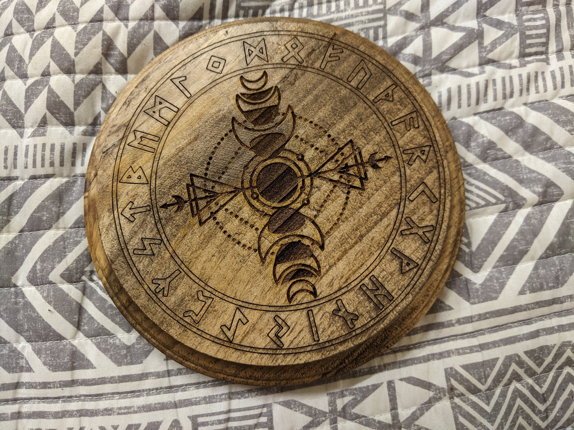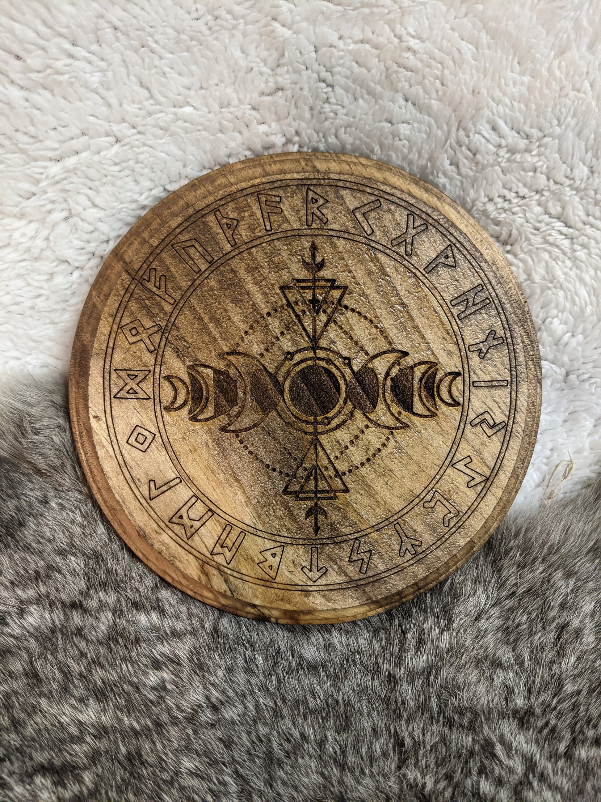 Wood burned Elder Futhark rune circle around moon phase design.