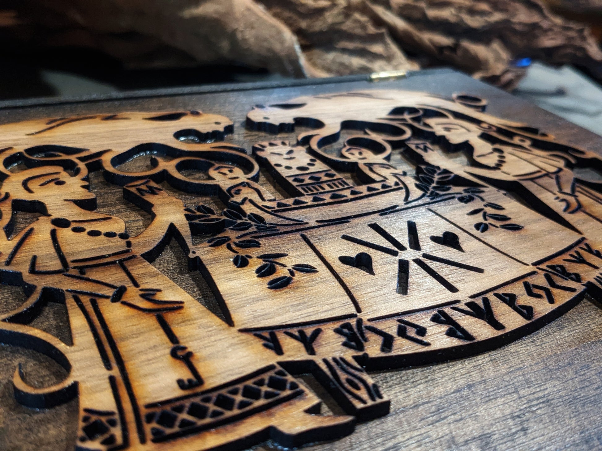 9"x7" stained pine and cedar wood box, with walnut wood cut out front featuring Nordic women at an altar with offerings, surrounded by their ancestors.