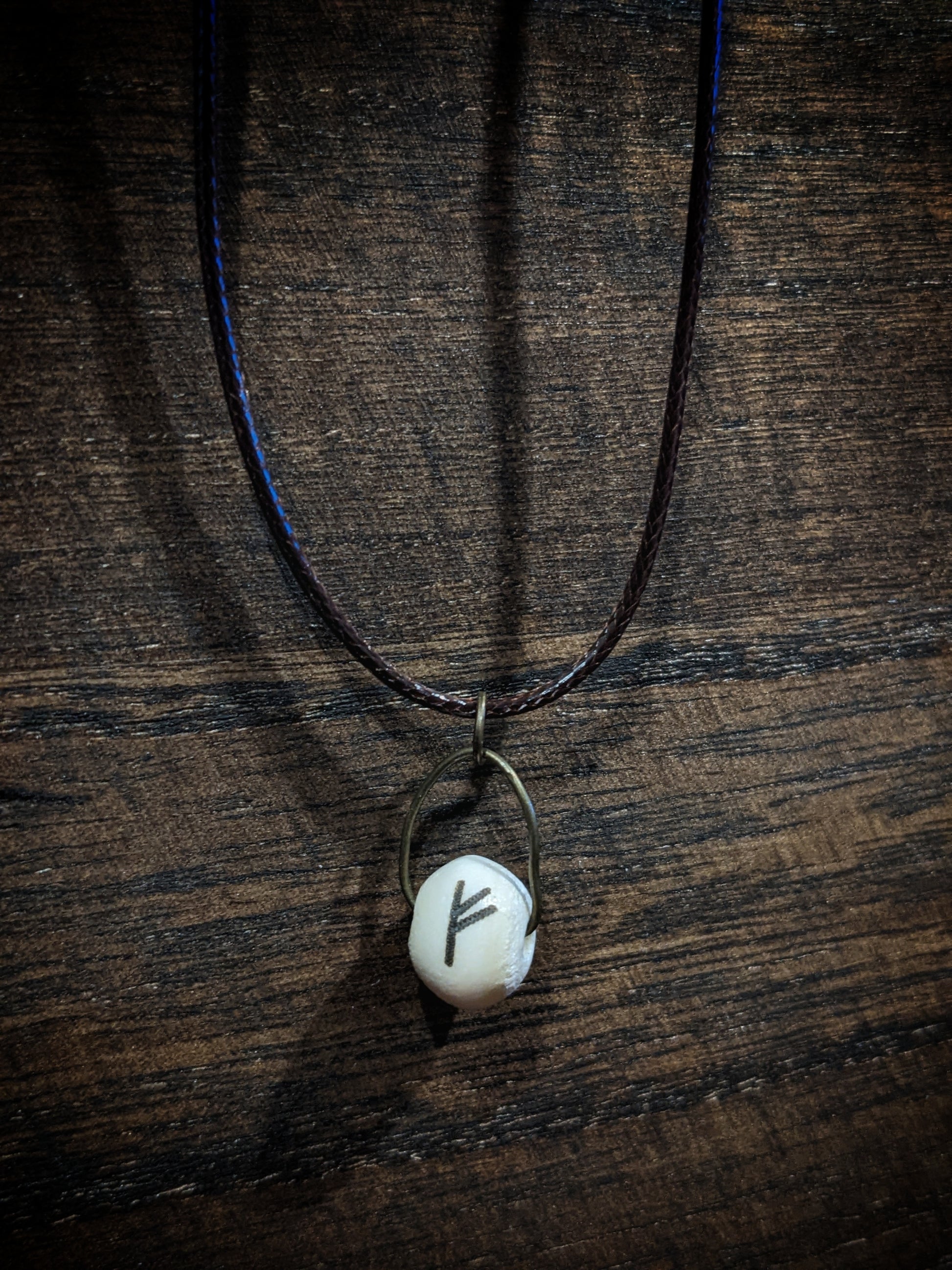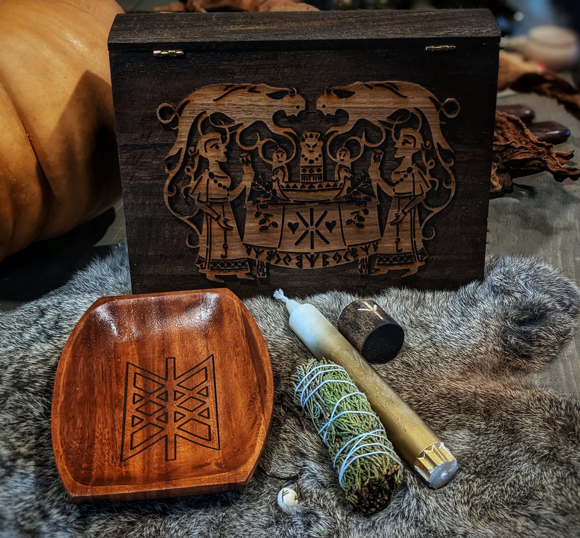 Inside is a bone bead necklace on a waxed cord, burned with fehu, a hand carved algiz rune candle cup, a gold embellished taper candle scored with the web of wyrd, a bundle of juniper, and a web of wyrd burned wood offering tray.