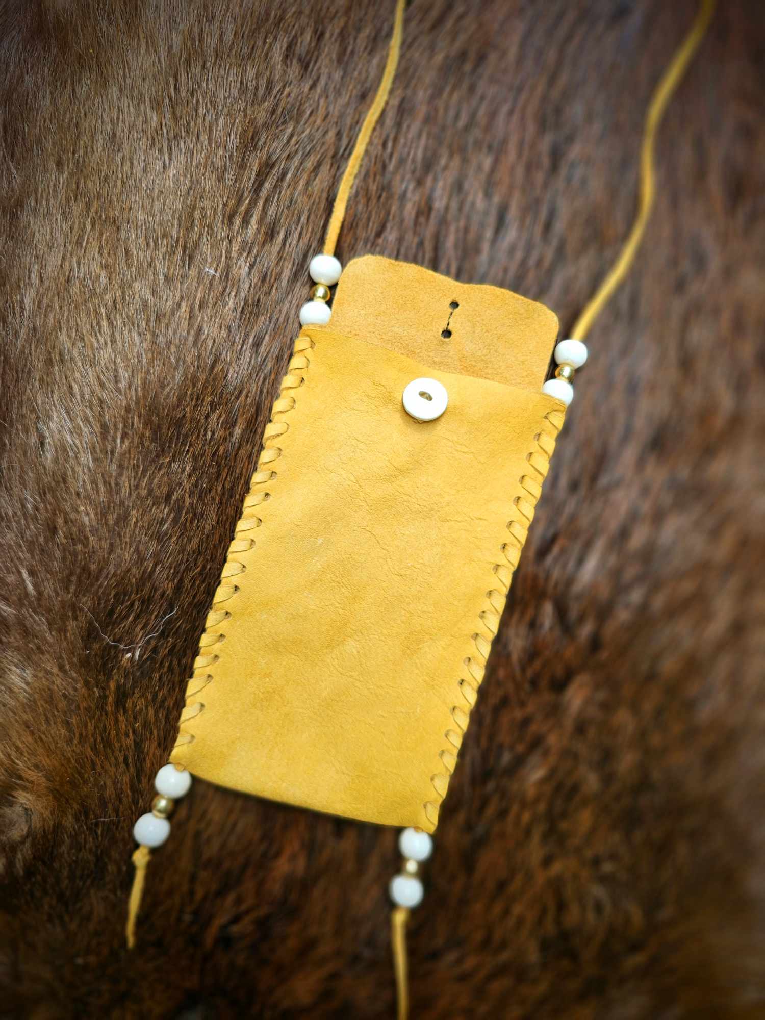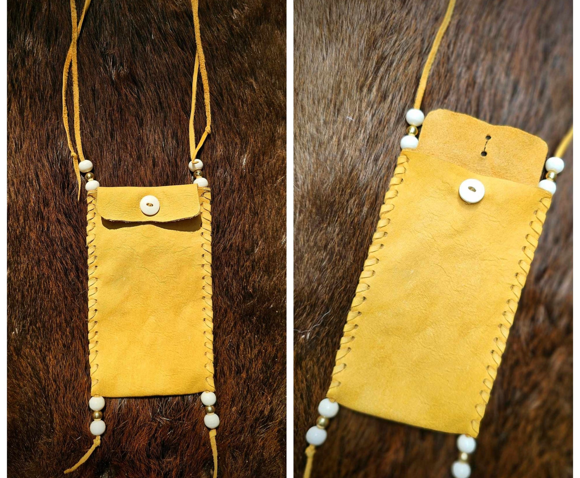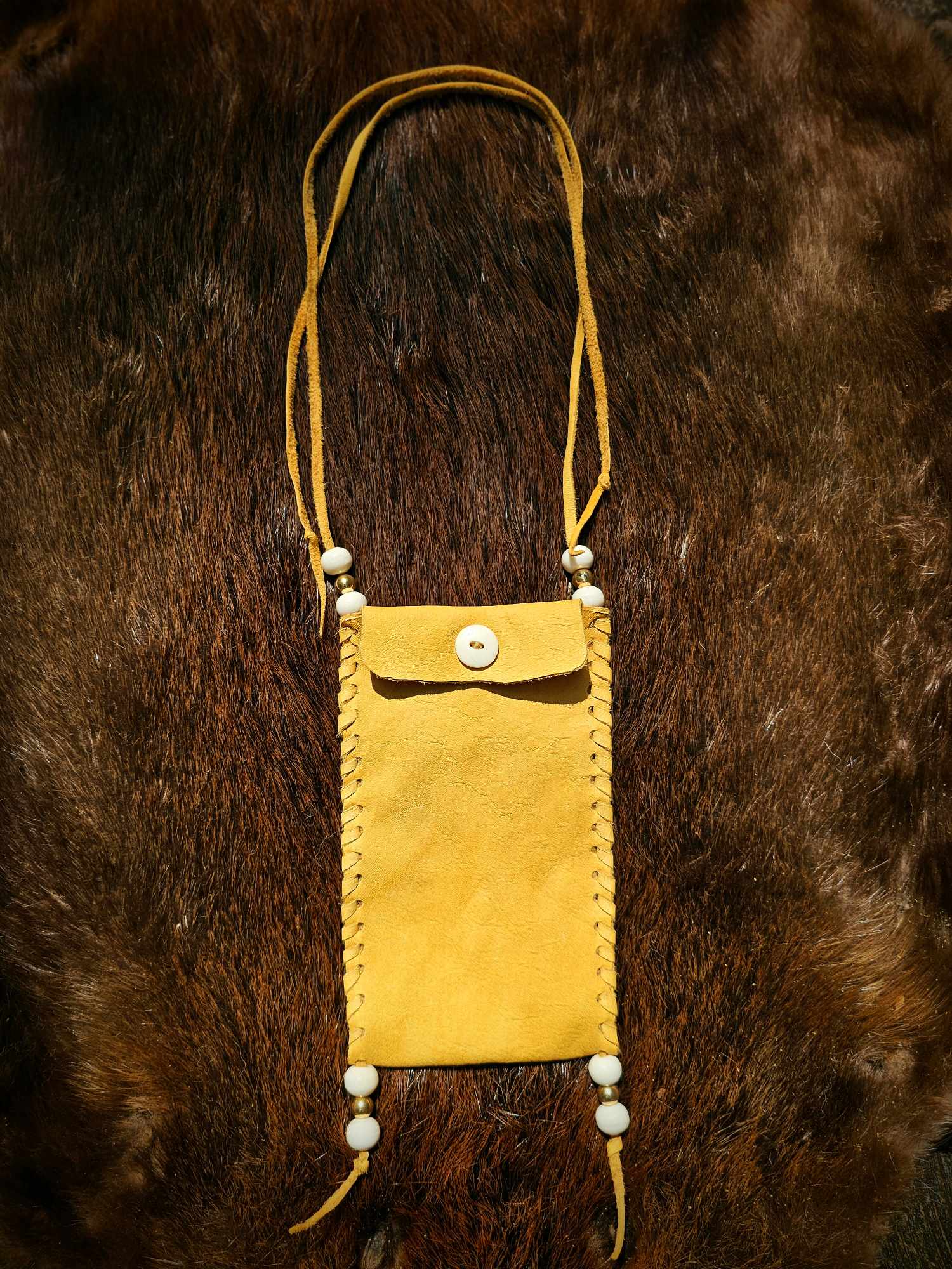 Natural Gold Buckskin Bag, with brass bead and Bison bone button and bead. This one measures 6.5" by 4" with plenty of cord to wear comfortably at just about any preferred length. Holds phone, money for practical use any time.