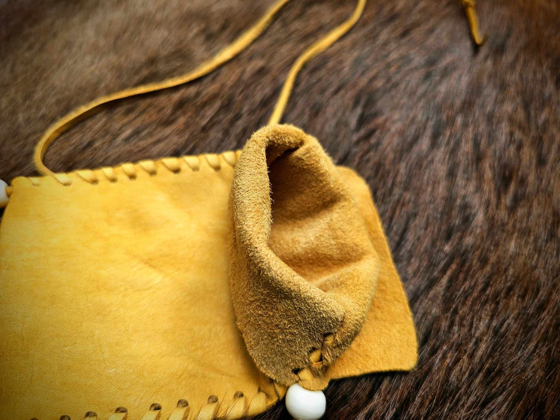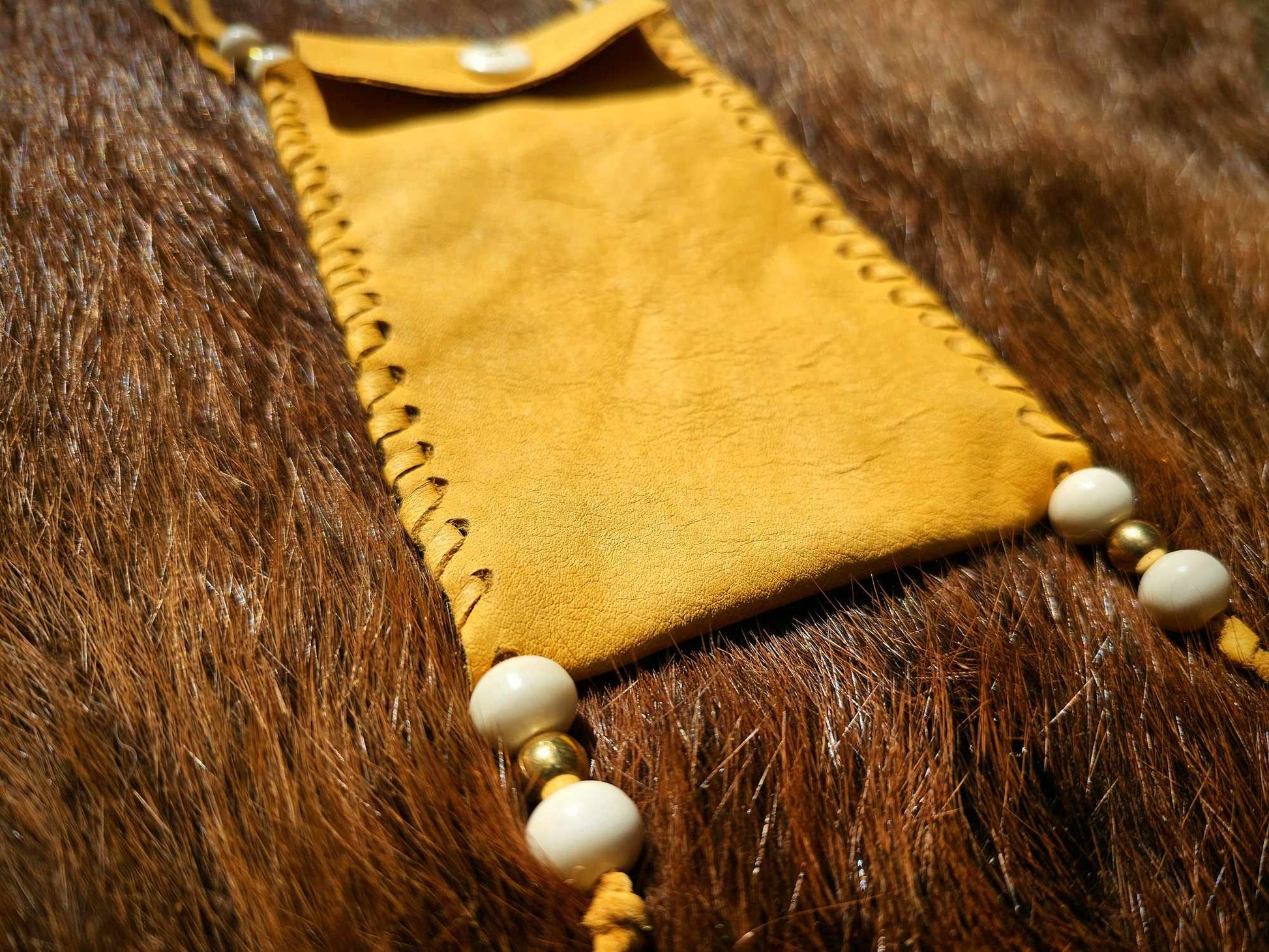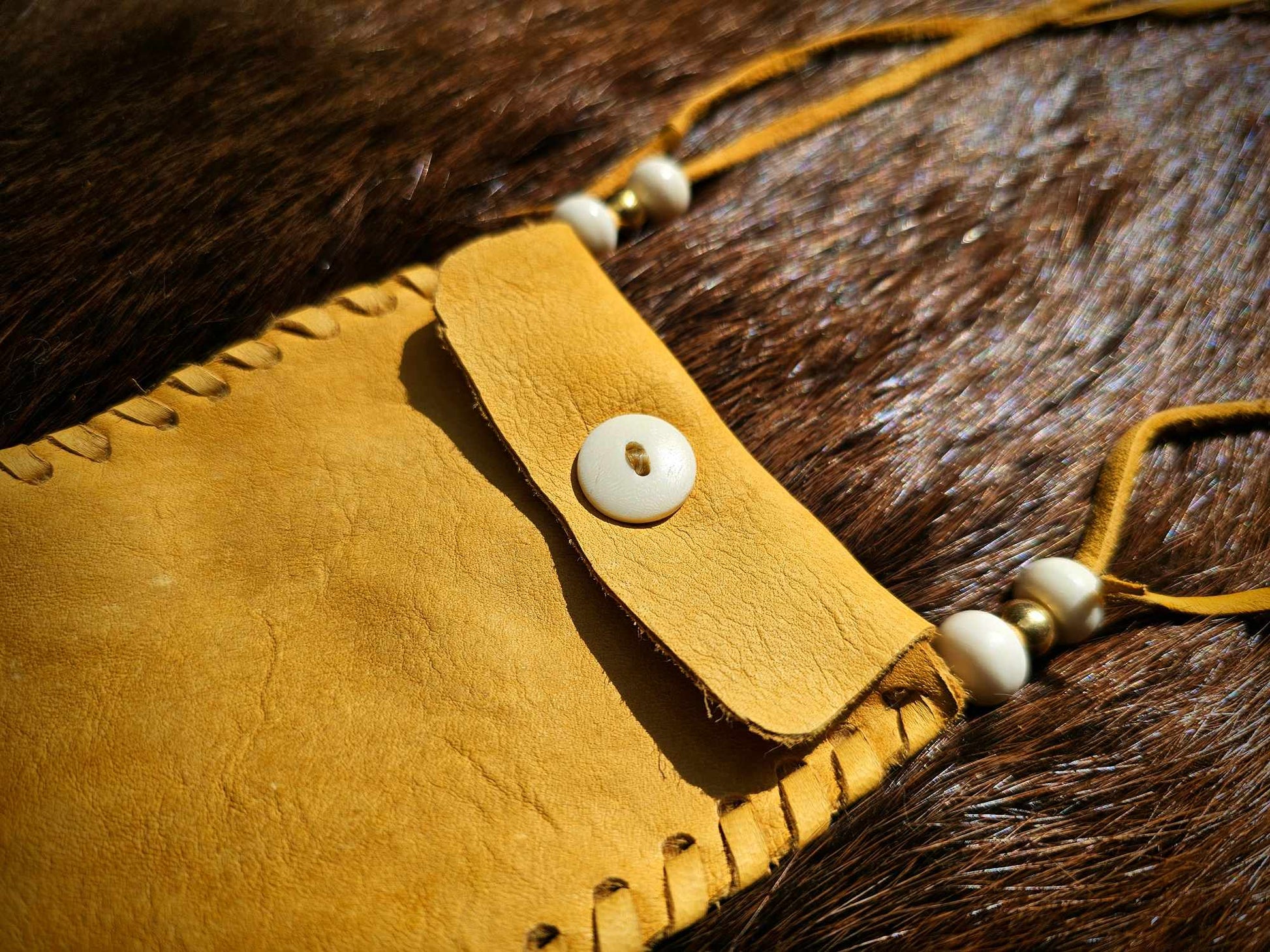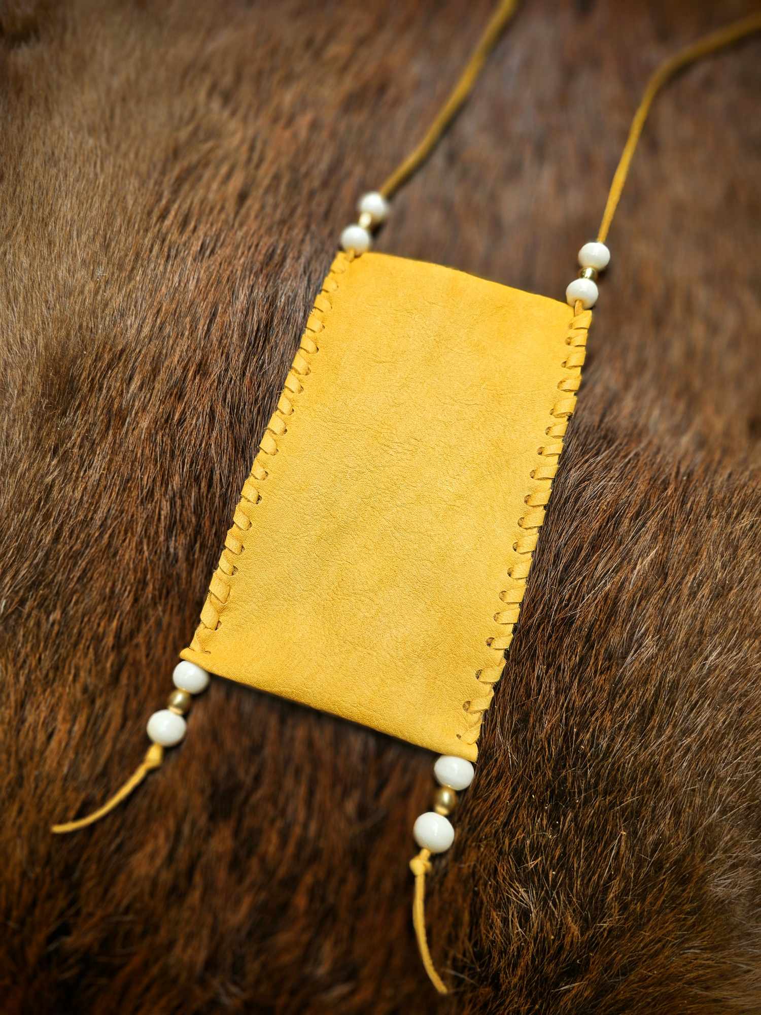 Natural Gold Buckskin Bag, with brass bead and Bison bone button and bead. This one measures 6.5" by 4" with plenty of cord to wear comfortably at just about any preferred length. Holds phone, money for practical use any time.