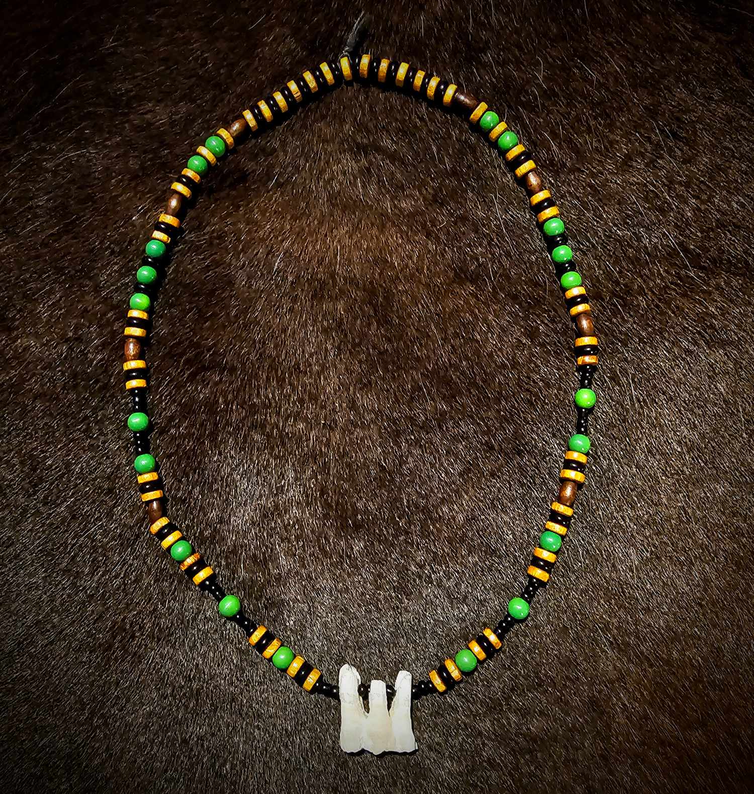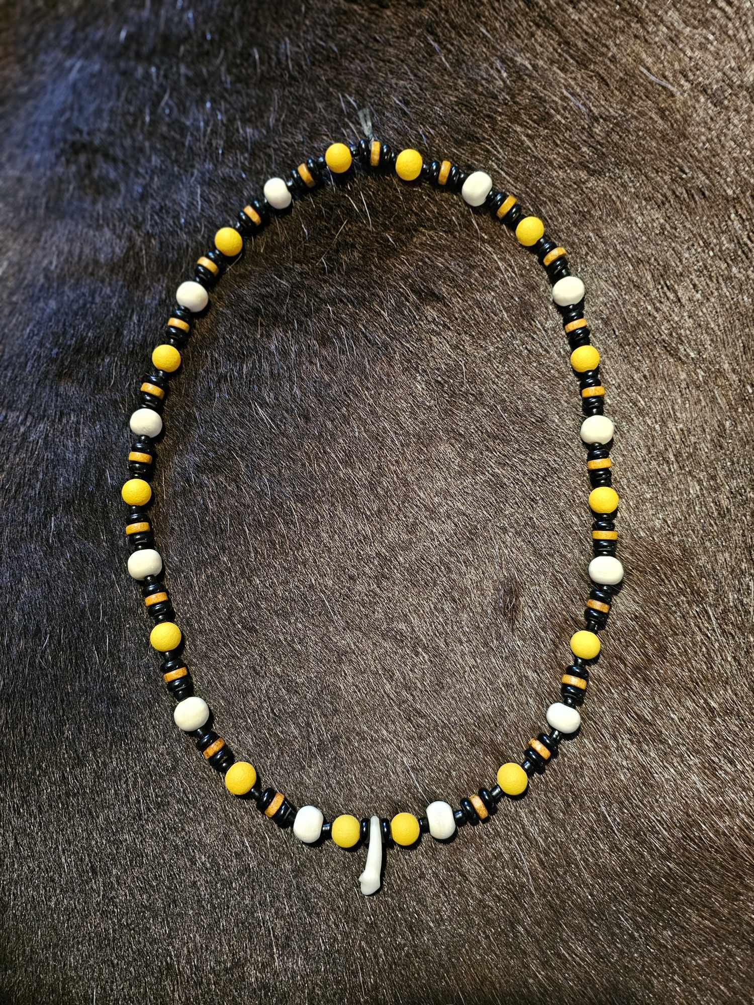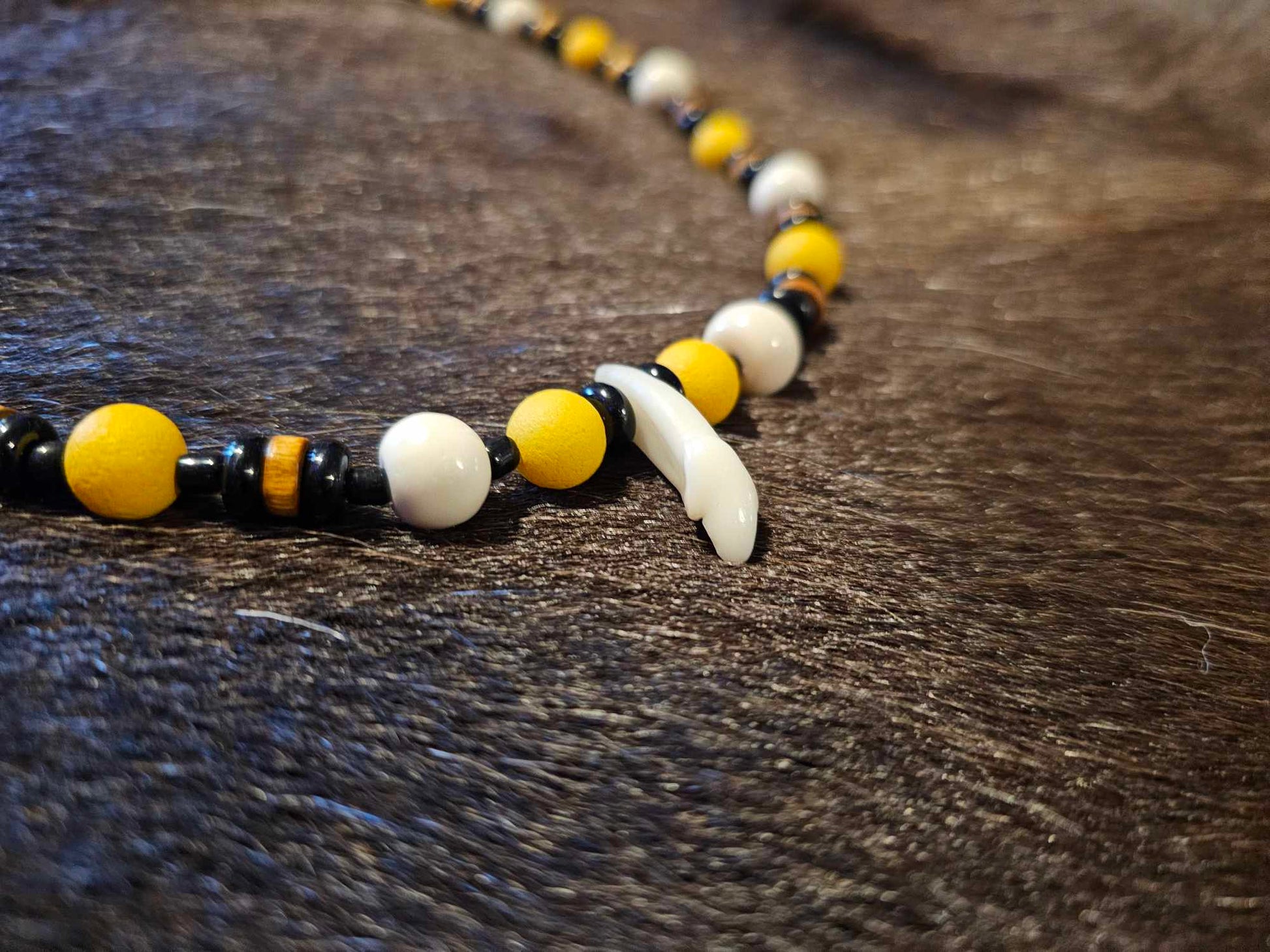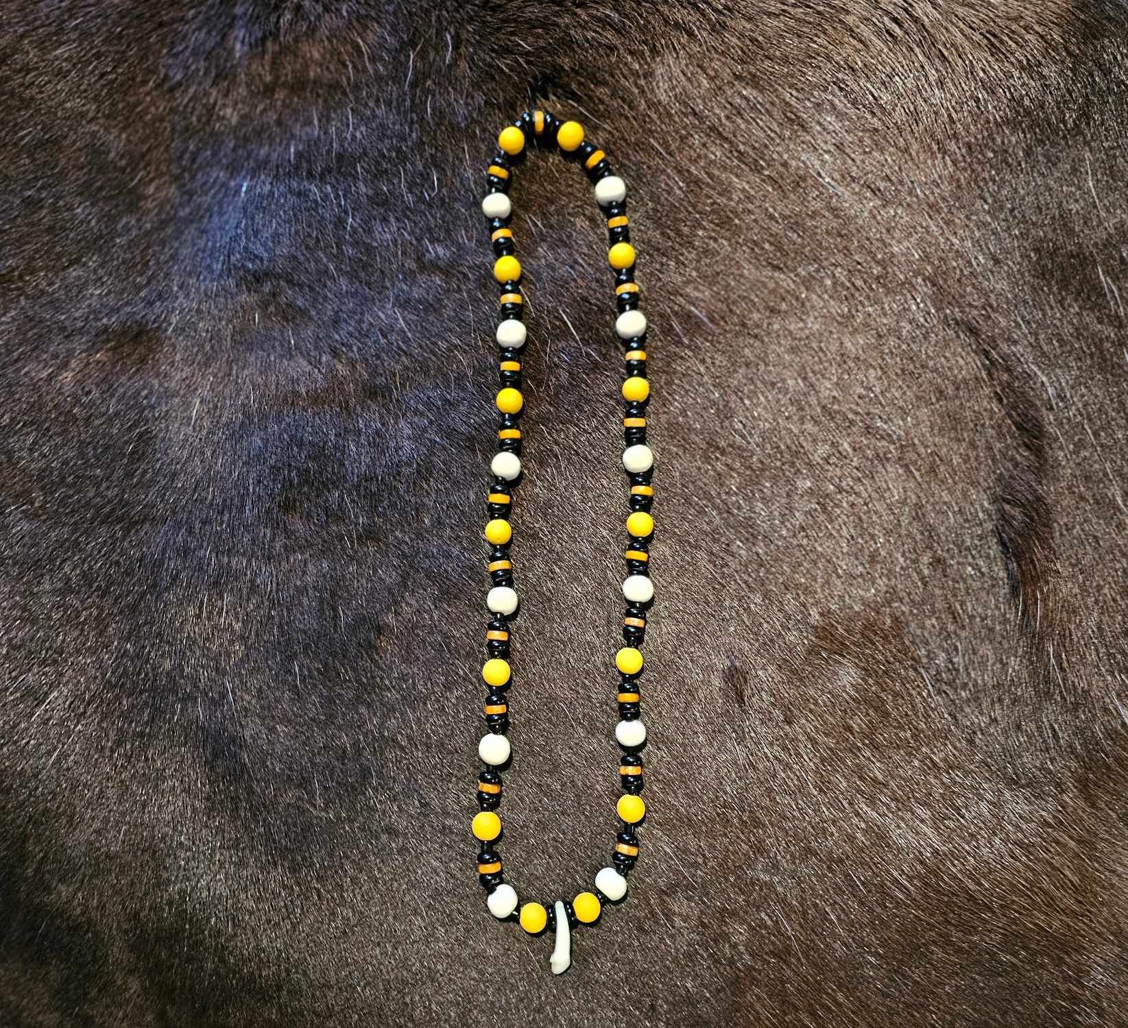 1. Black and yellow glass beads, white bone beads, with a wolf tooth pendant.