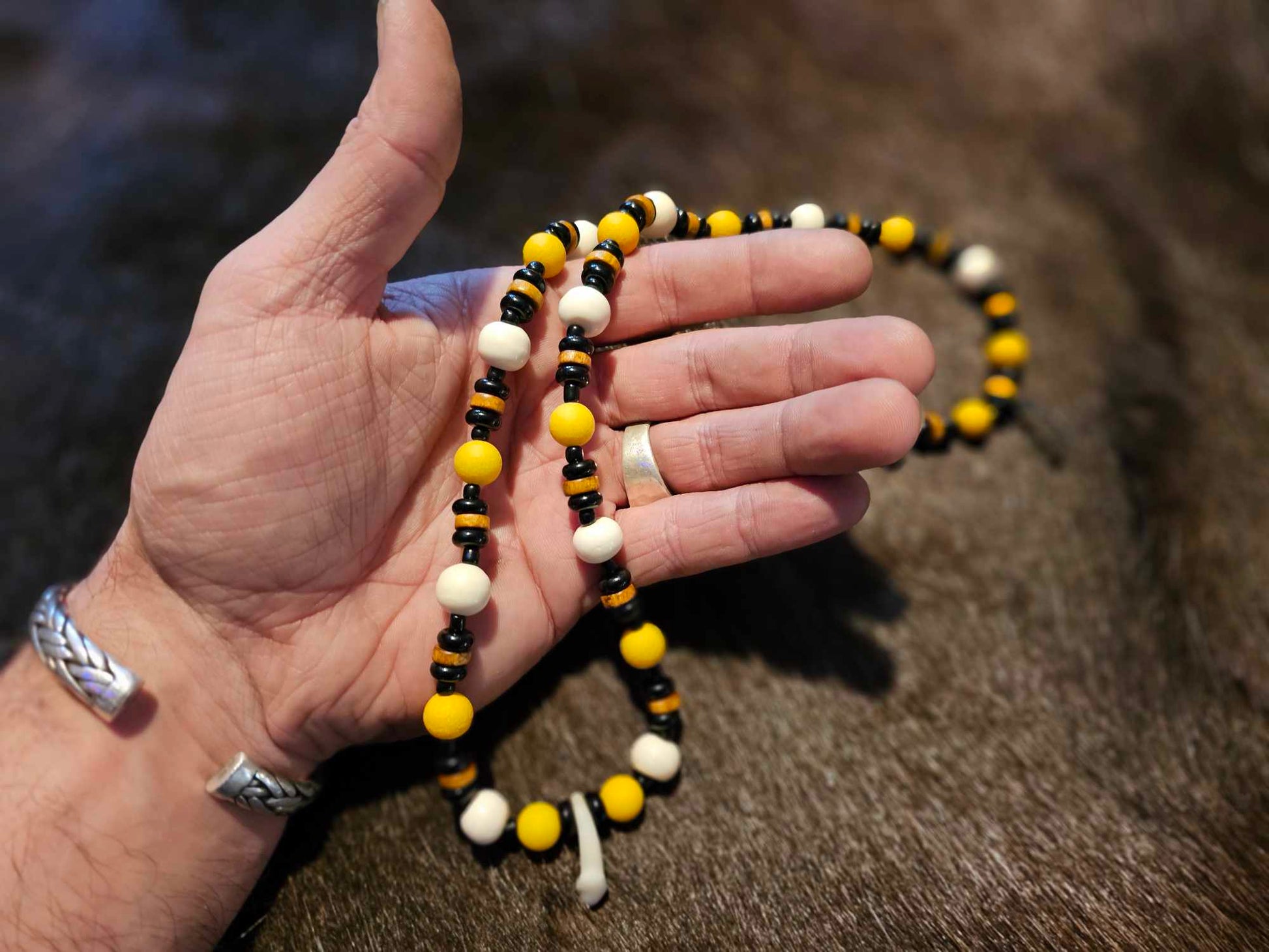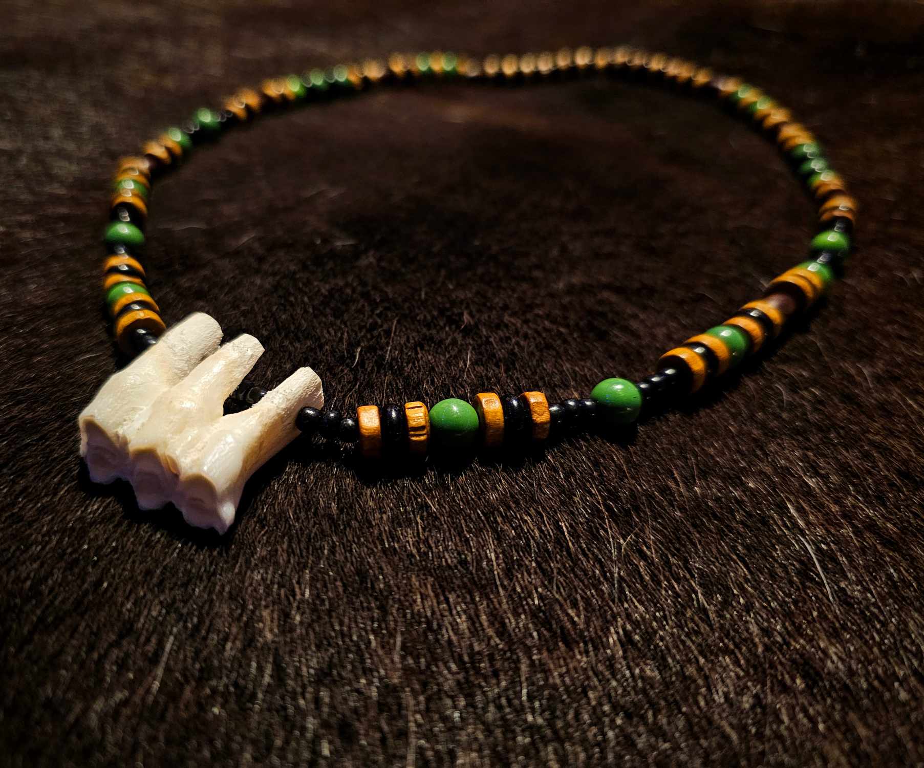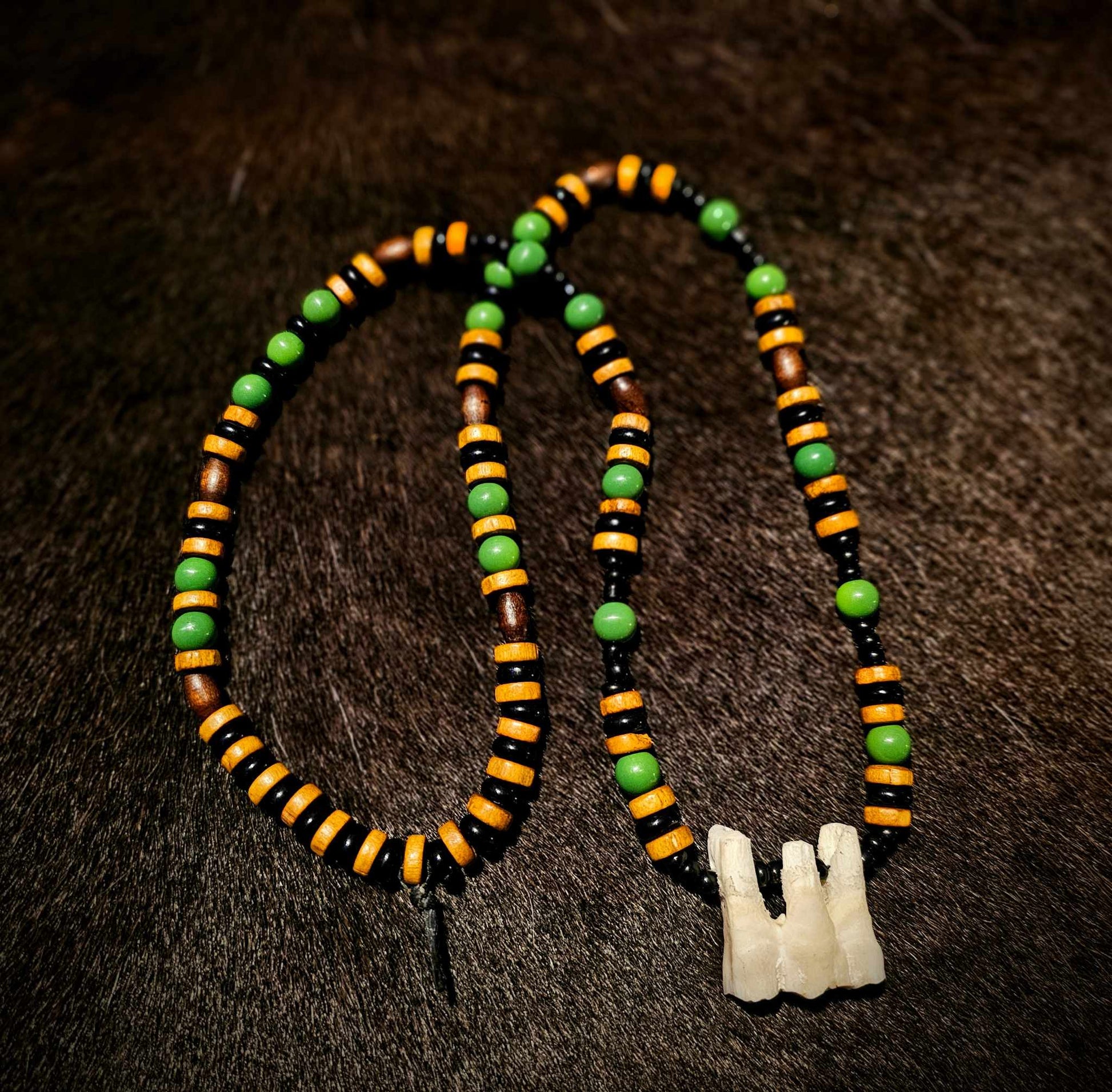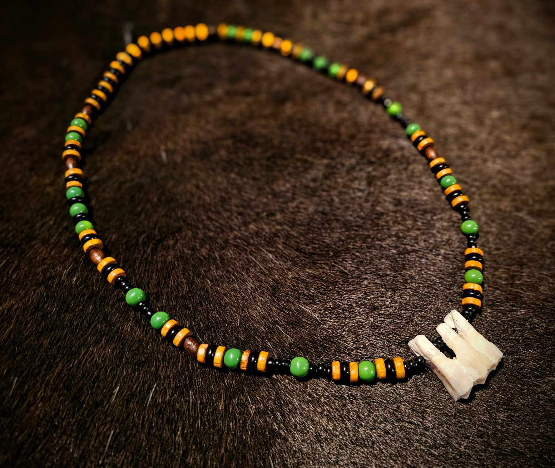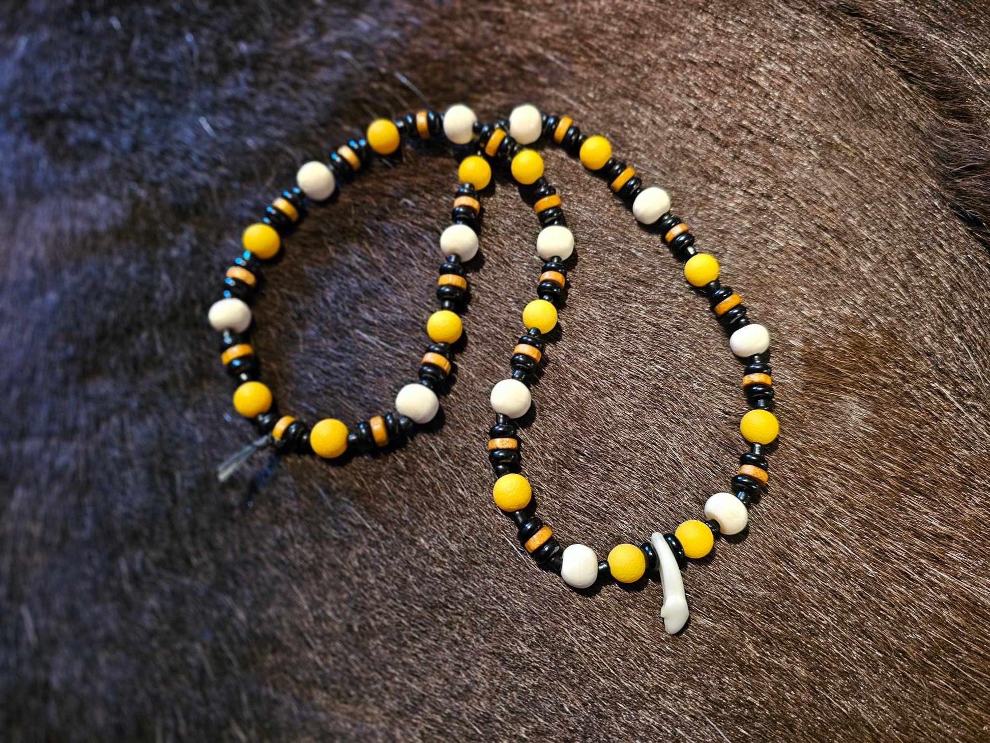 1. Black and yellow glass beads, white bone beads, with a wolf tooth pendant.