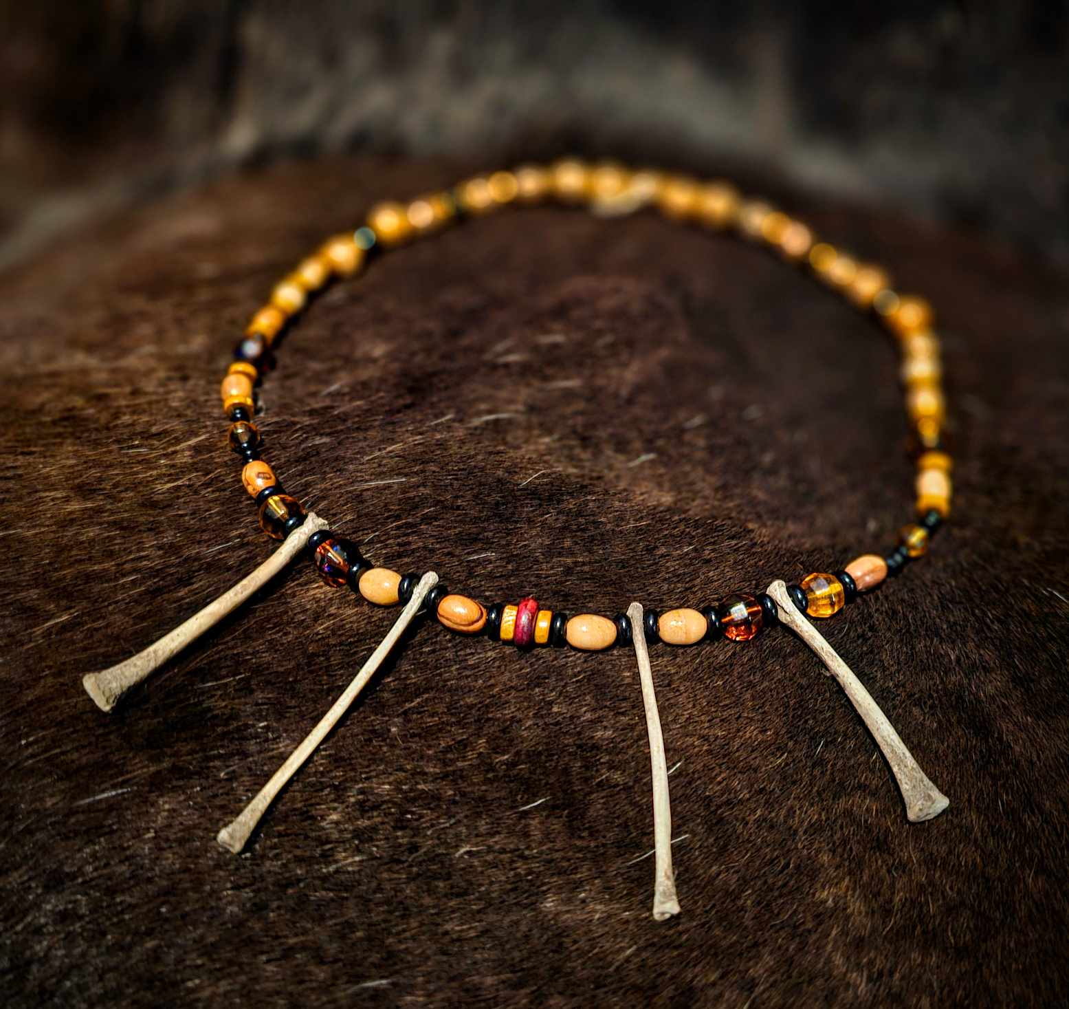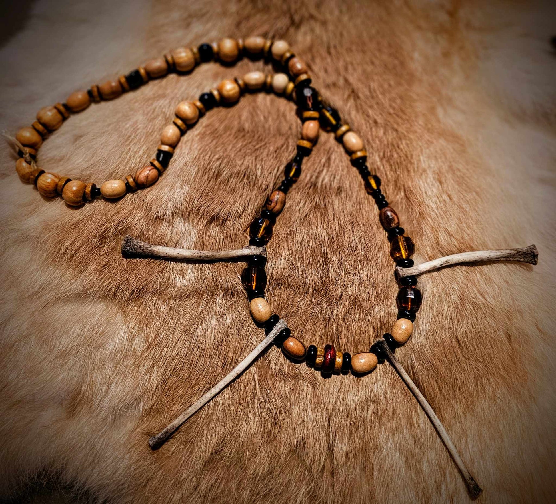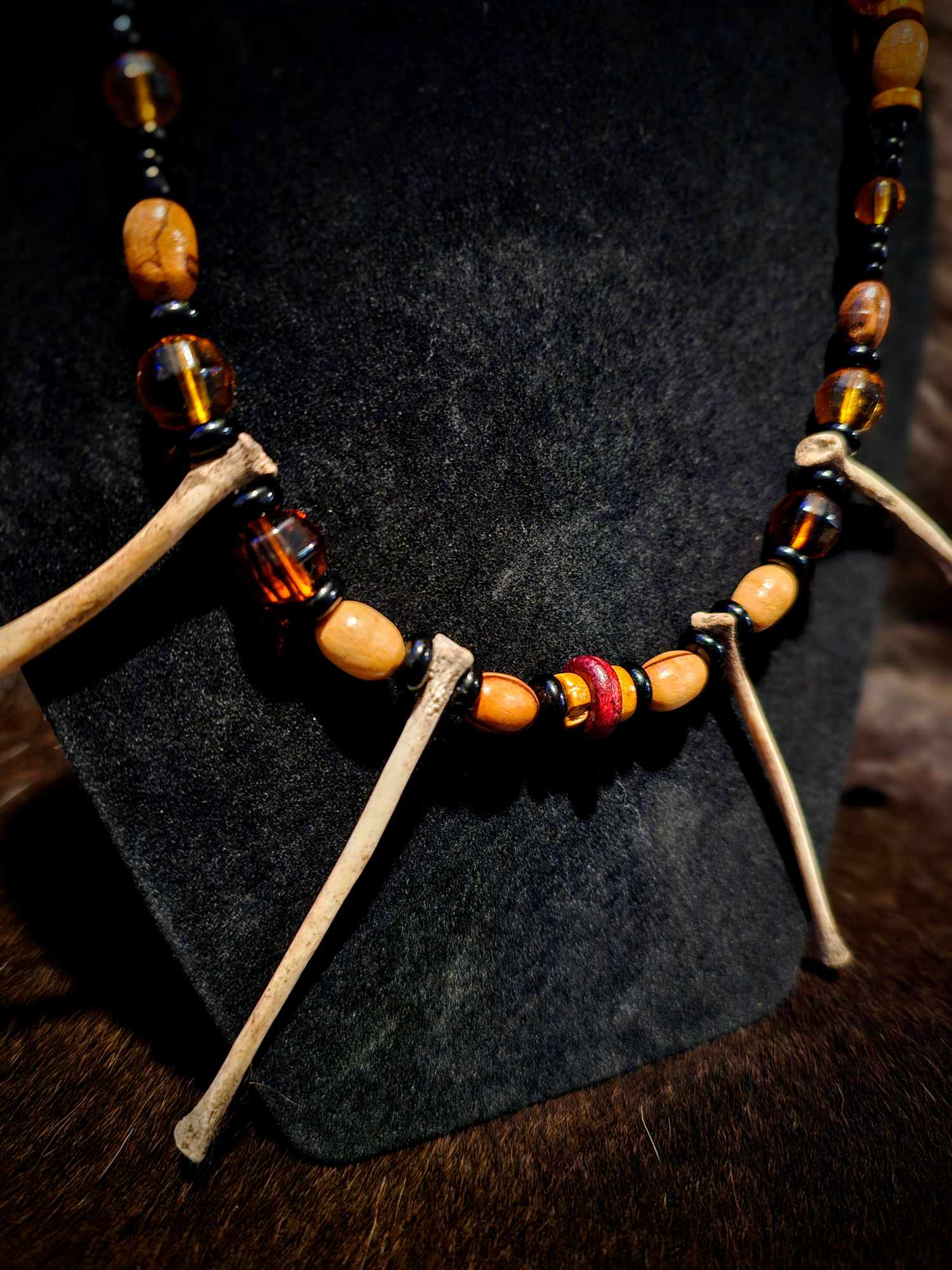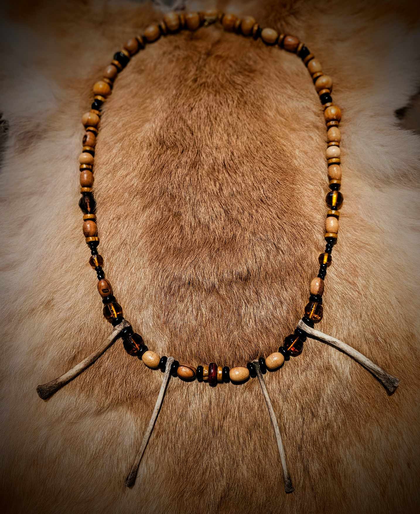 4. Wood, black and amber glass beads with rabbit bones.