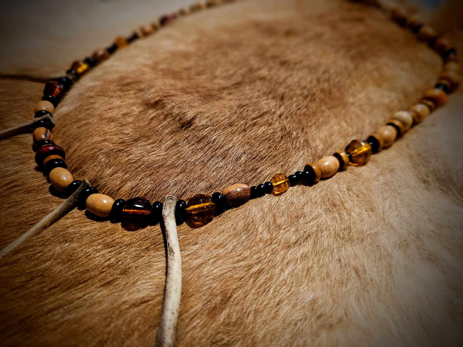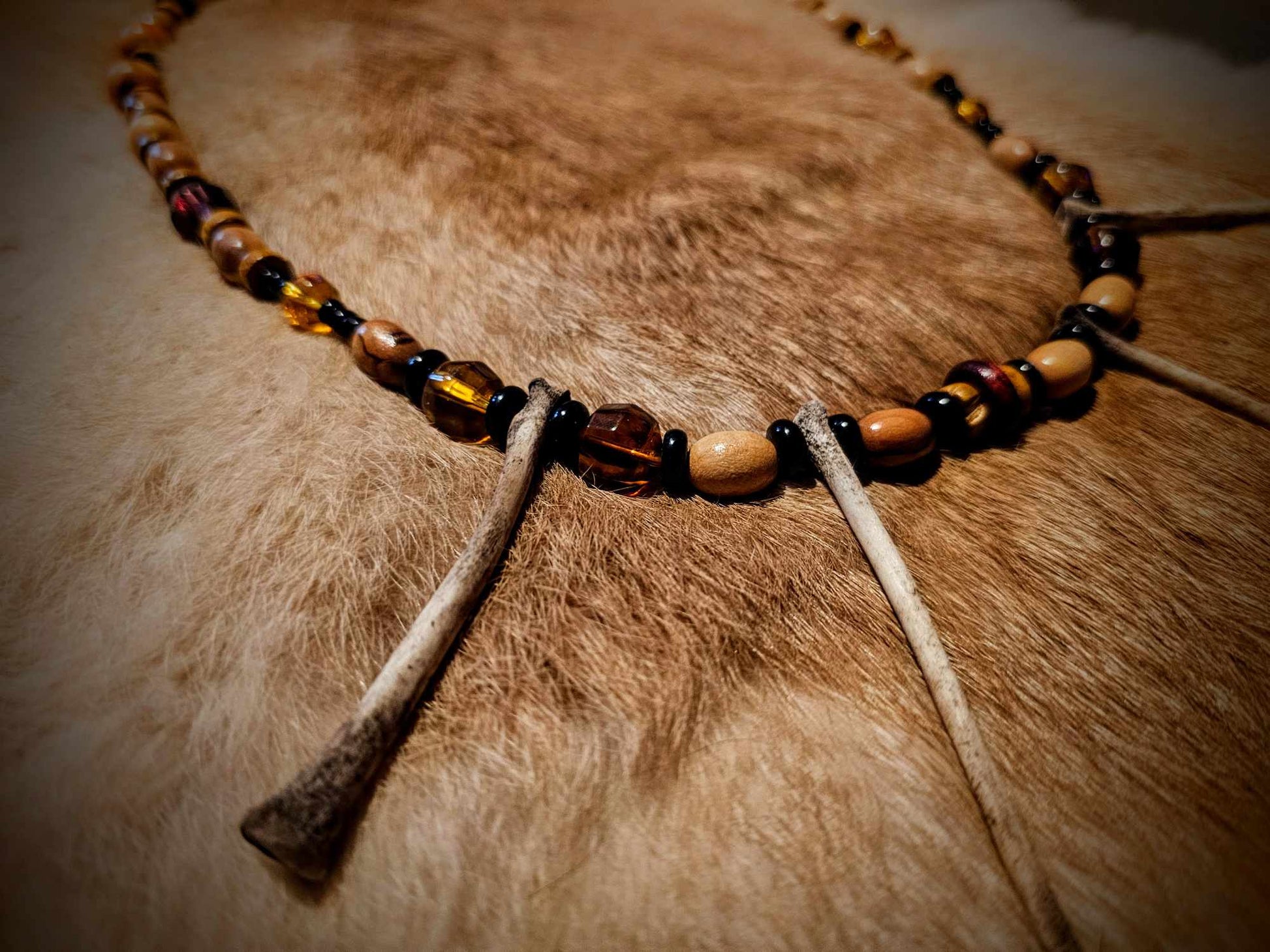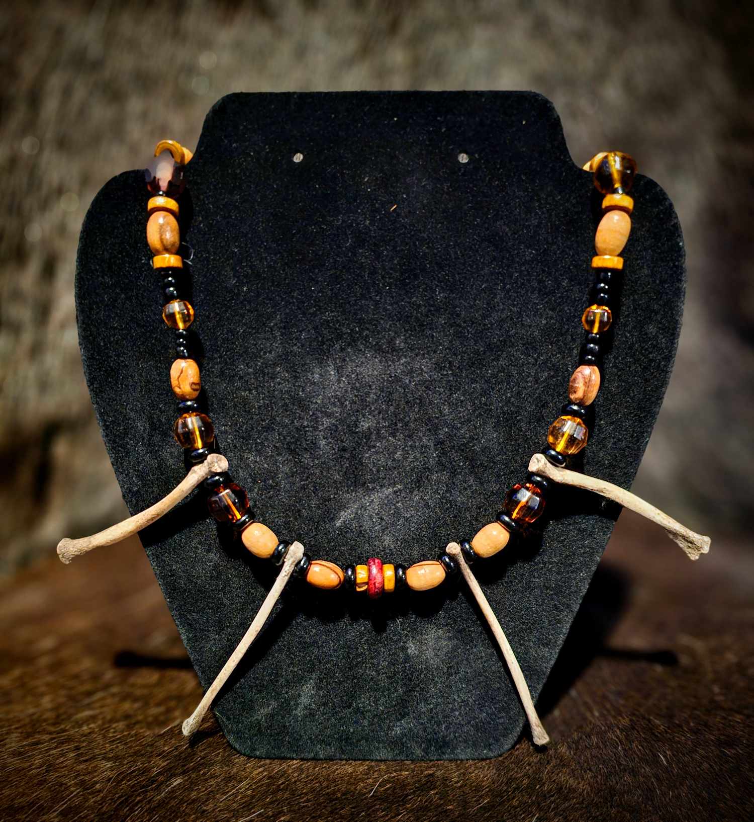 4. Wood, black and amber glass beads with rabbit bones.
