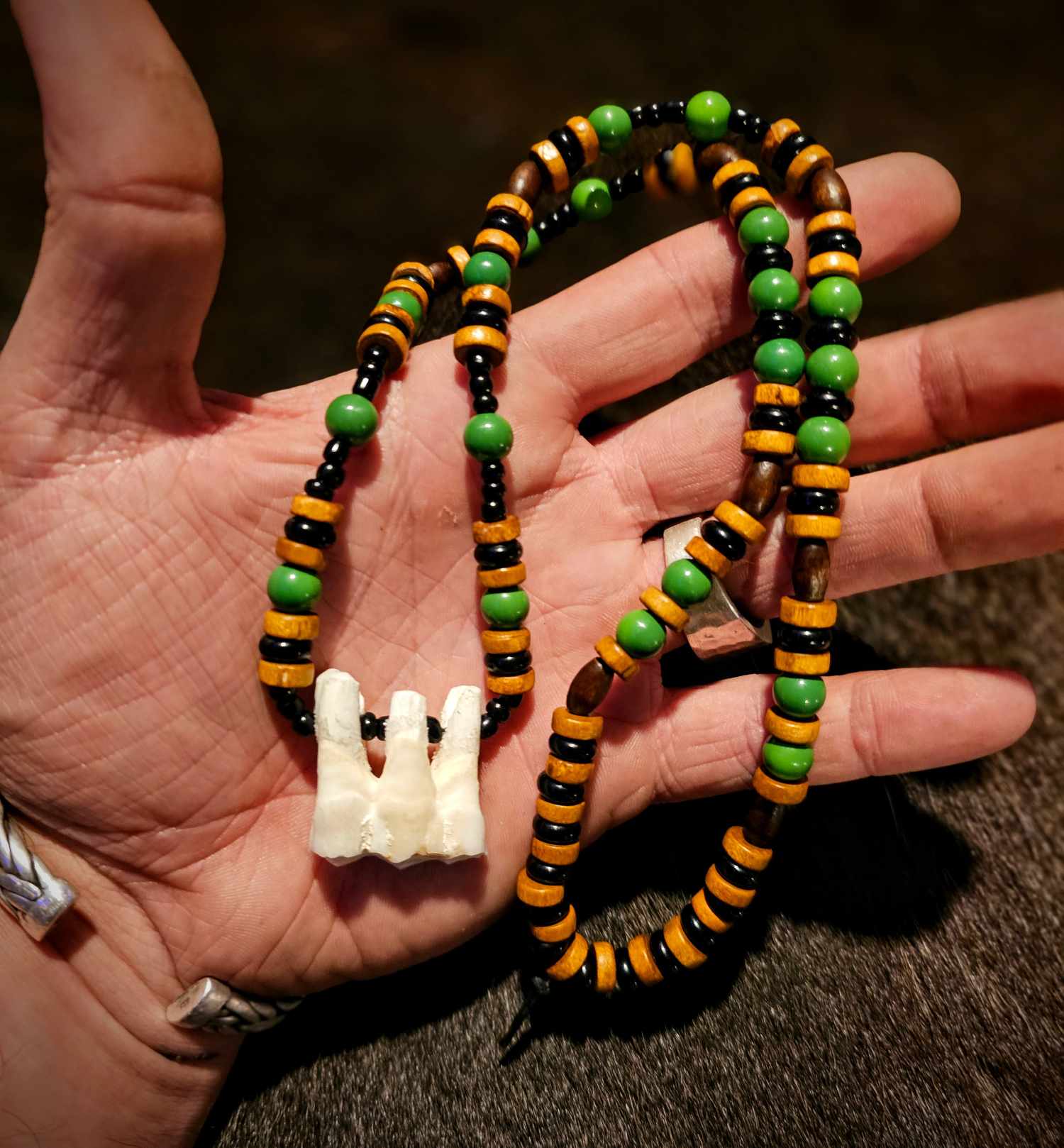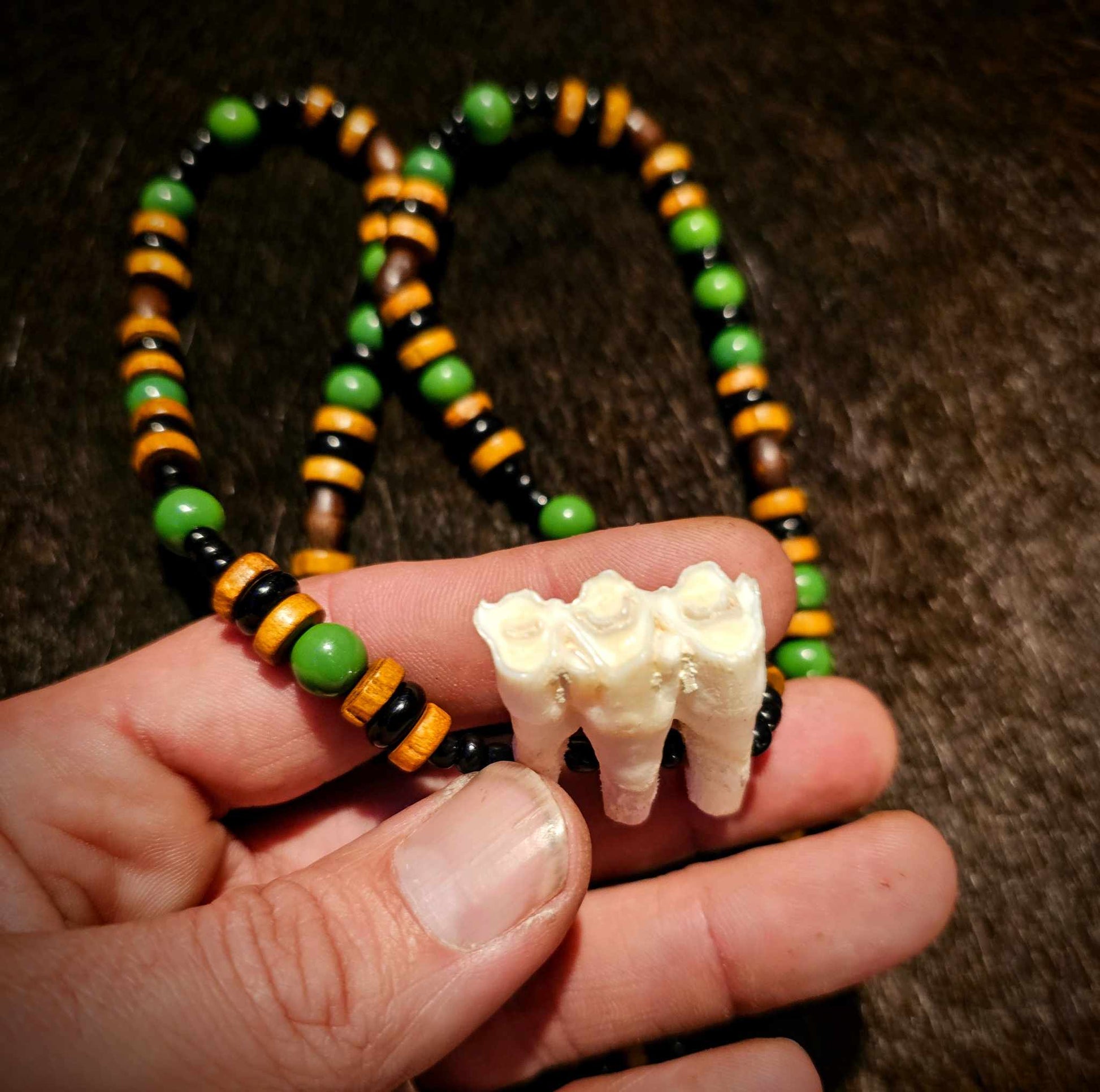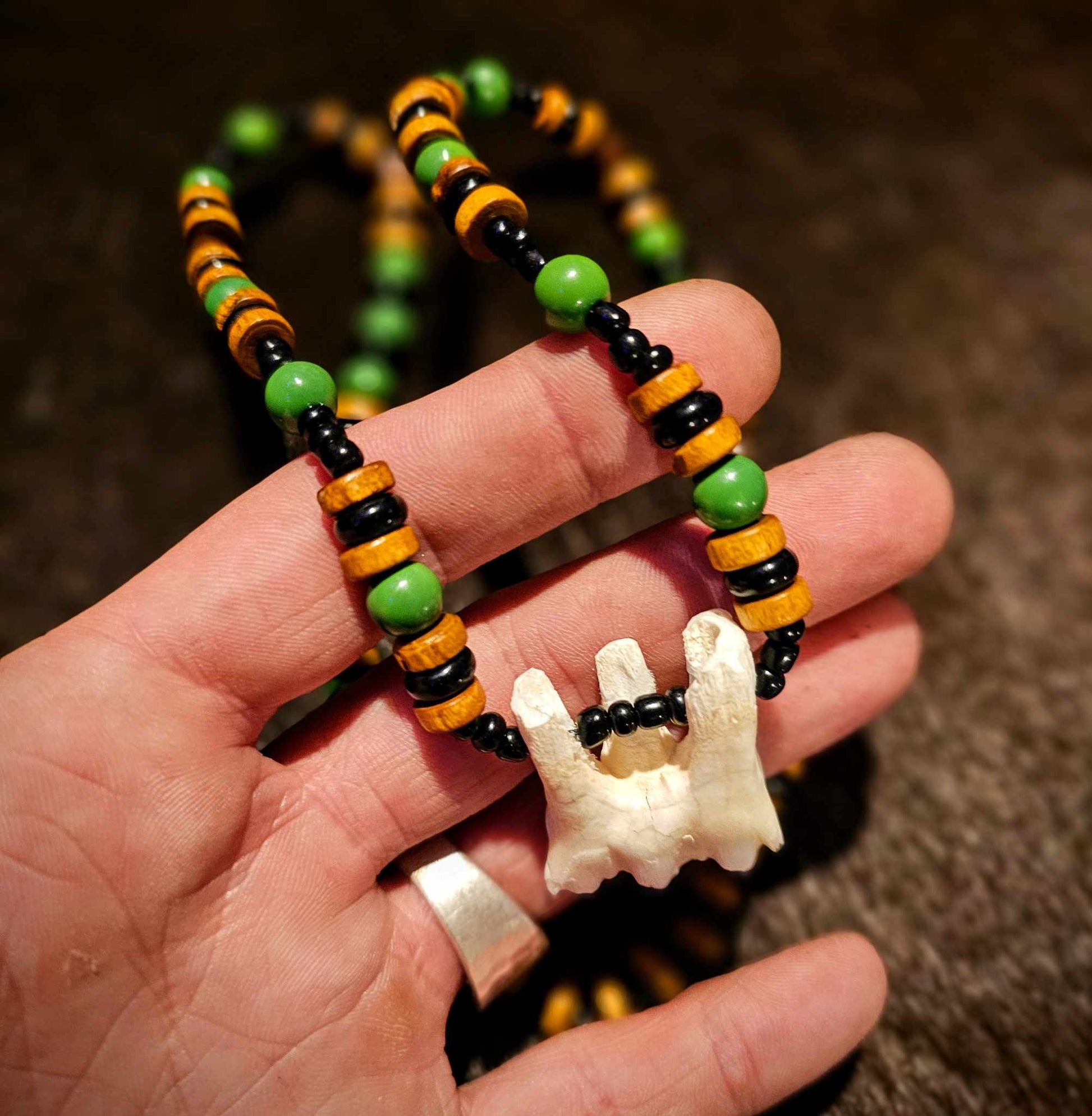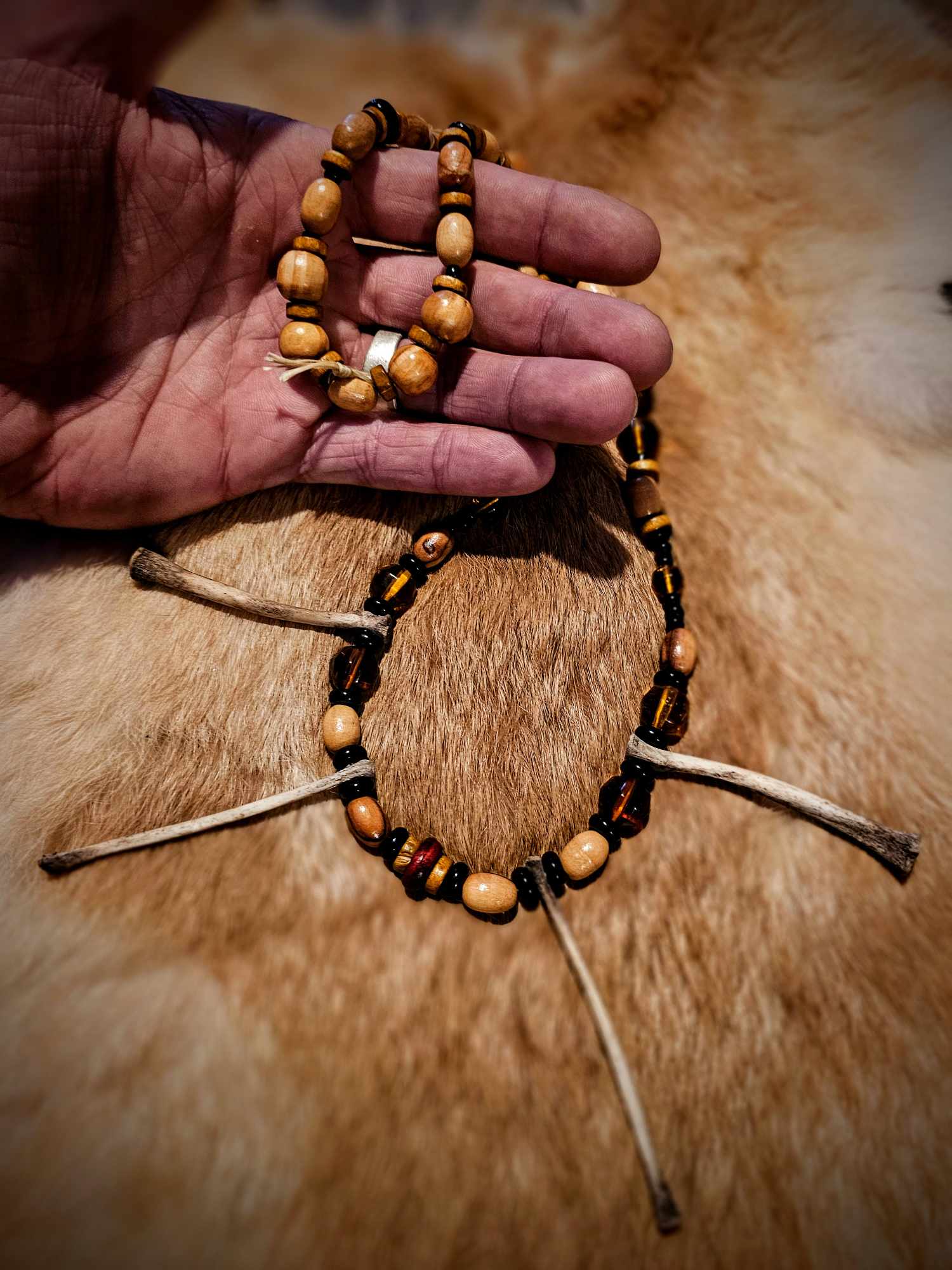4. Wood, black and amber glass beads with rabbit bones.