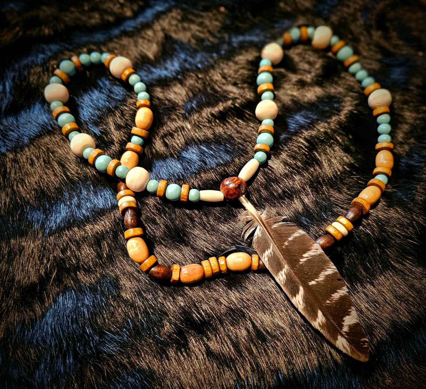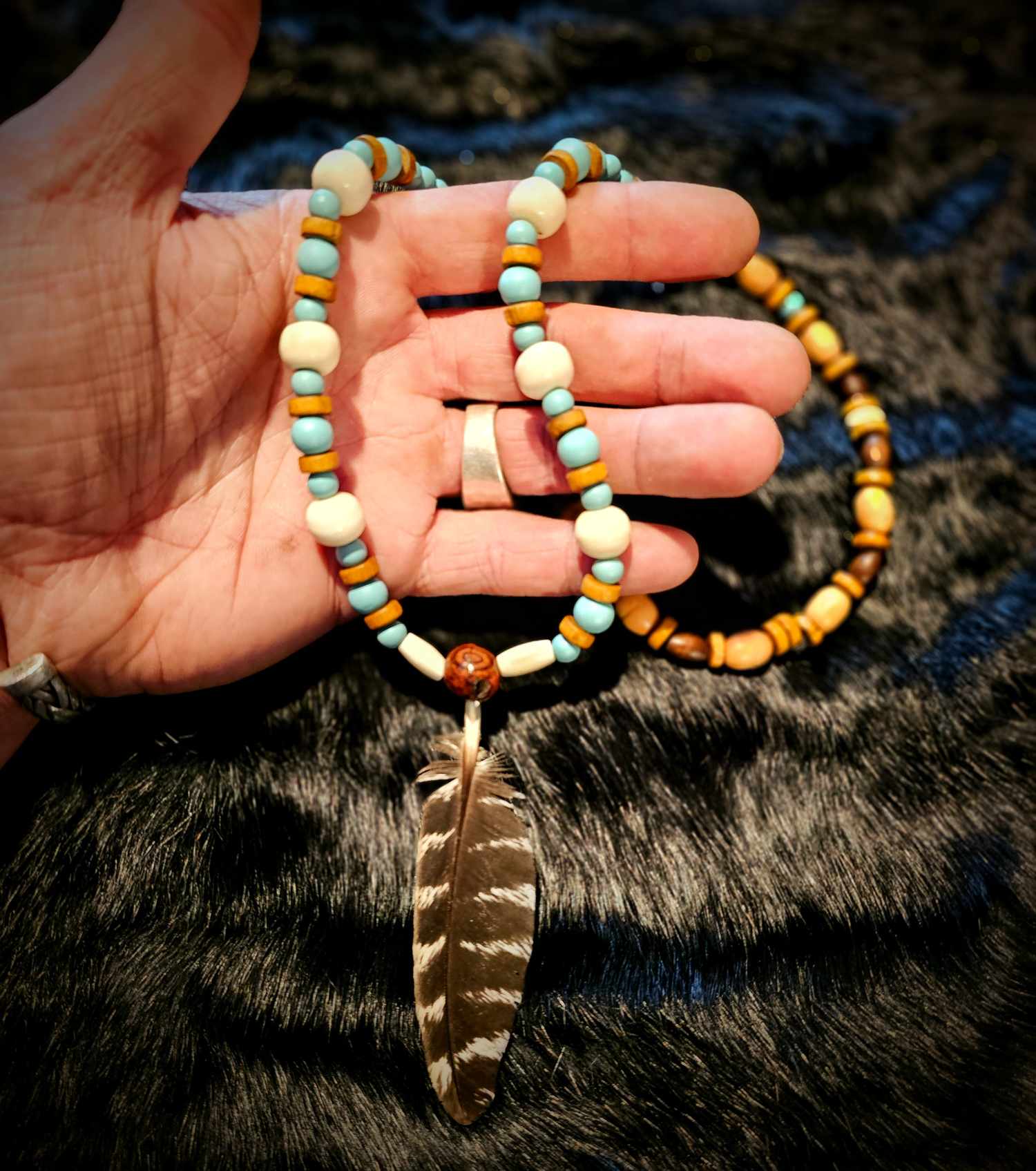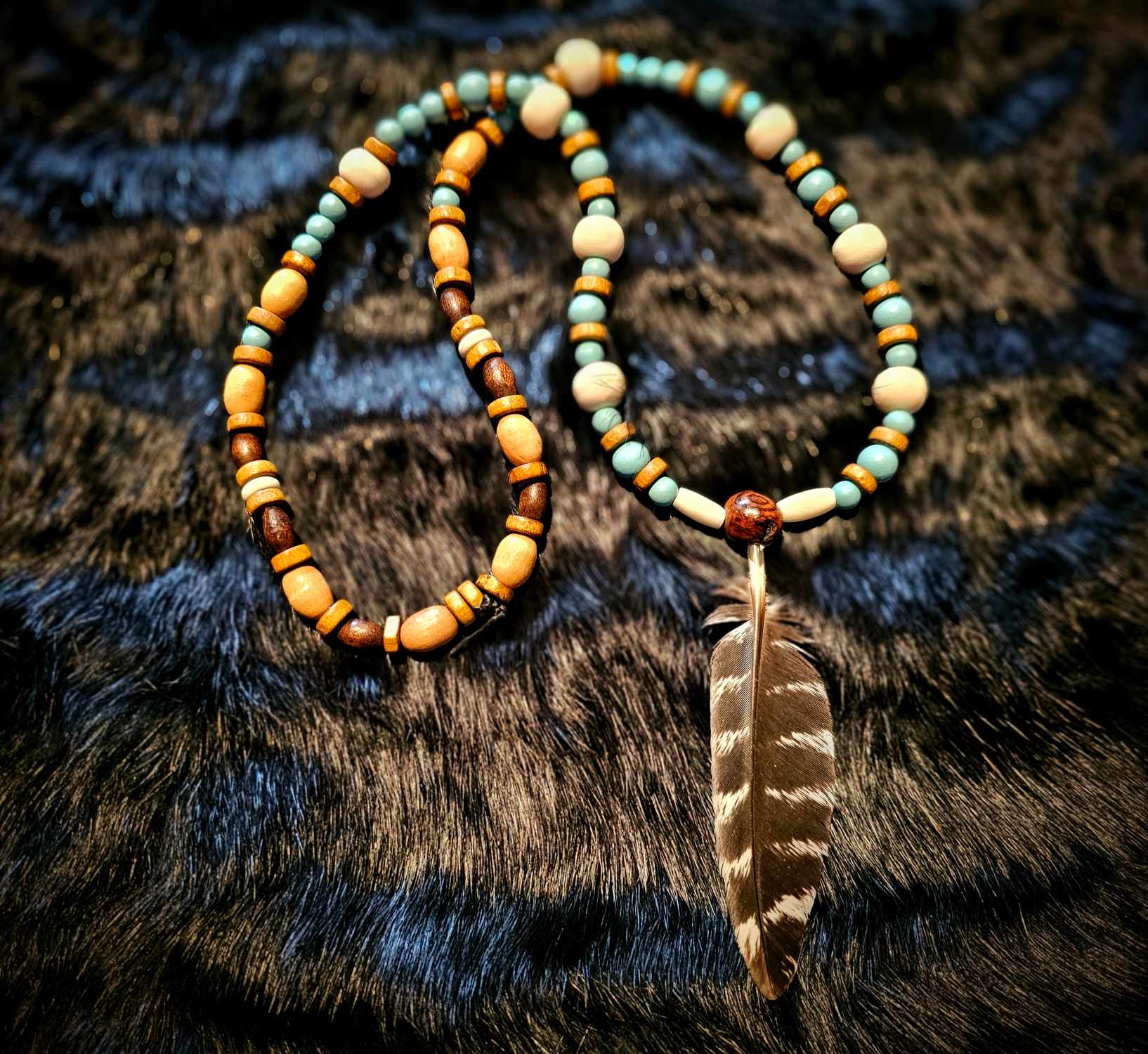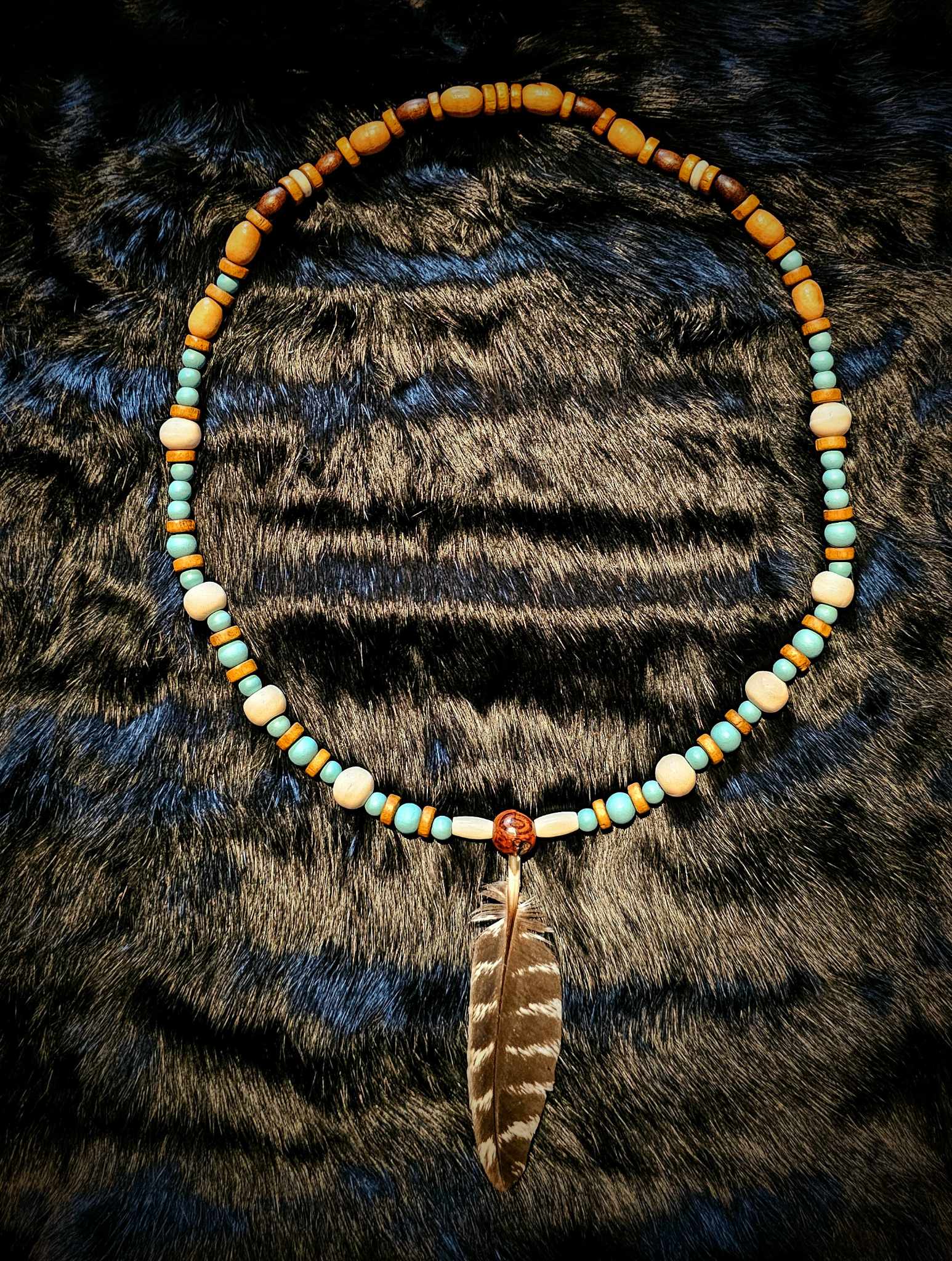 2. Cow bone, turquoise glass, and wood beads with bison bone tube beads with turkey feather pendant.