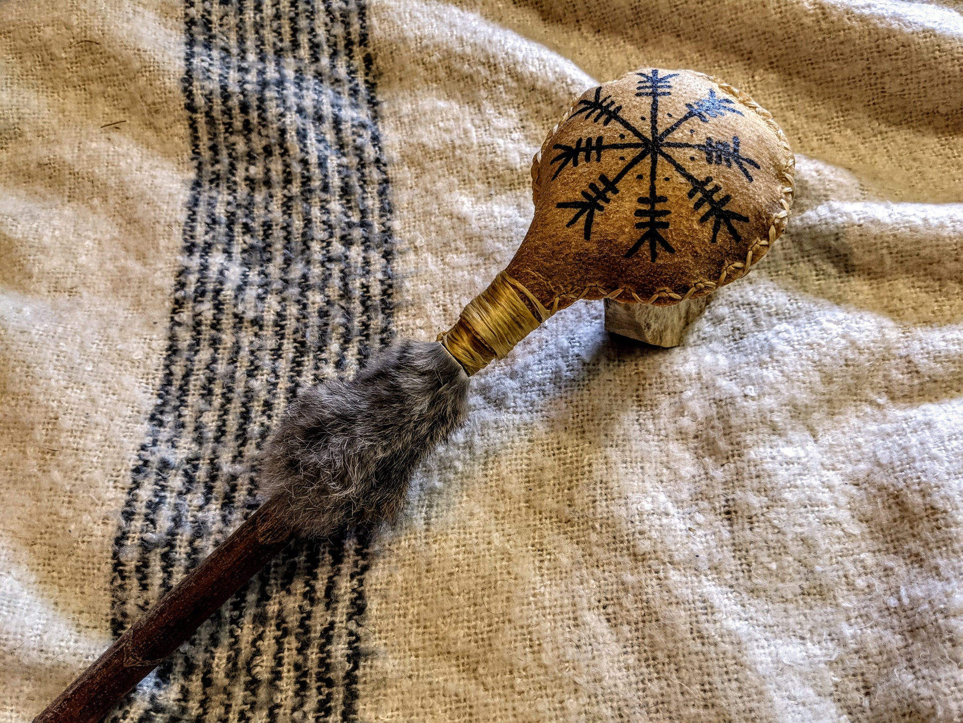 Hand painted shaman rattle, made of moose hide. Alder wood handle wrapped with rabbit fur. Painting depicts artwork of the helm of awe. Filled with wood beads for a strong sound.