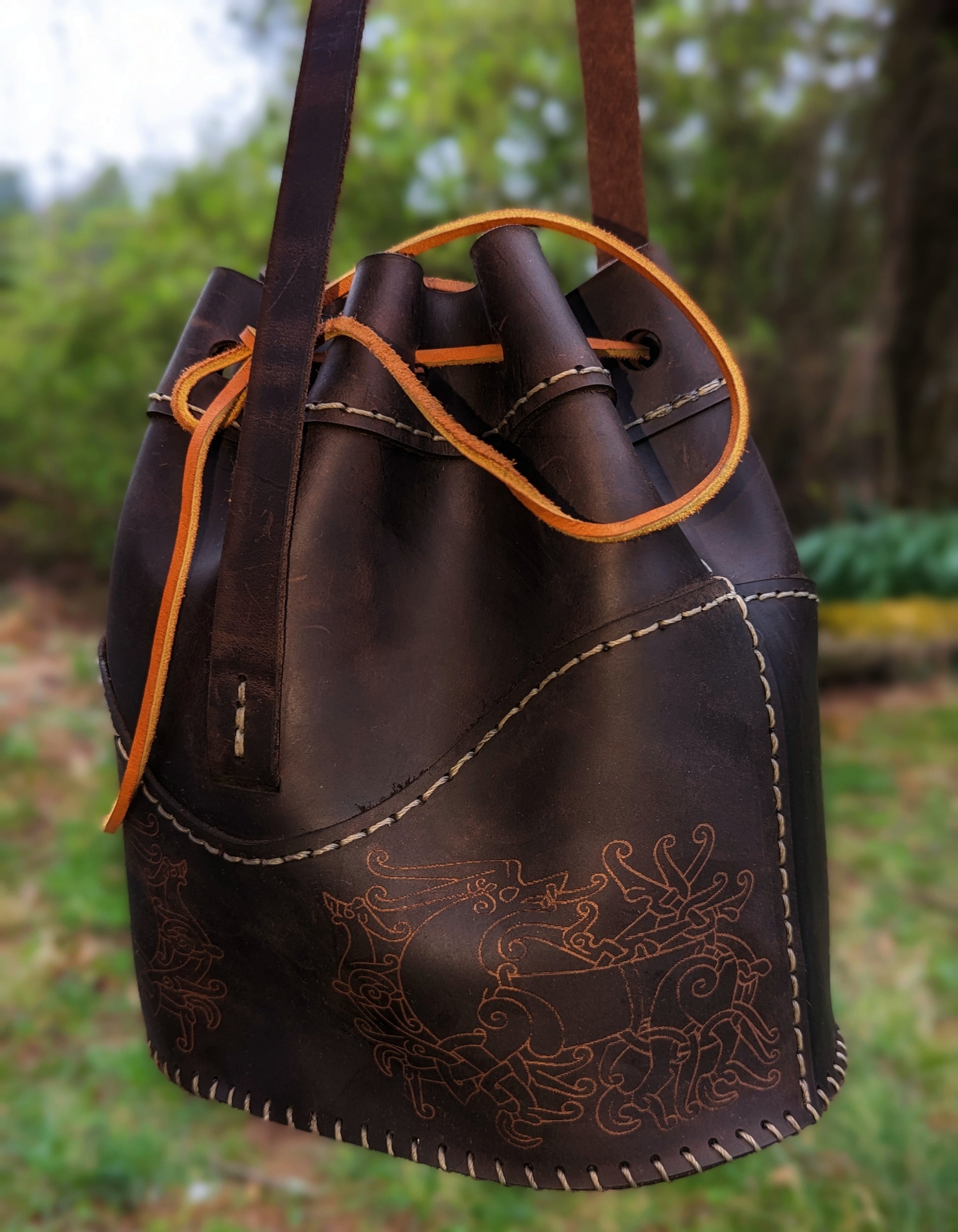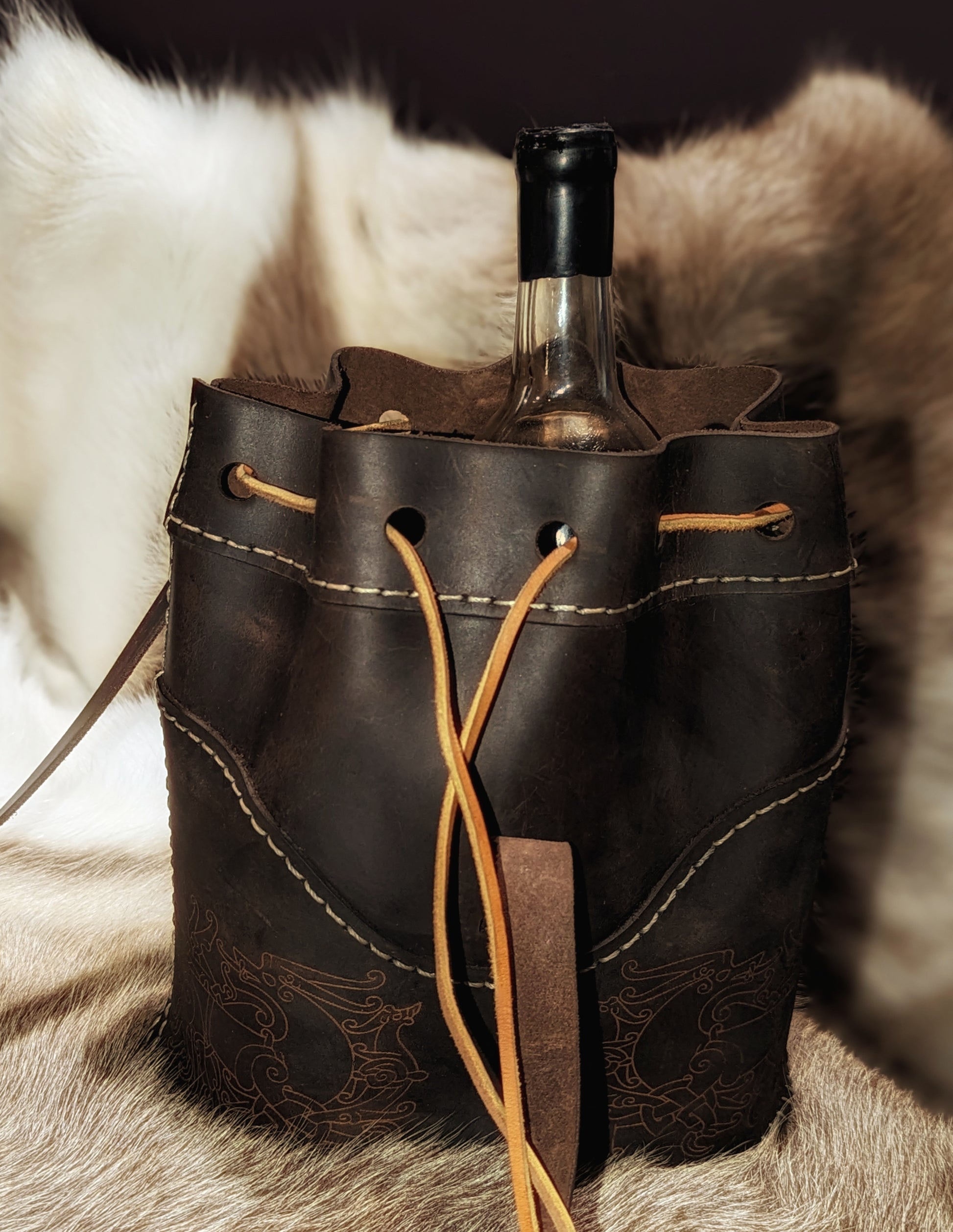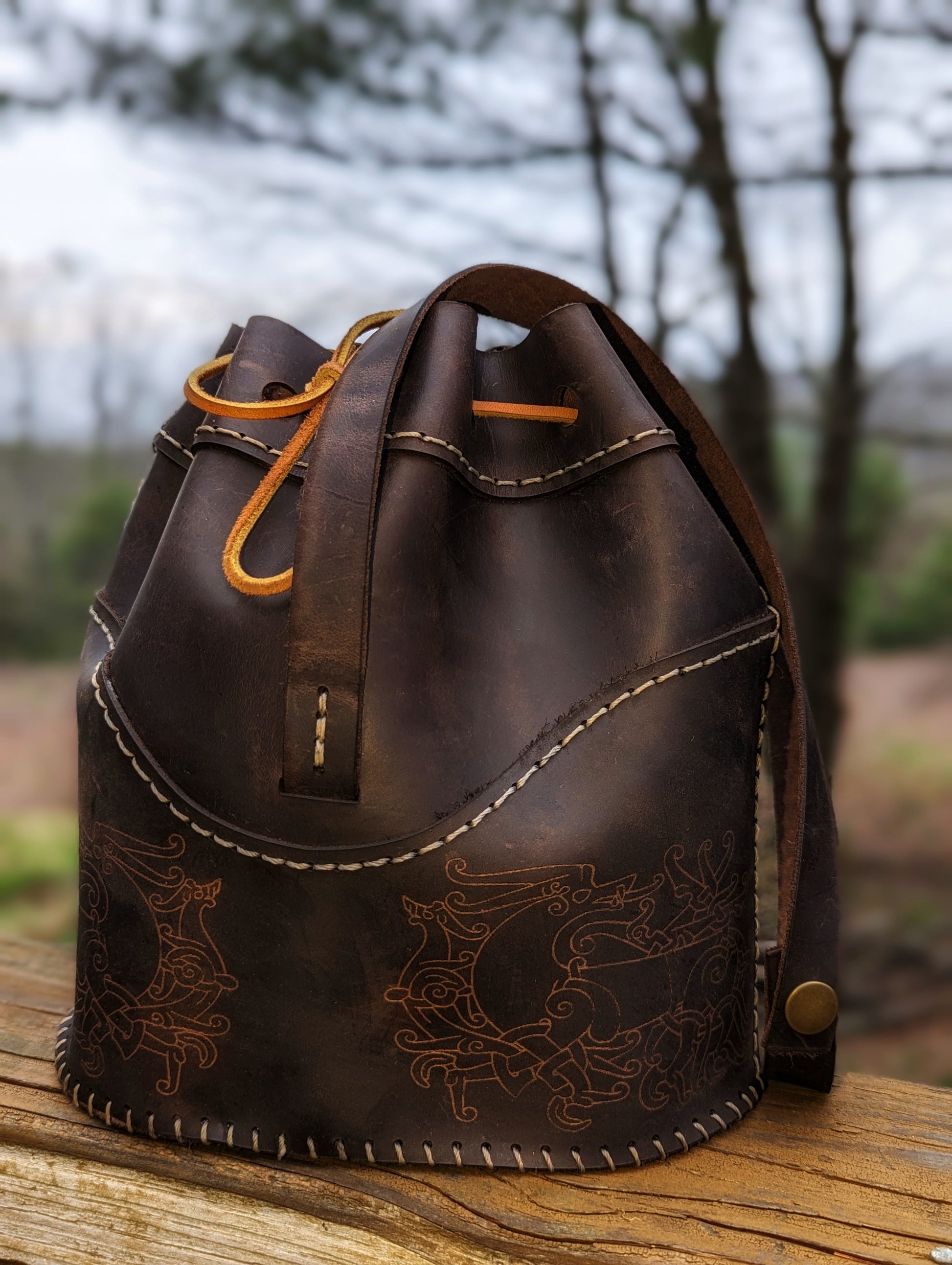 *Will be made to order - please allow up to 14 days* Roomy hand sewn bucket bag, made from durable, high quality oiled leather. It has been engraved with Norse runestone dragons on the front. The handle has a snap to open it to easily hook it onto a belt if desired. The base has been reinforced with leather cement around the bottom seam. Oiled leather loves to age and will evolve over time. It is normal for oiled leather to display superficial scuffs or what can look like scratches. These markings, though intentional, will self-neutralize as the leather flexes and bends with wear. You can also try rubbing them with your finger as your body heat will redistribute the oiled coating of the leather. The bag will soften over time but still hold its shape. Wine bottle inside for scale.