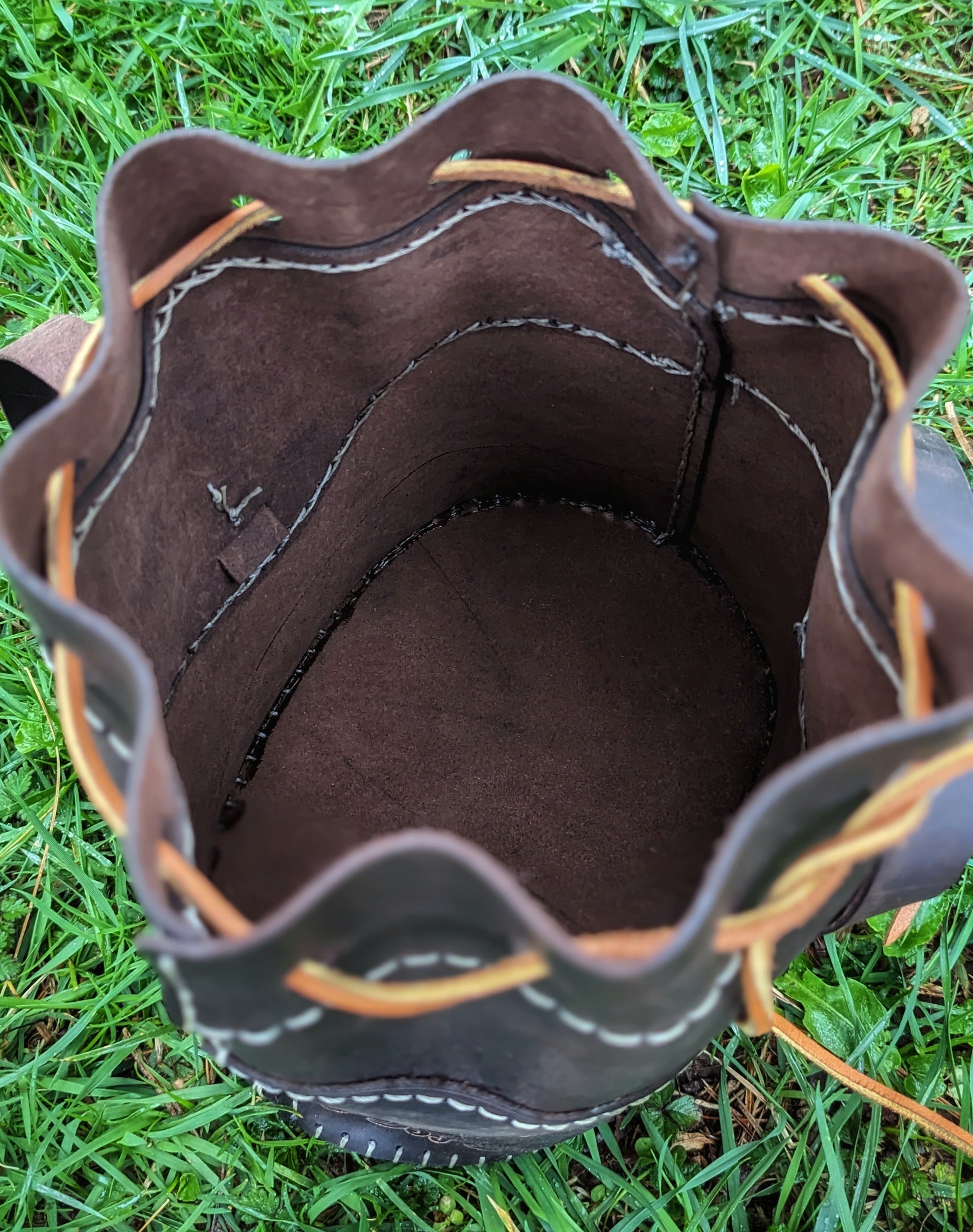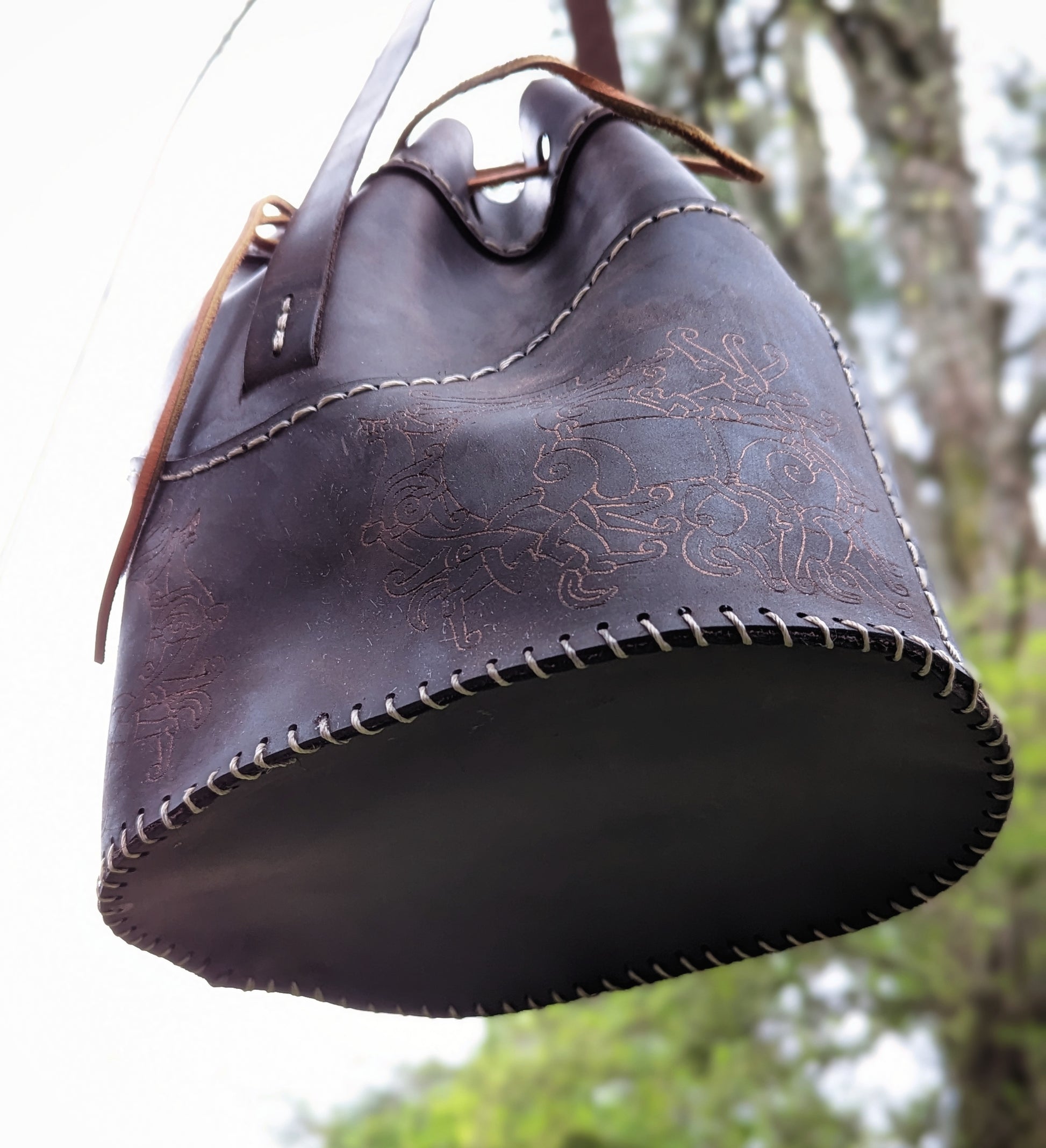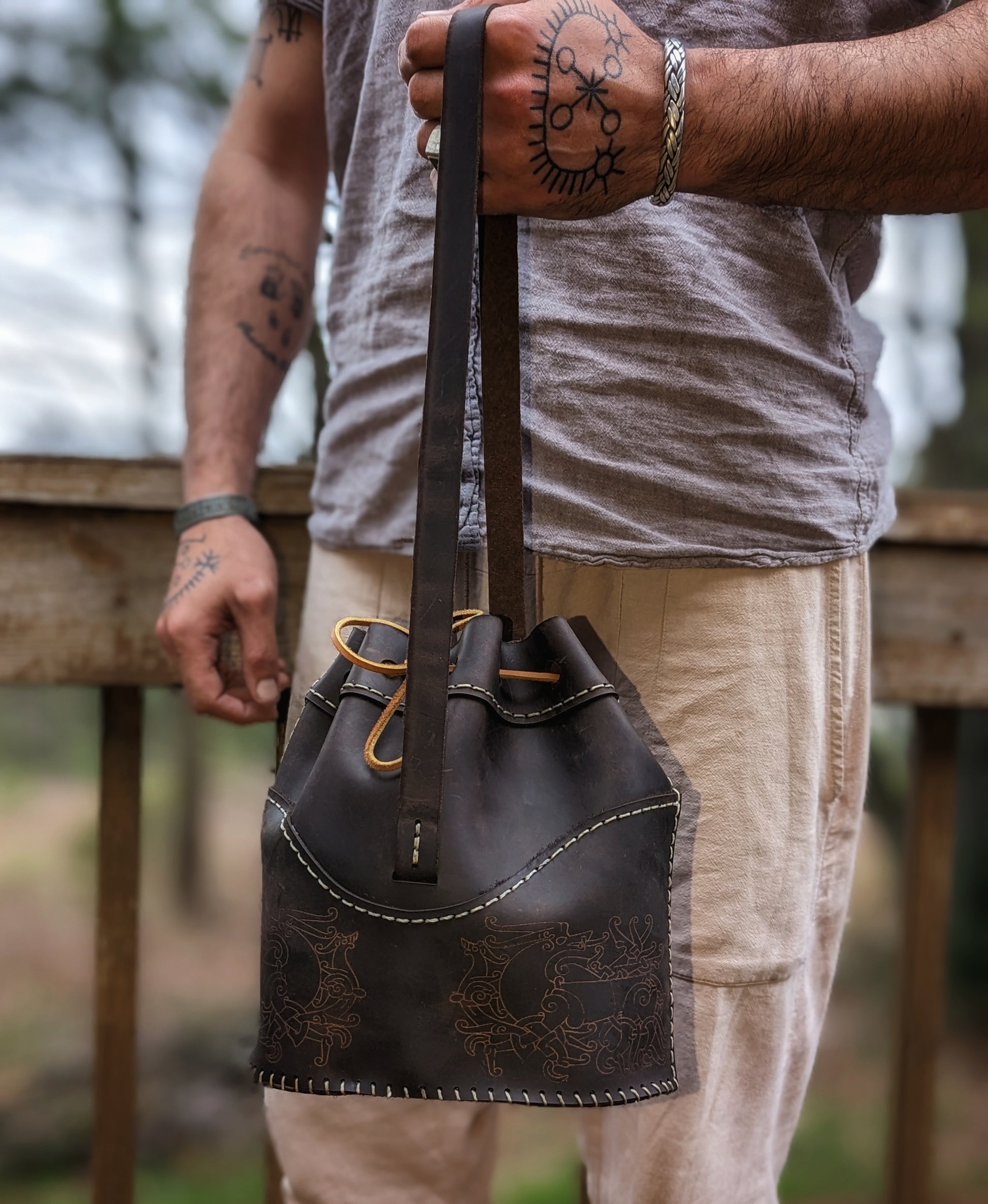 *Will be made to order - please allow up to 14 days* Roomy hand sewn bucket bag, made from durable, high quality oiled leather. It has been engraved with Norse runestone dragons on the front. The handle has a snap to open it to easily hook it onto a belt if desired. The base has been reinforced with leather cement around the bottom seam. Oiled leather loves to age and will evolve over time. It is normal for oiled leather to display superficial scuffs or what can look like scratches. These markings, though intentional, will self-neutralize as the leather flexes and bends with wear. You can also try rubbing them with your finger as your body heat will redistribute the oiled coating of the leather. The bag will soften over time but still hold its shape. Wine bottle inside for scale.