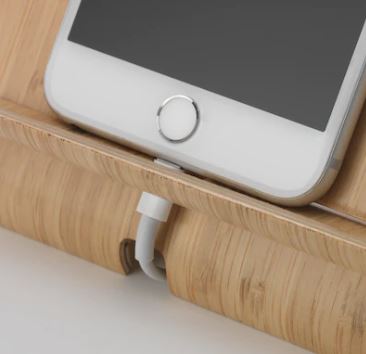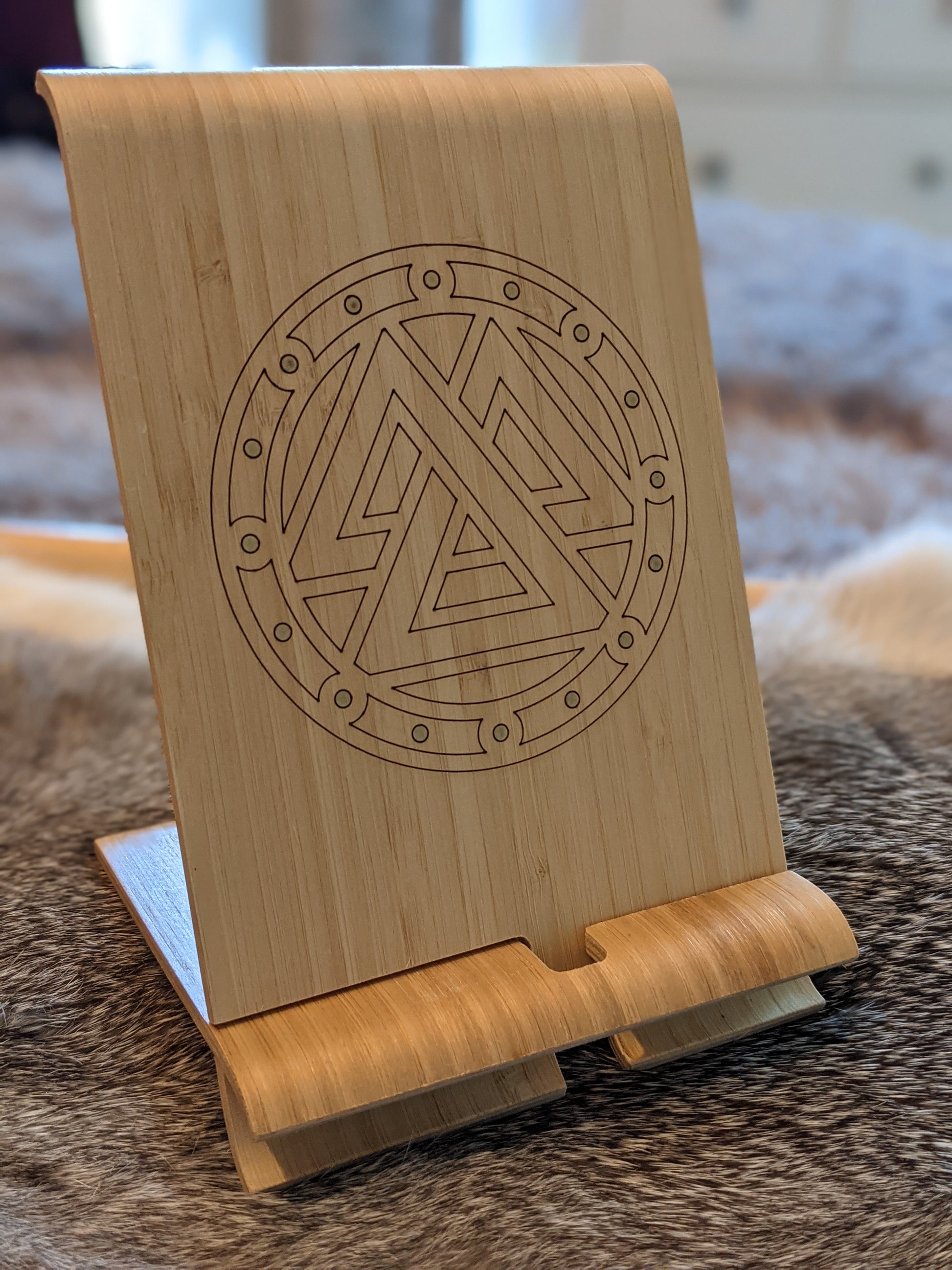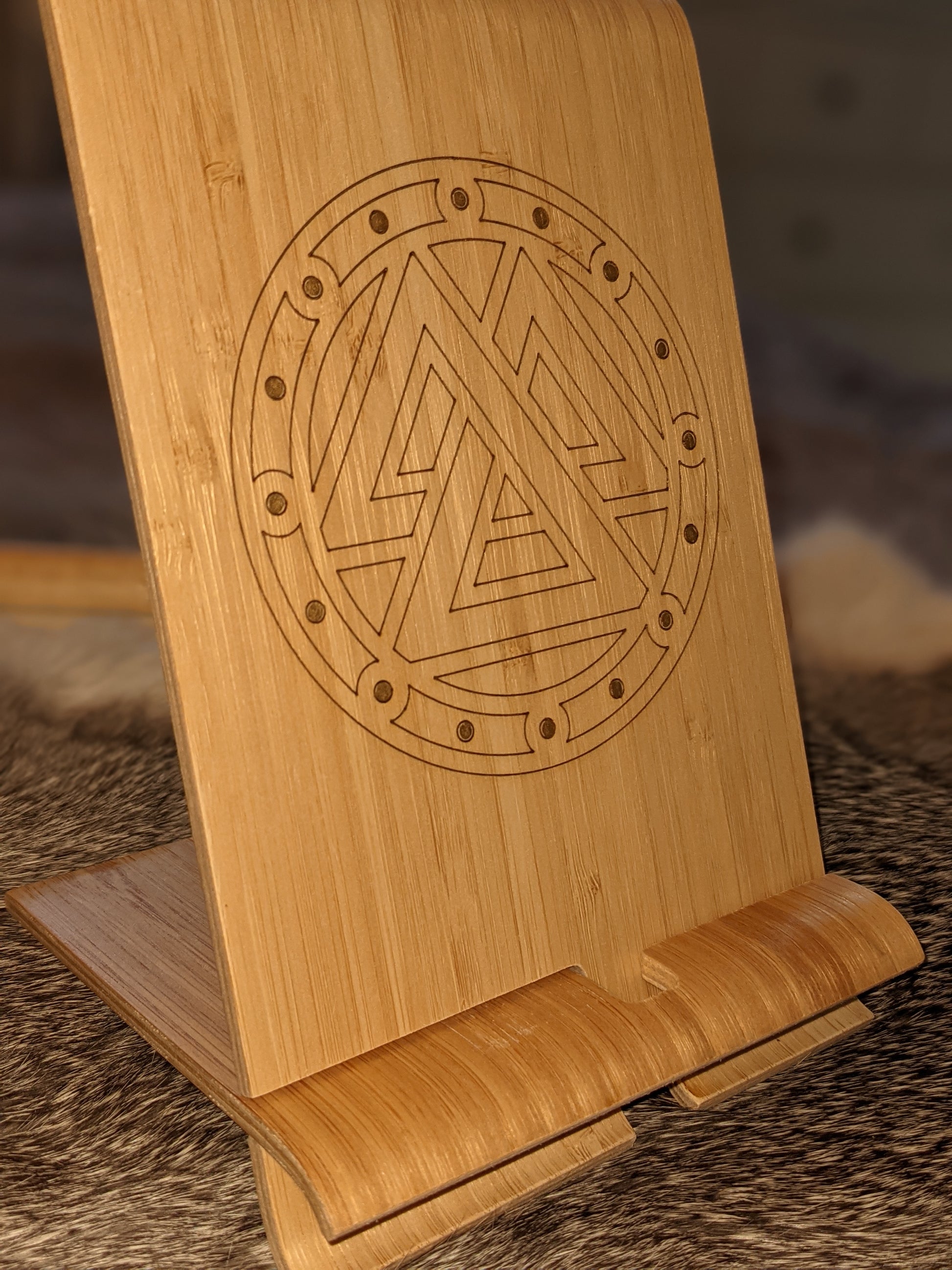Engraved wood phone stand, with slot for charging cable. Gold painted accents in Valknut shield.