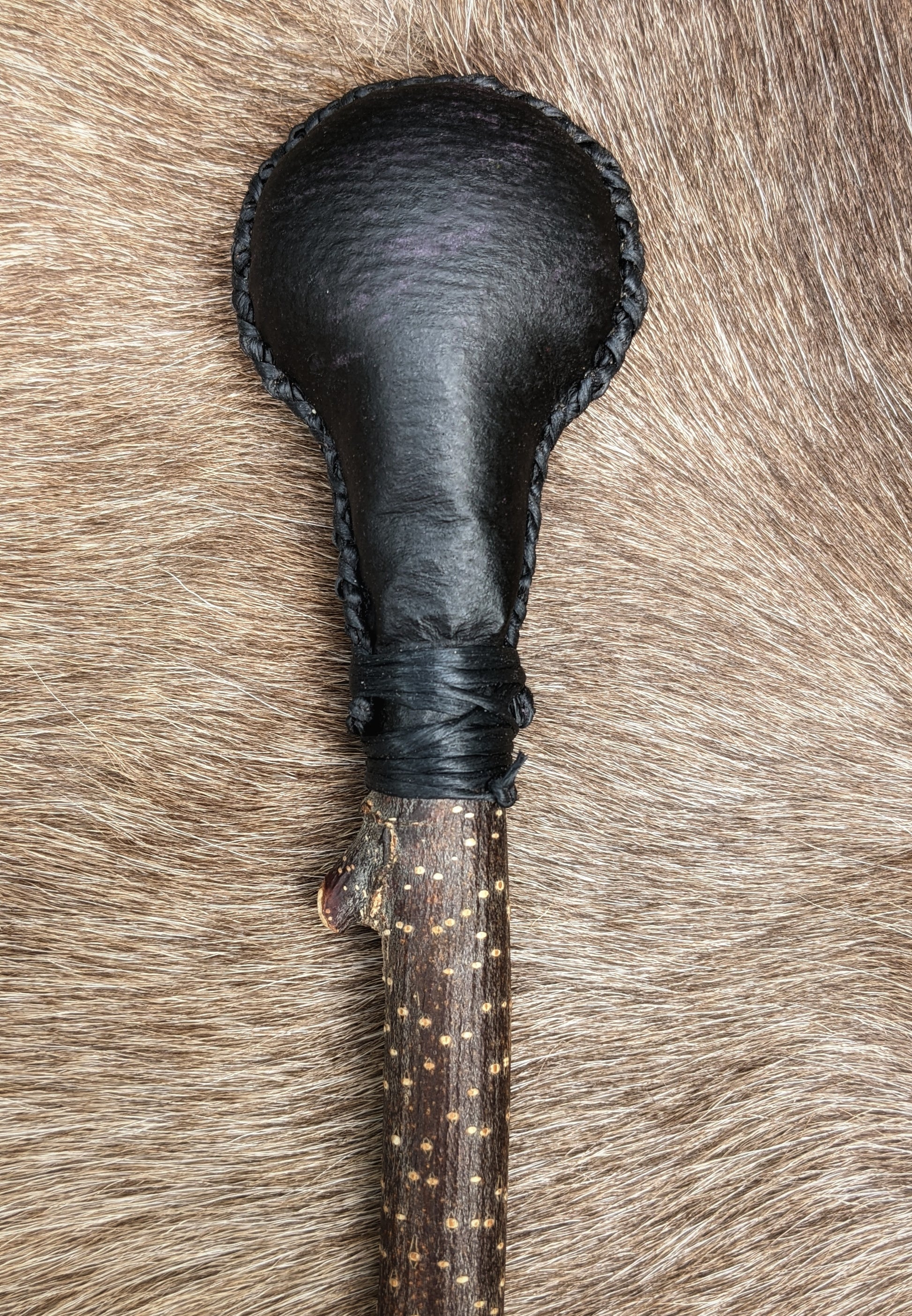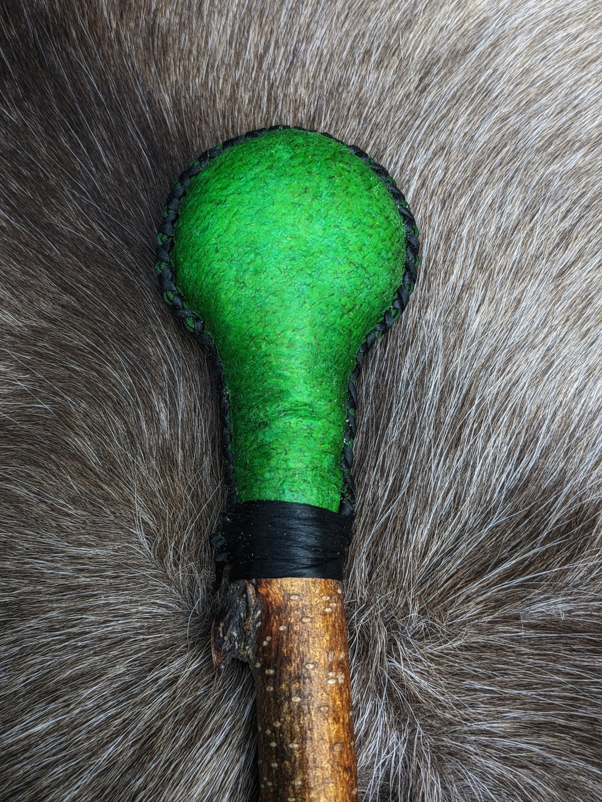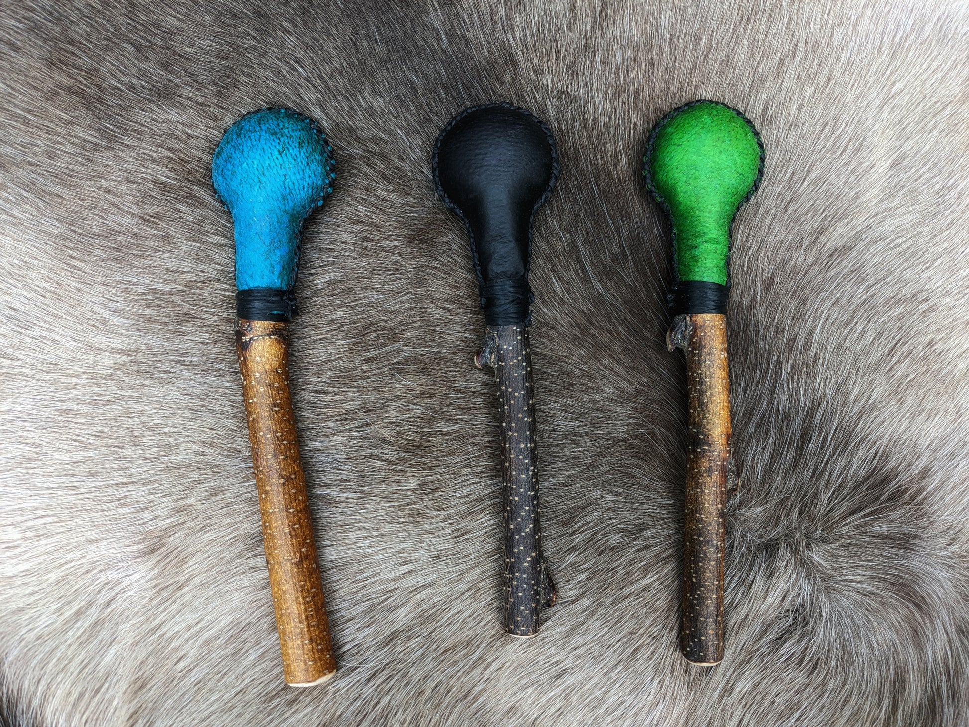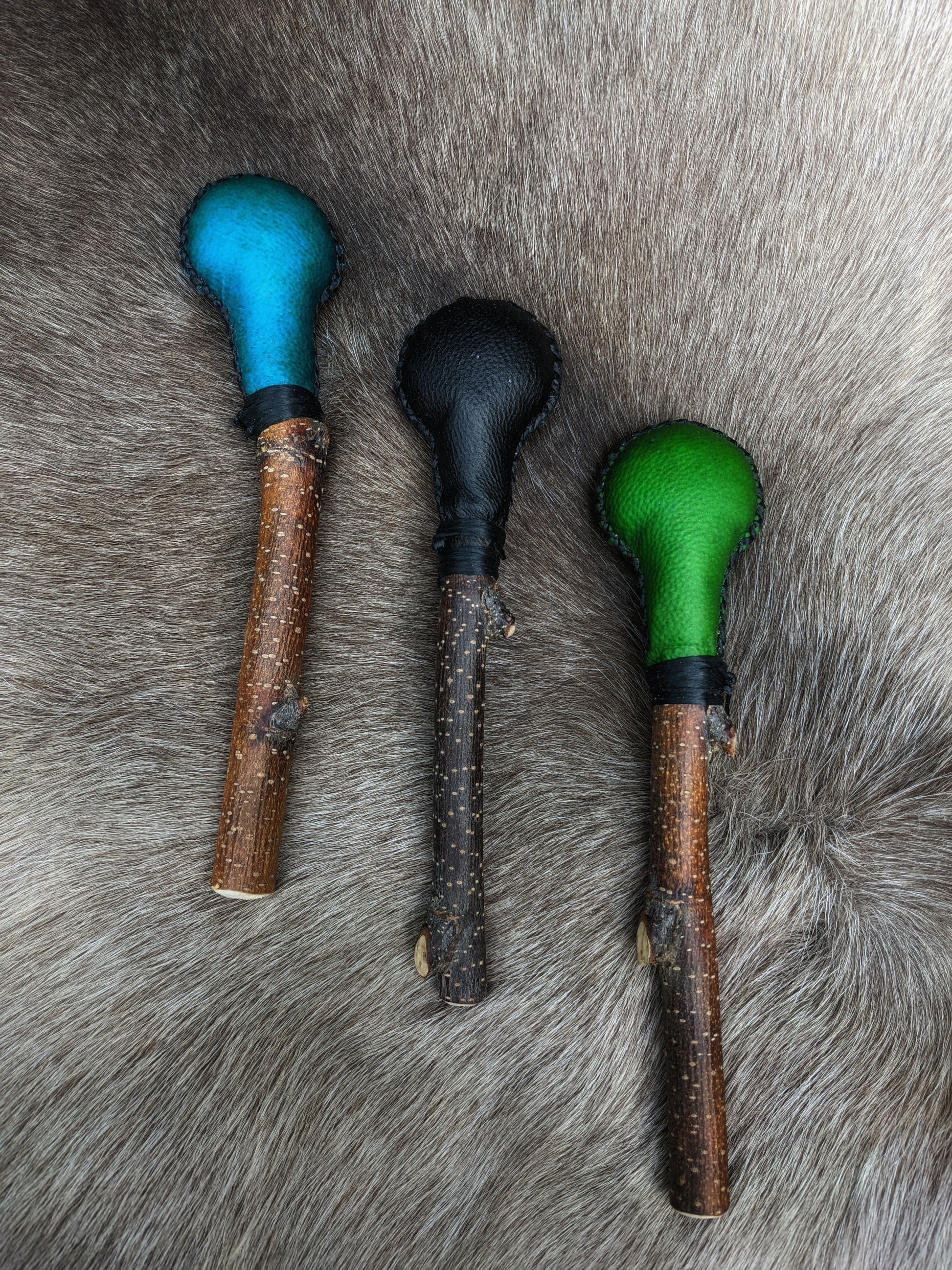 Bear skin head, dyed in choice of color, sewn with black sinew and filled with buckwheat for a crisp sound - small size with a big sound. Top of head to bottom of wood measures approx 8" long. Blue and green have alder branch handles, black has birch wood handle.