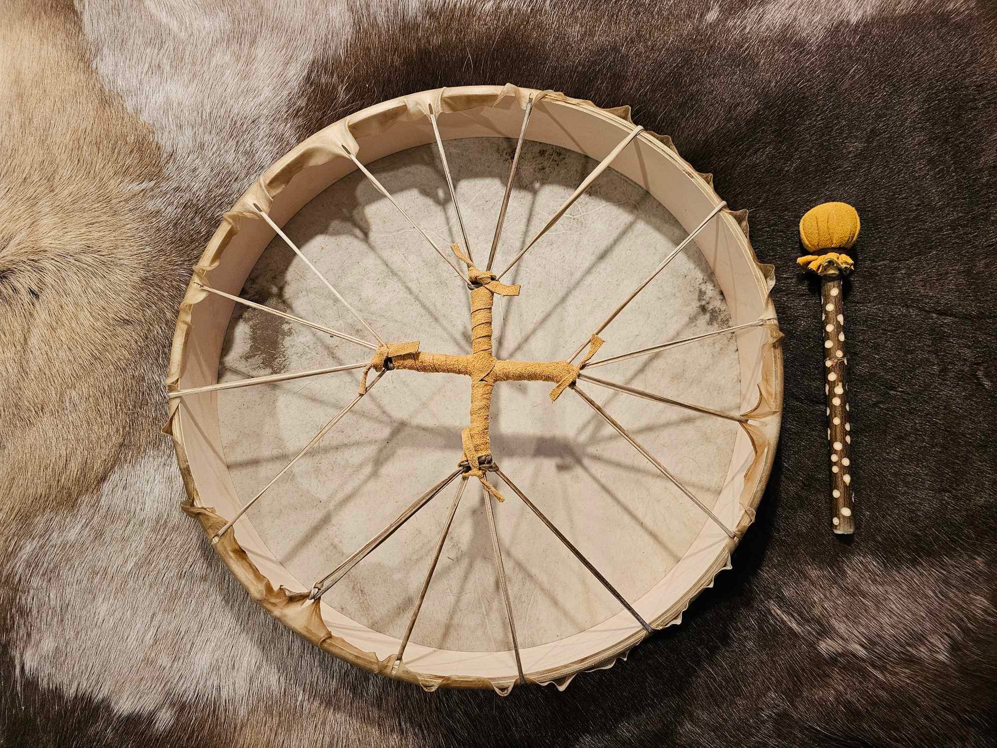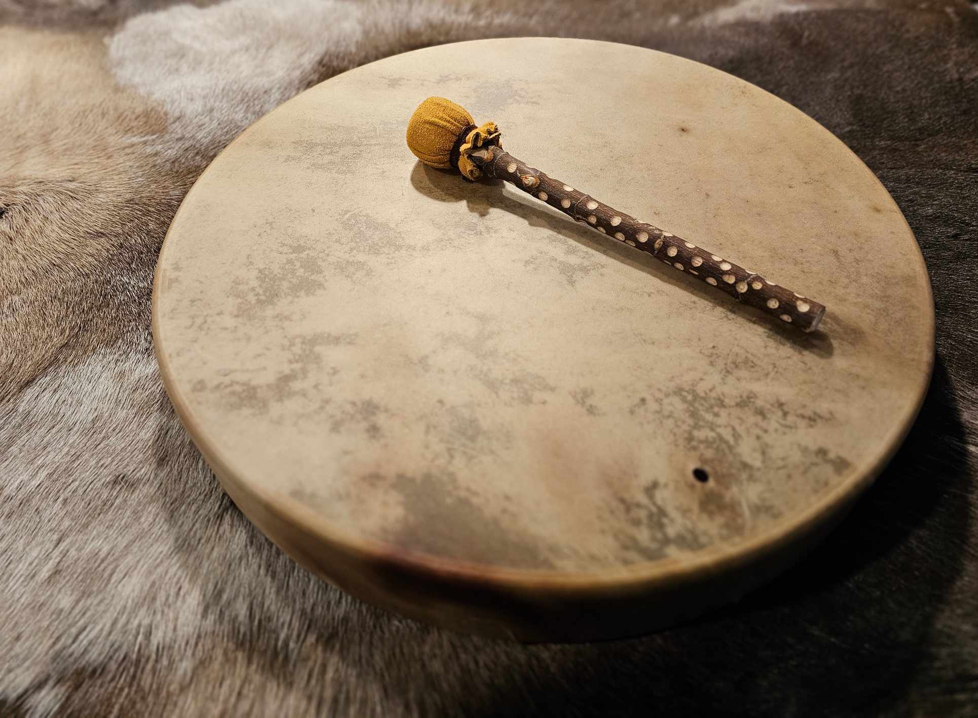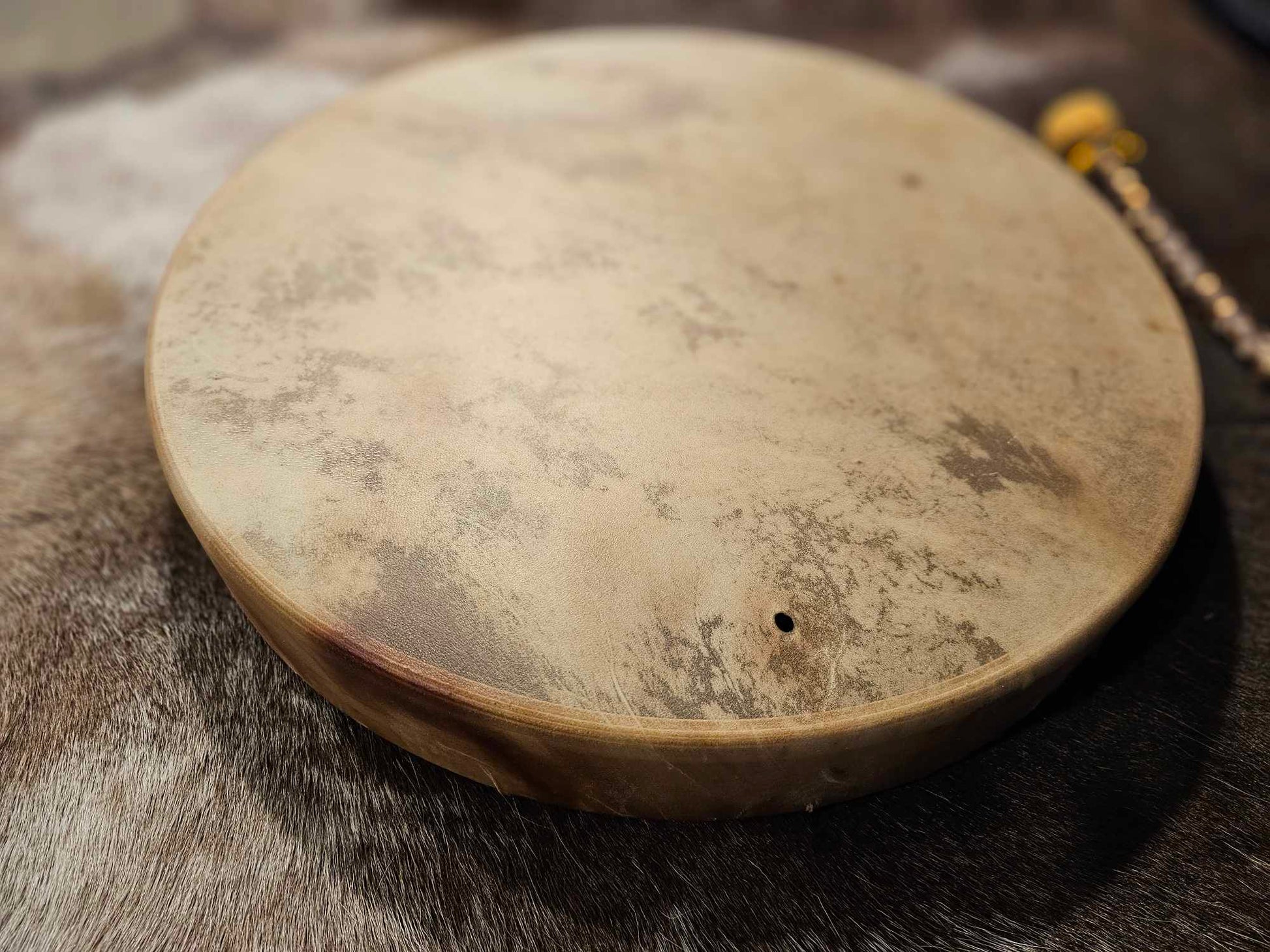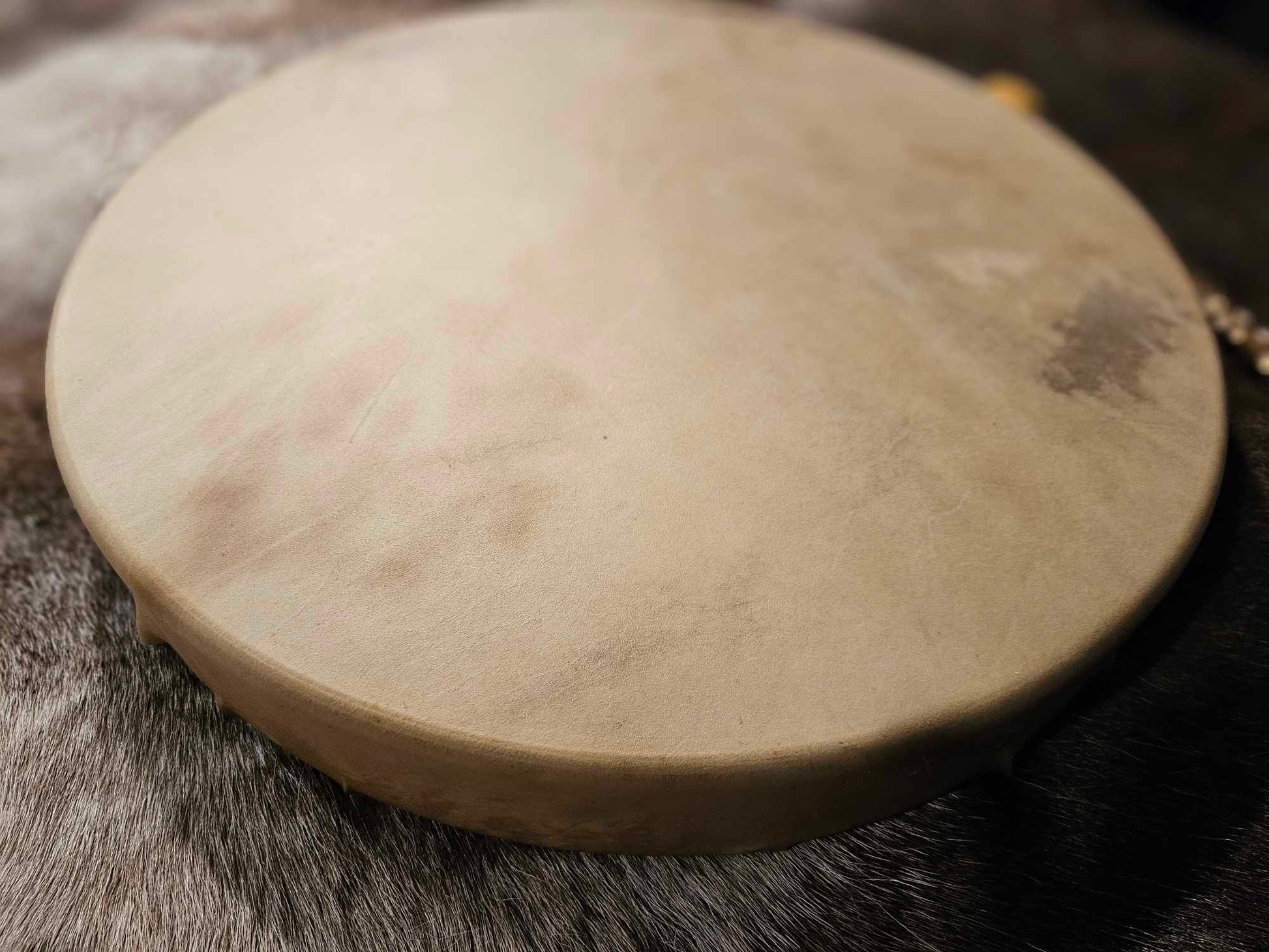 European Red Stag / Hart hide 20" drums. Choose one of two unique hides, left natural to exalt the beauty of nature, but can be painted by you in the desired way. Frames are maple and beaters are carved alder wood with buckskin heads. These drums are made from the skin of a wild animal and thus there will be flaws, imperfections, or scarring, while remaining perfect for drum heads made in the traditional way. There is a small hole (pictured) in one of the heads that does not at all harm the sound or function of the drum.